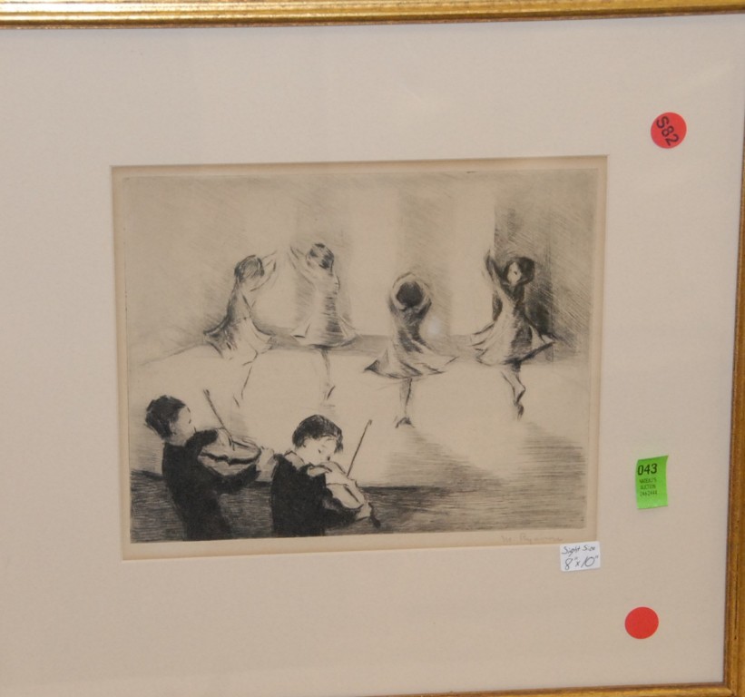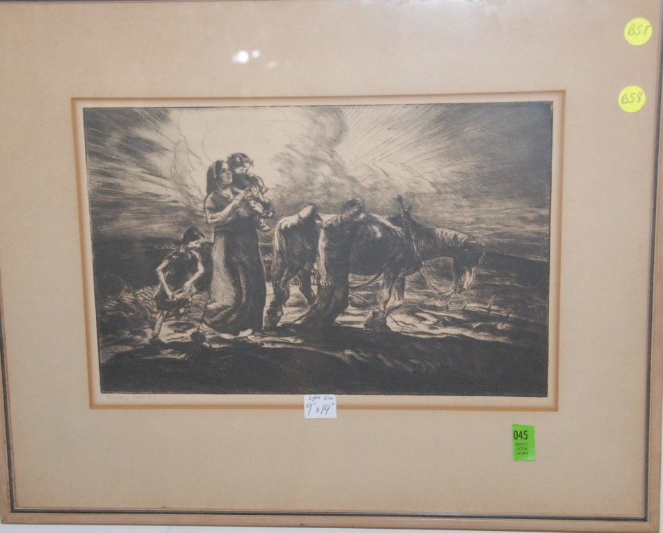 Five piece lot: J. S. Costigan etching of pheasants with work horse Going Home pencil signed, horses pencil signed Romono, print of The Bombardment of Island #10 In The Mississippi River and two other prints.