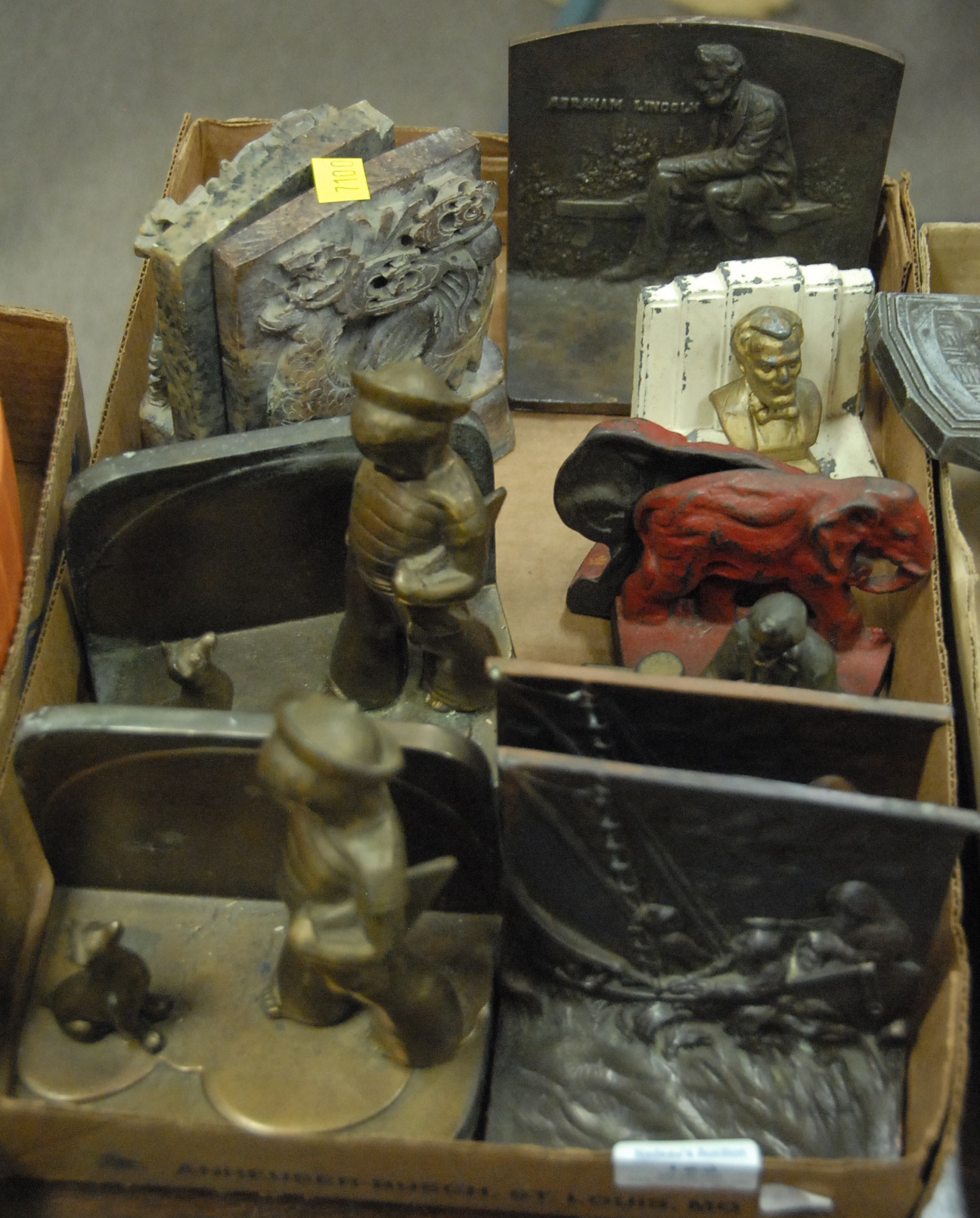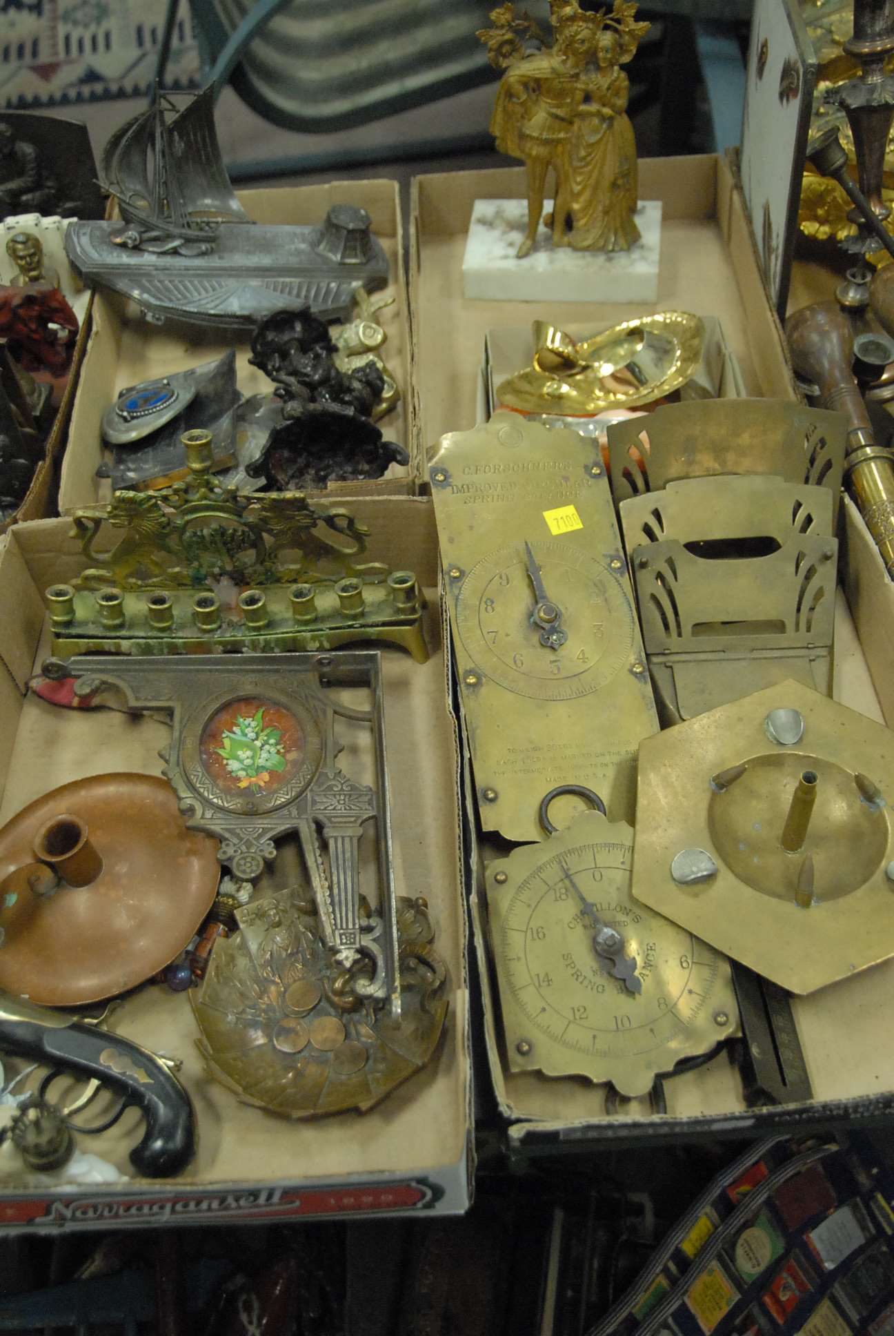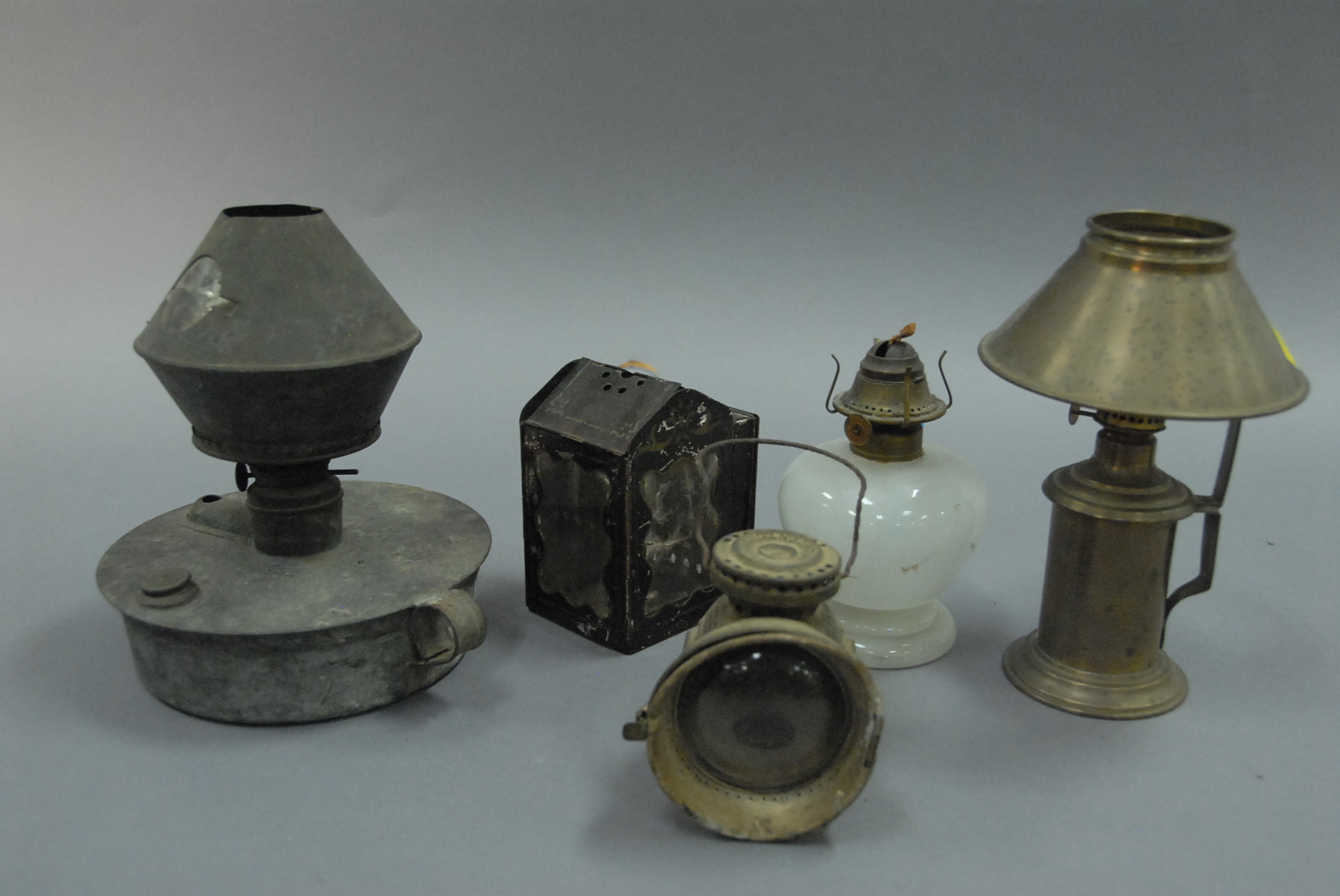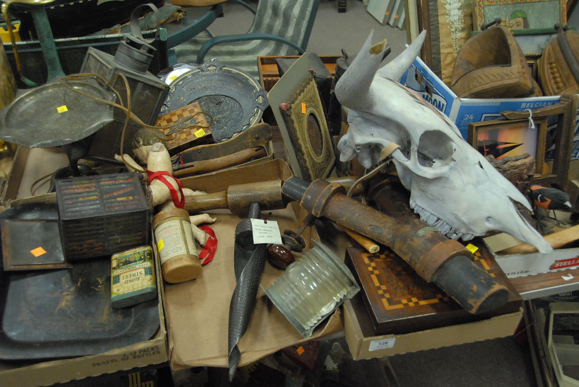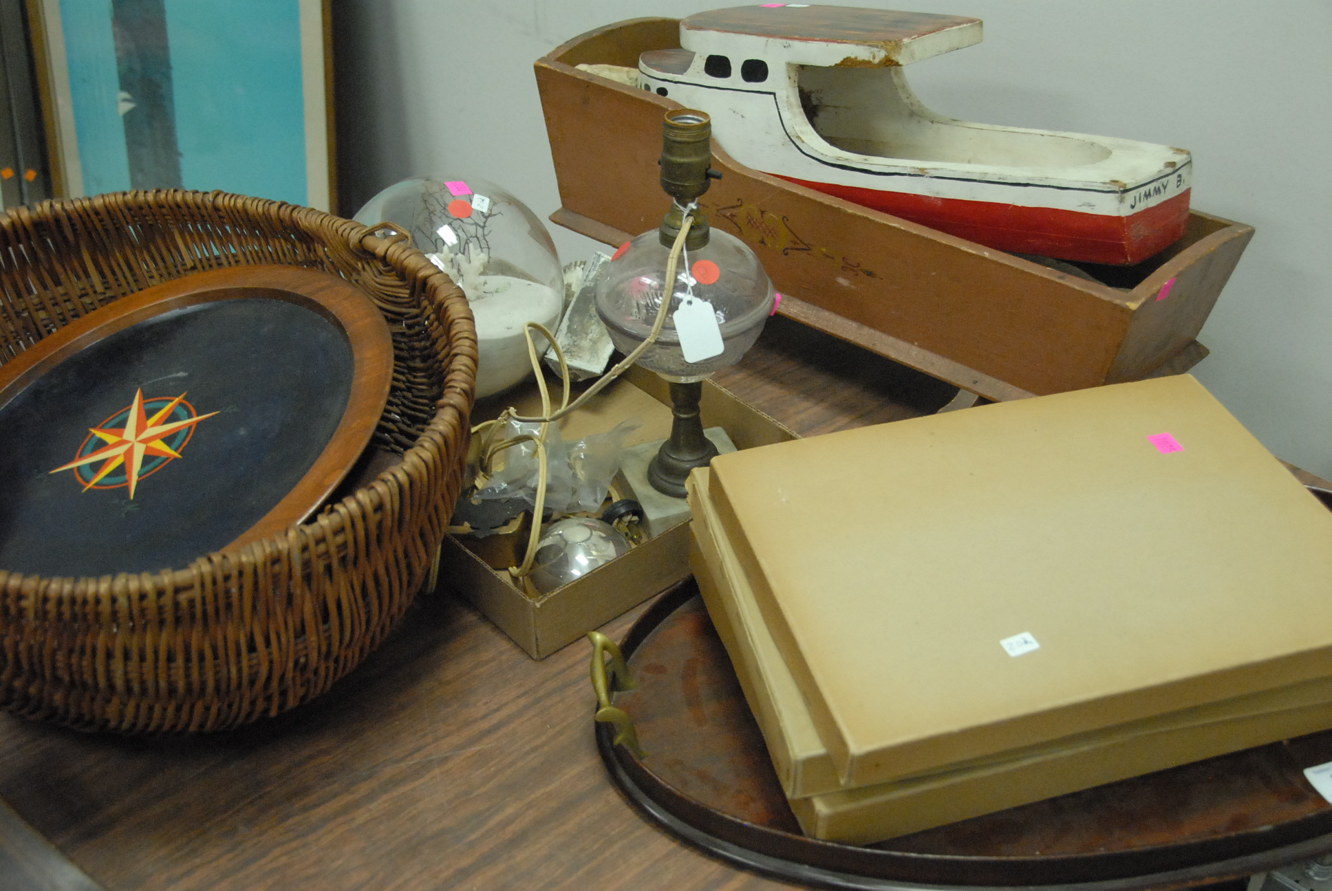 Lot to include three Italian painting books, glass ball with sand and shell etc., whale oil lamp, brass hook, tole match holder, mahogany tray, oval basket, two piece lot to include primitive doll cradle with original paint lg. 23 1/2in., and primitive boat model lg. 20 1/2in. wd. 6 1/2in.