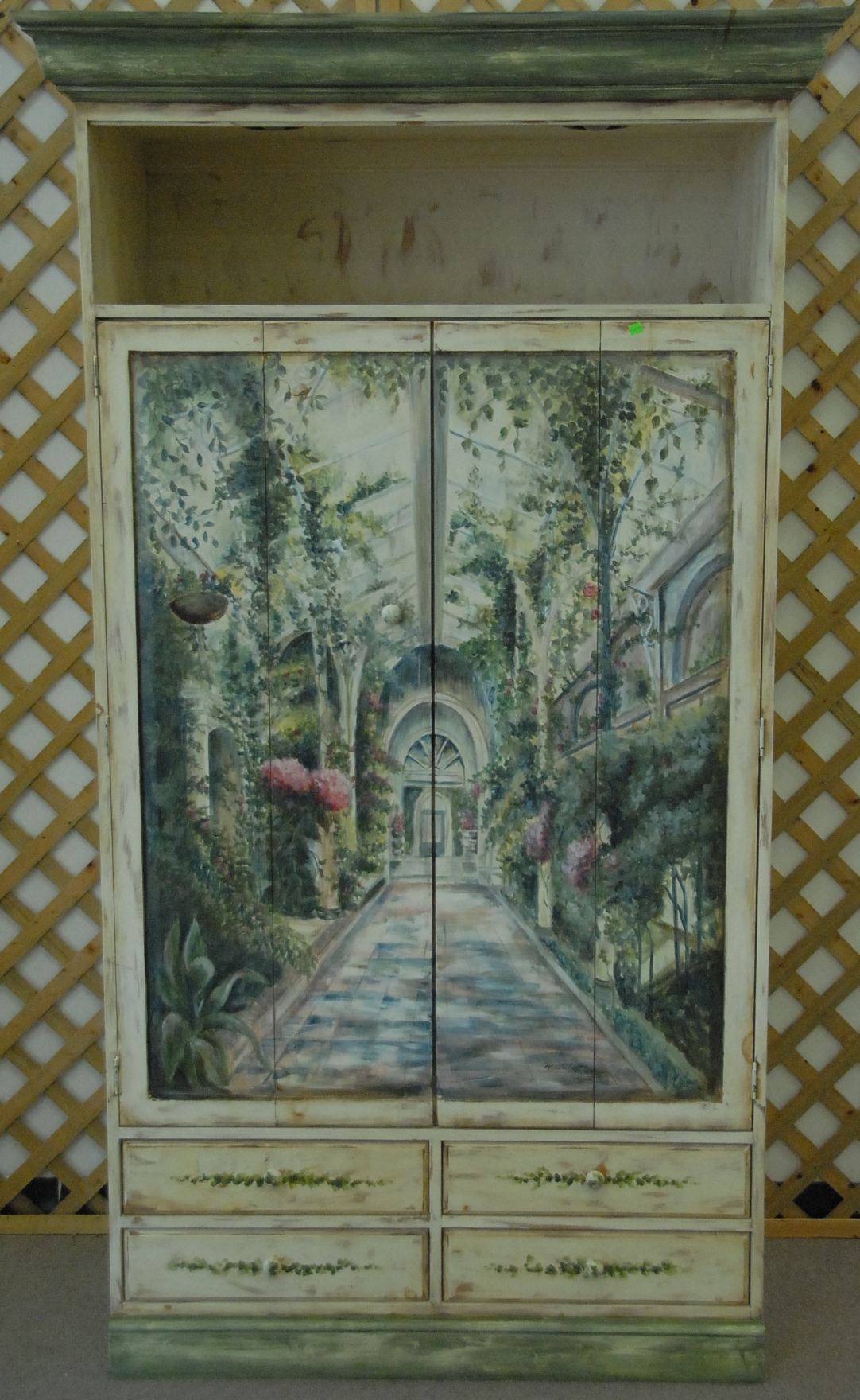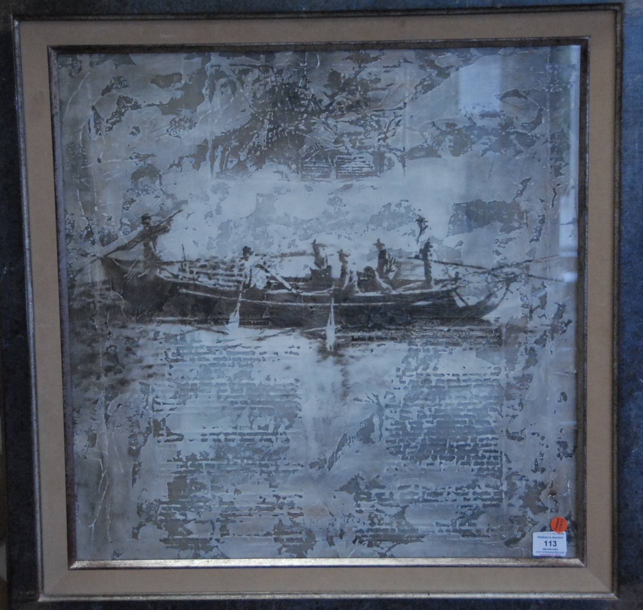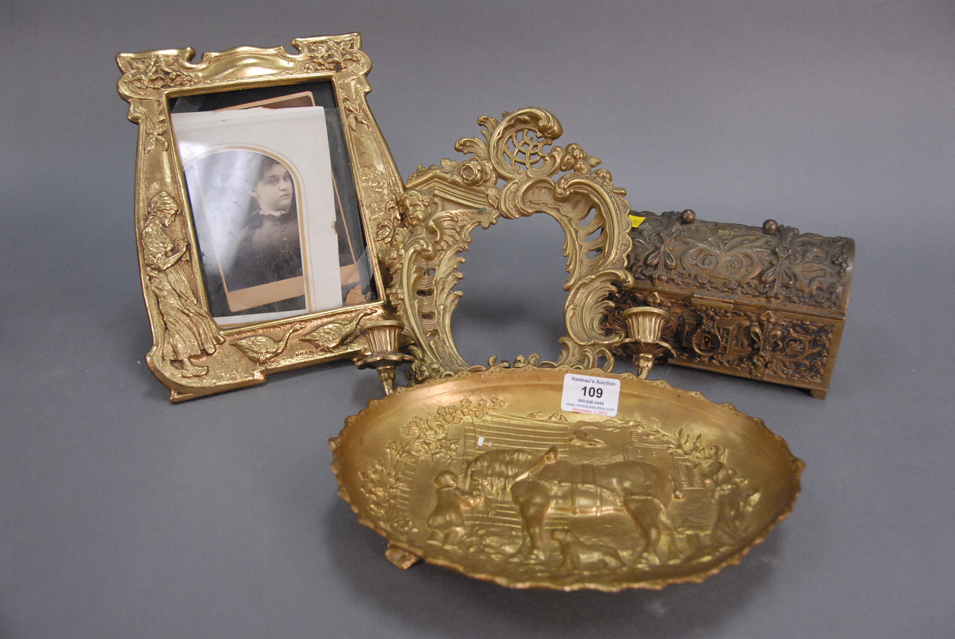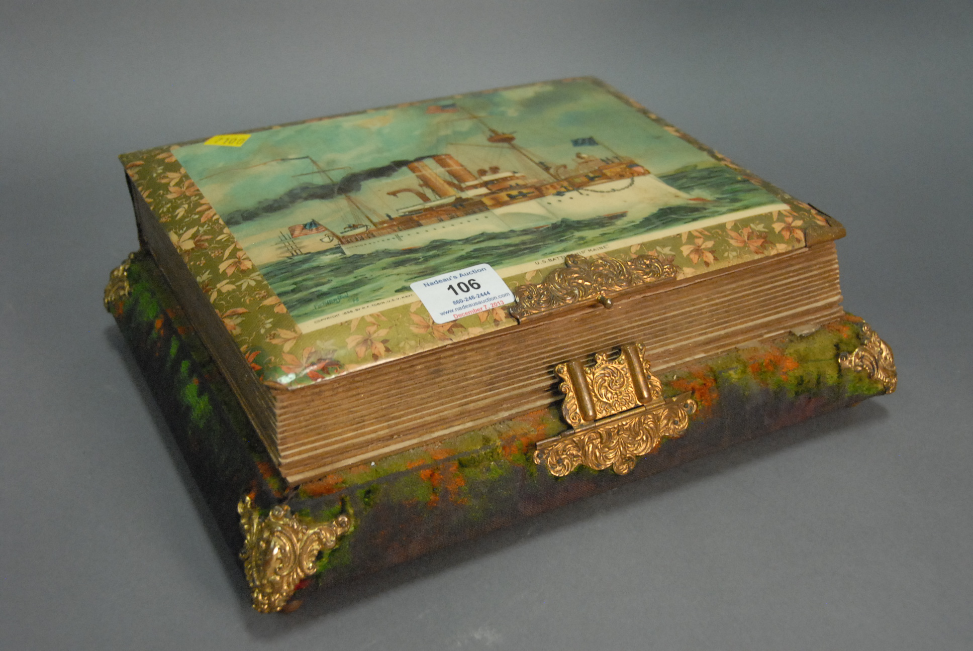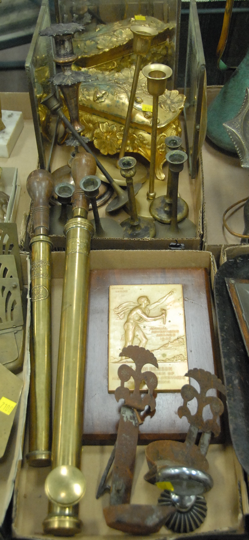 Lot to include three Italian painting books, glass ball with sand and shell etc., whale oil lamp, brass hook, tole match holder, mahogany tray, oval basket, two piece lot to include primitive doll cradle with original paint lg. 23 1/2in., and primitive boat model lg. 20 1/2in. wd. 6 1/2in.