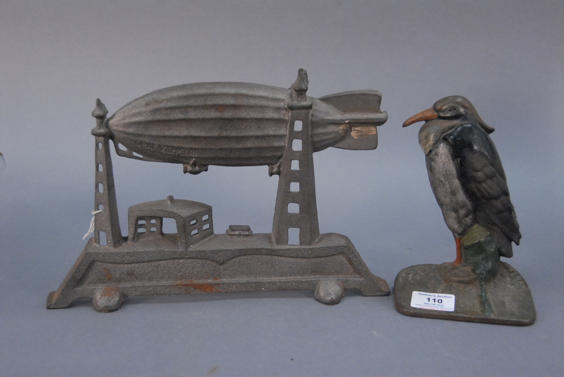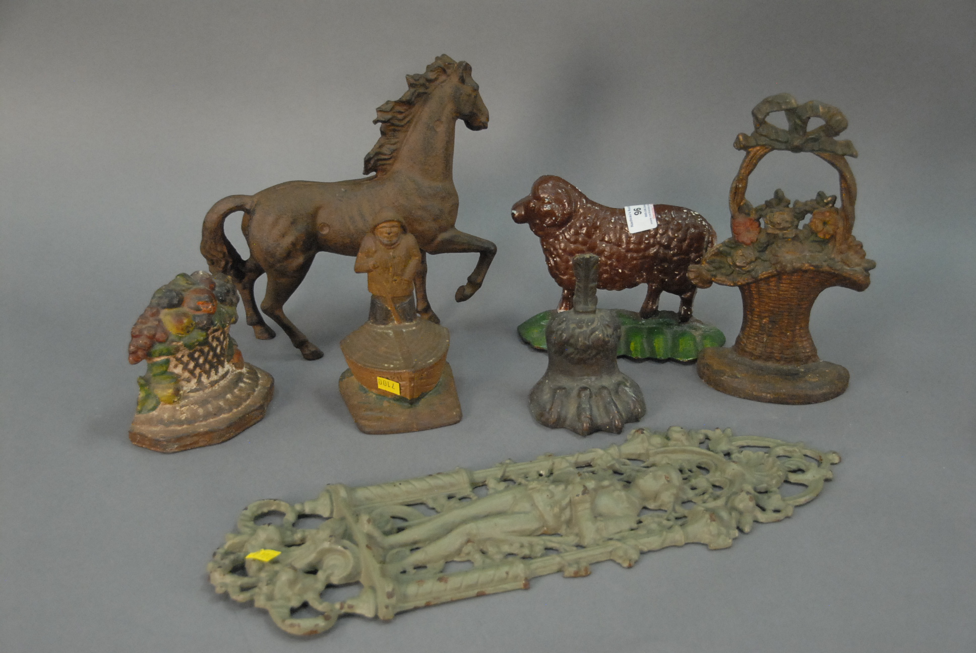 Group of seven iron pieces to include Iron Captain doorstop, two flower door stops, sheep door stop, claw door stop, iron horse, and Victorian iron wall piece.