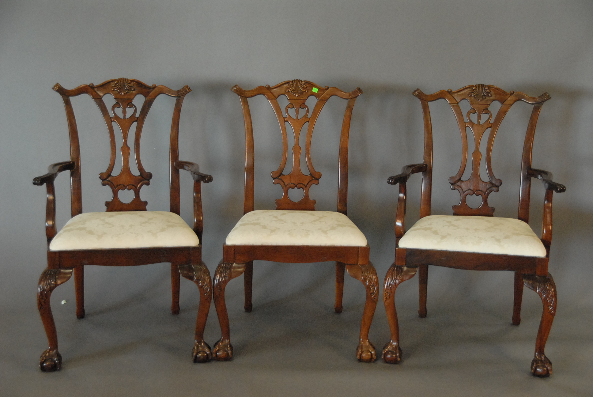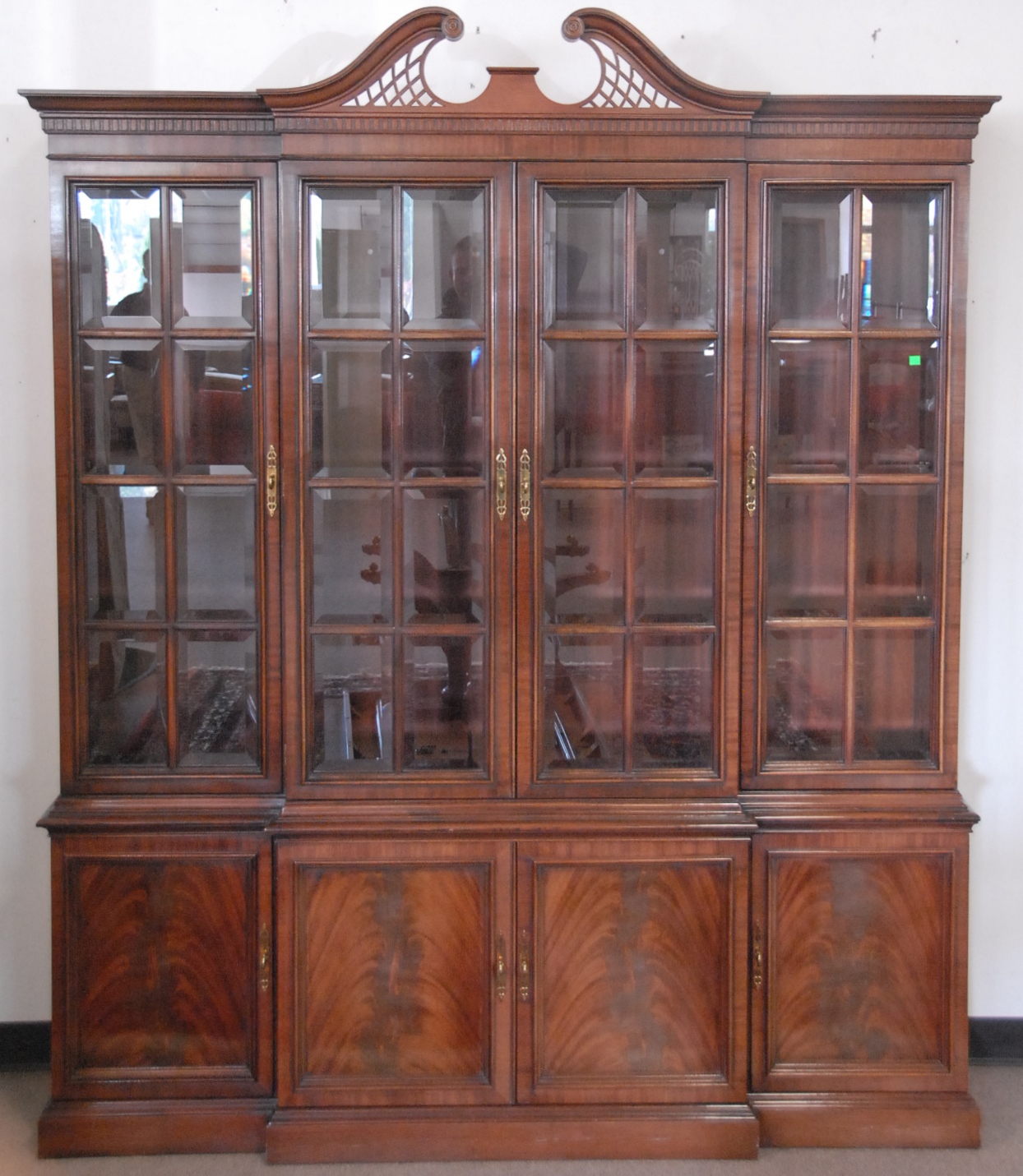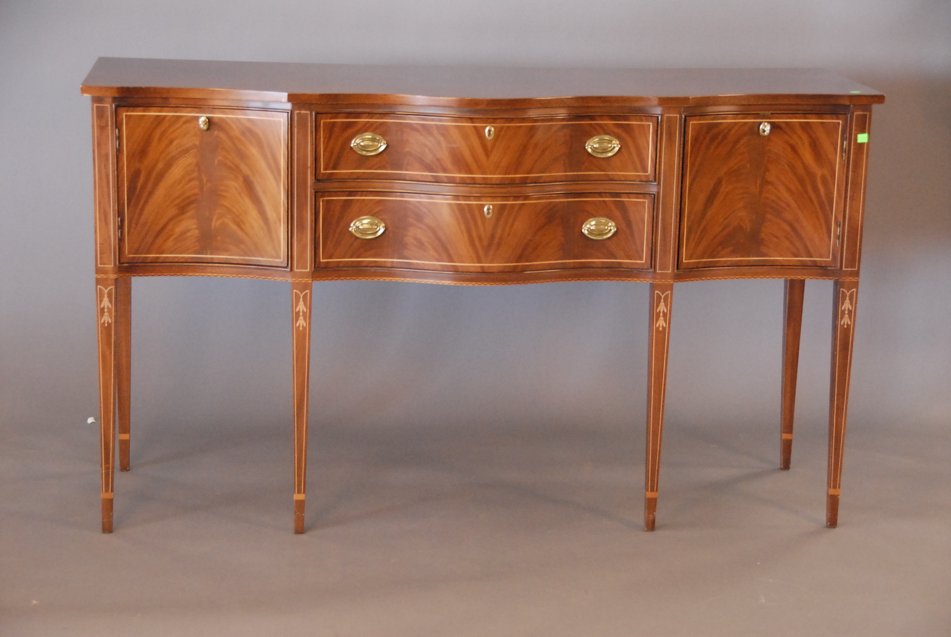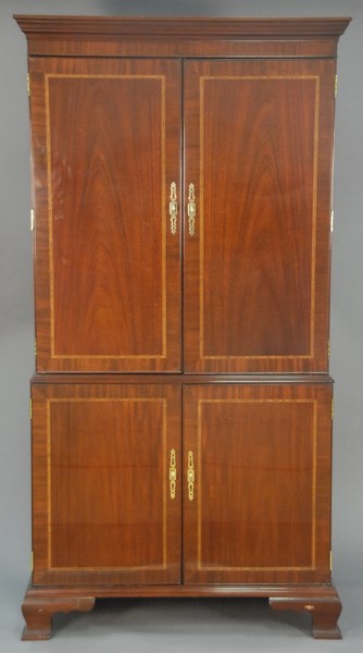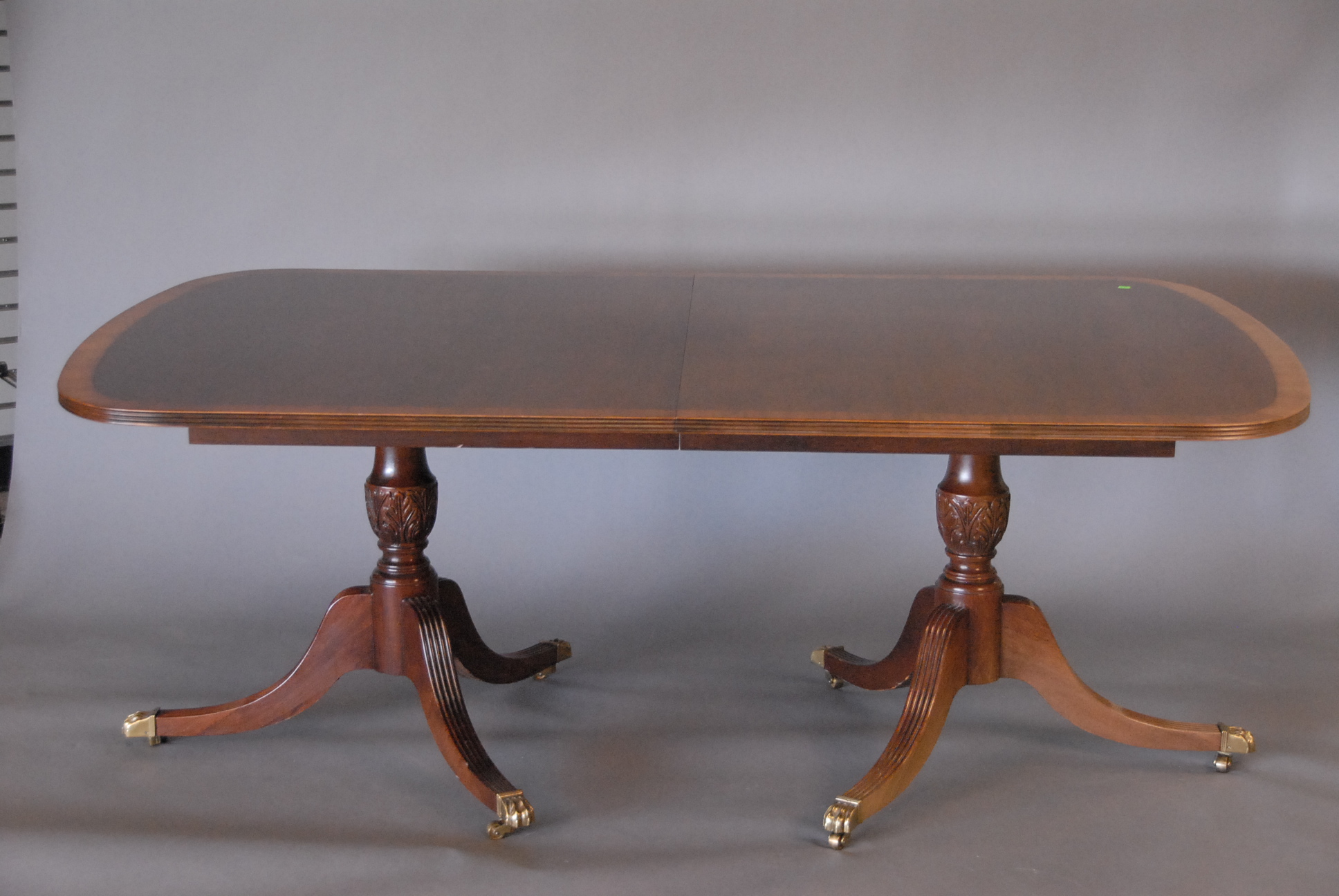 Hickory double pedestal mahogany dining table with banded inlaid top along with three leaves and custom pads ht. 28 1/2in. wd. 46in., closed wd. 76in. with three 20in. leaves, opens to 136in.