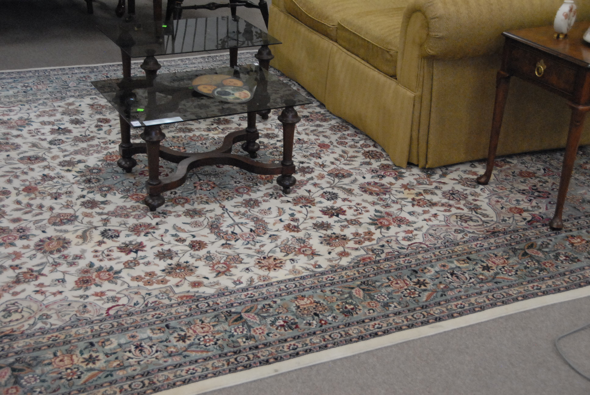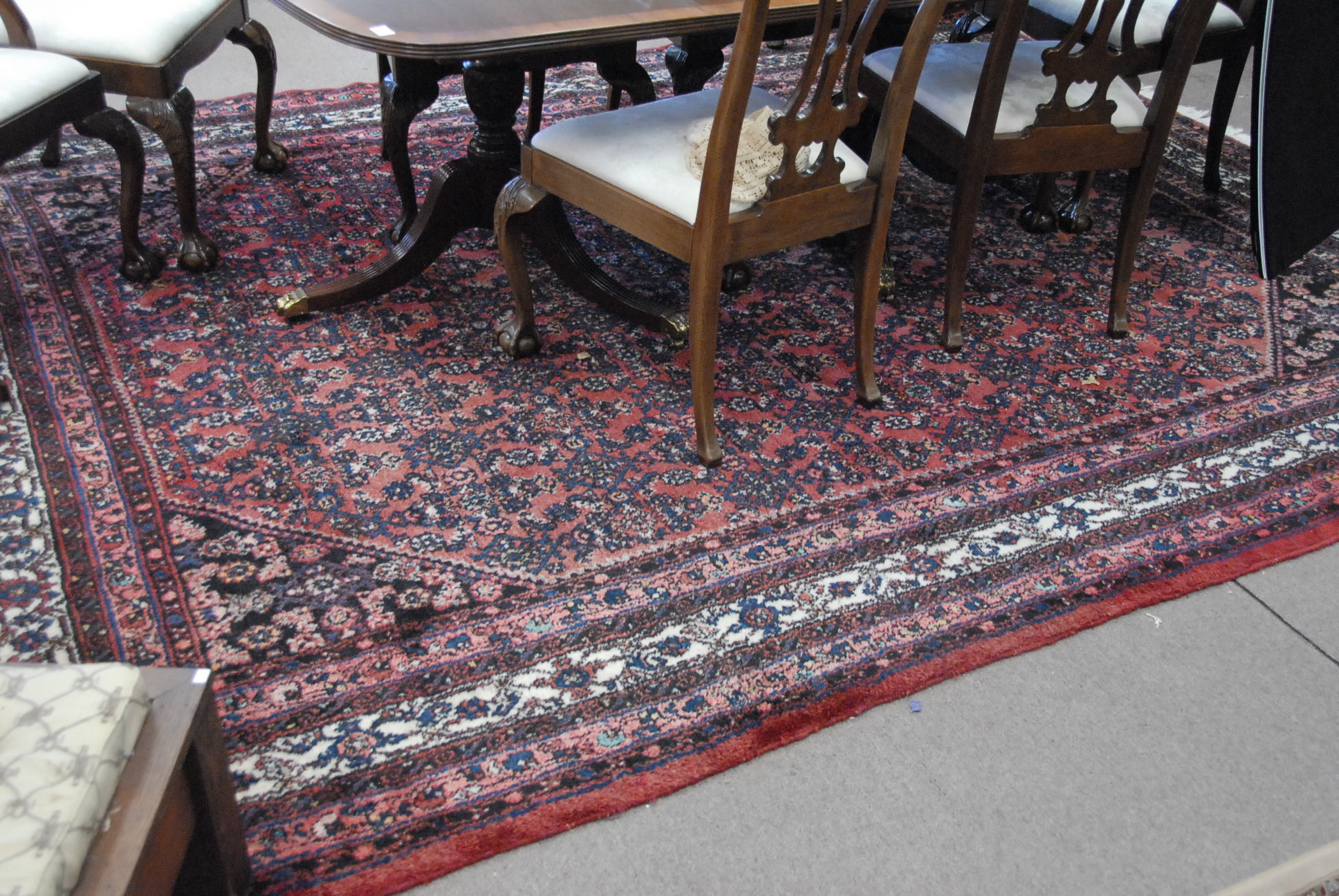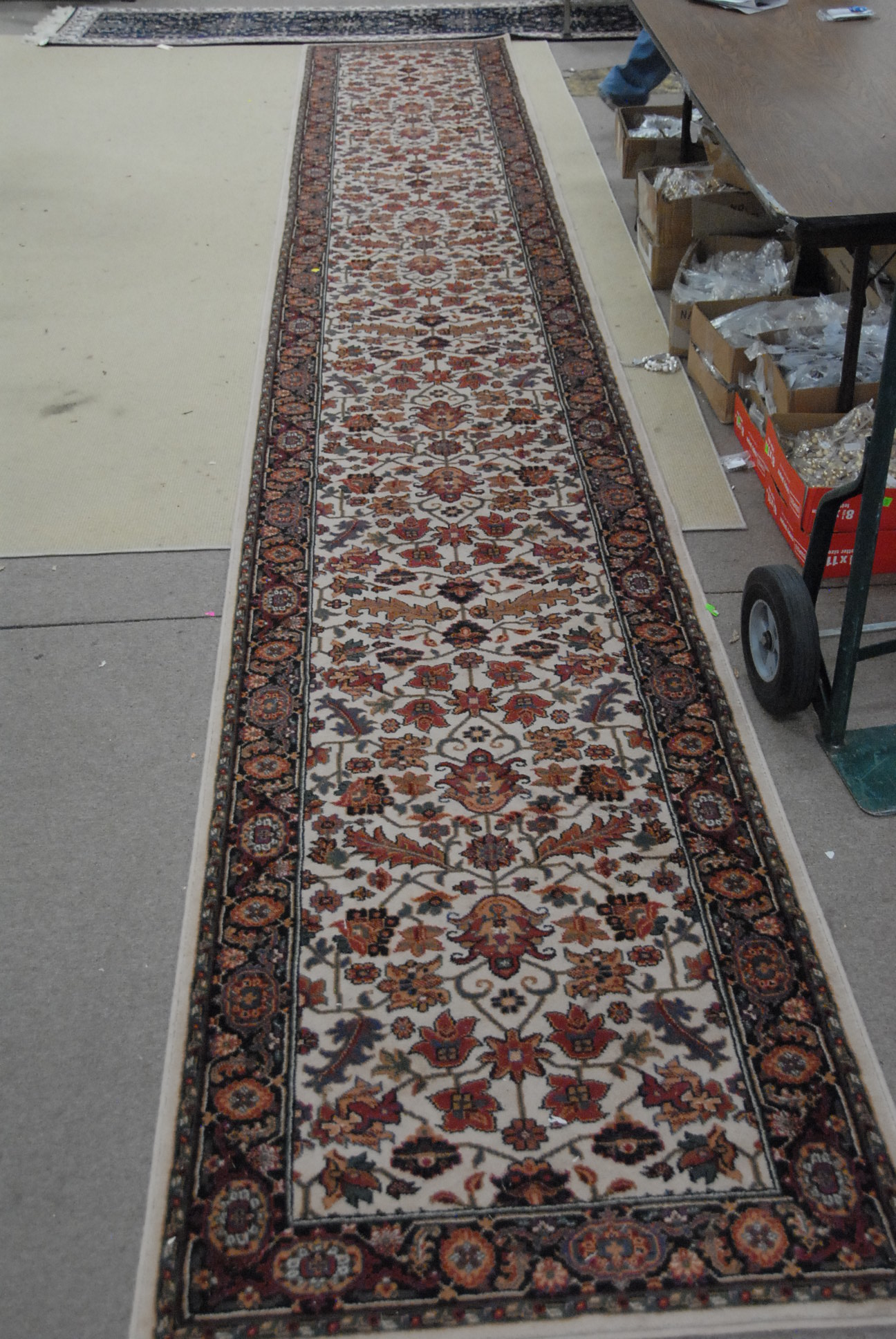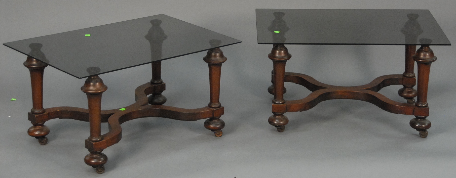 Hickory double pedestal mahogany dining table with banded inlaid top along with three leaves and custom pads ht. 28 1/2in. wd. 46in., closed wd. 76in. with three 20in. leaves, opens to 136in.