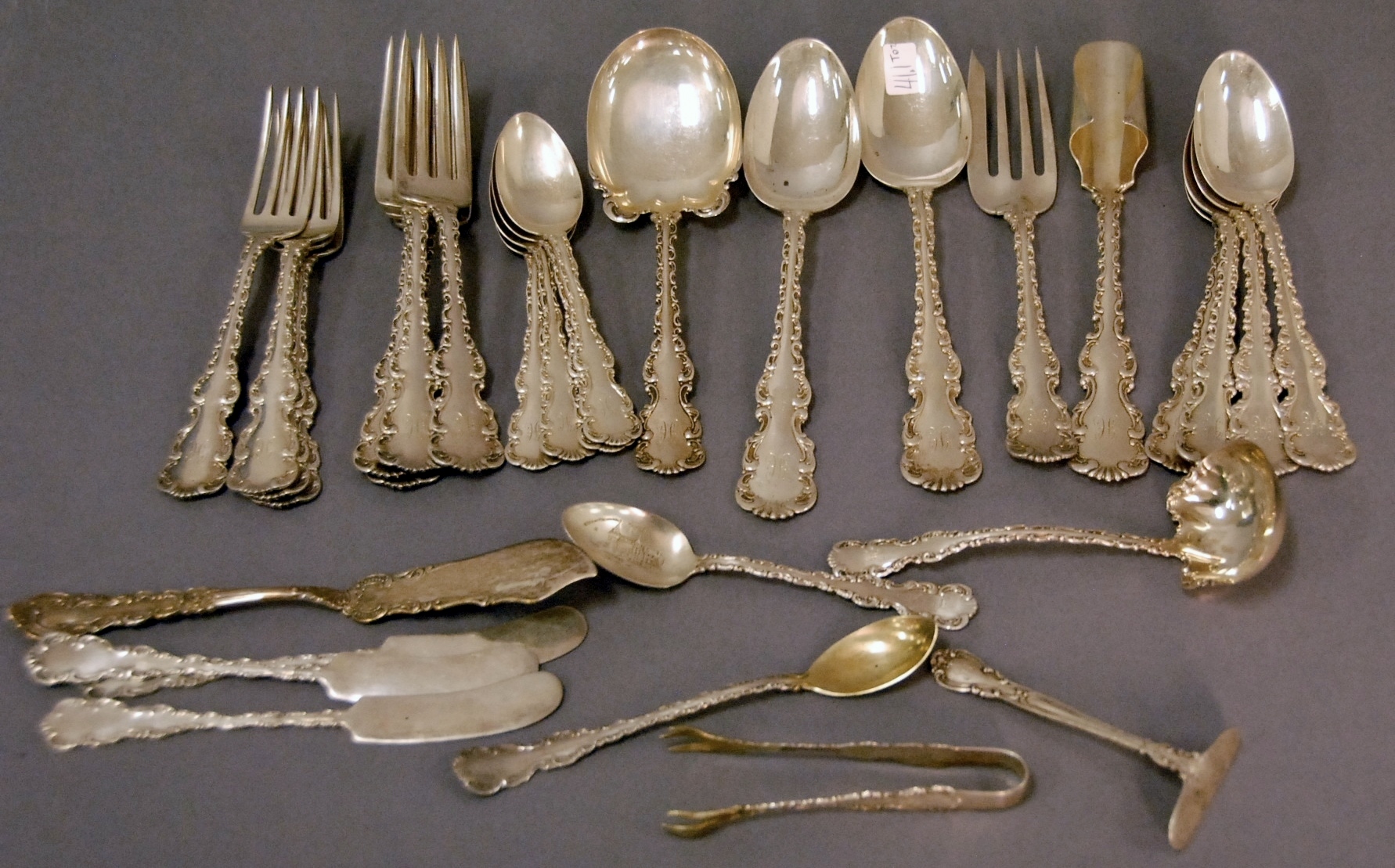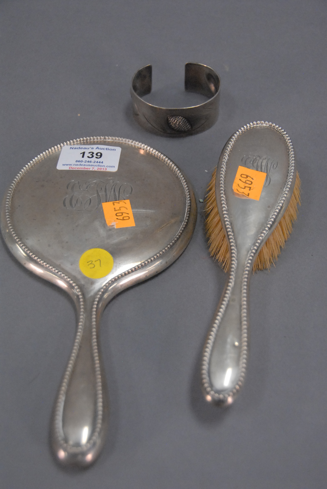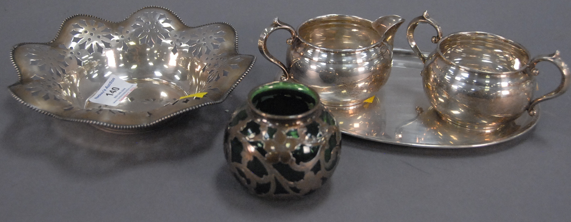 Group of five pieces of sterling to include creamer and sugar, small oval tray, bowl, and a green glass vase with silver overlay, 15 t oz. of weighable silver.