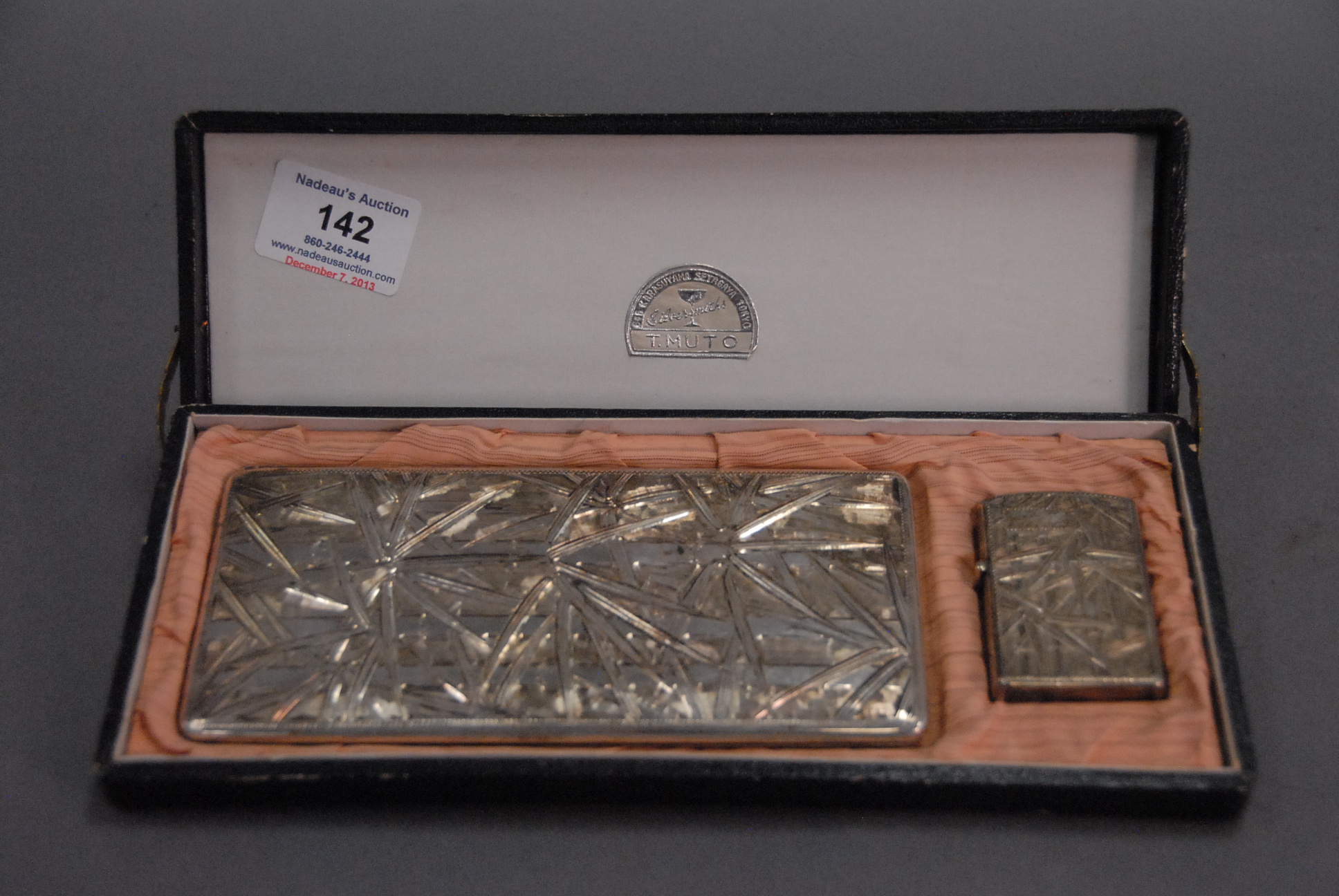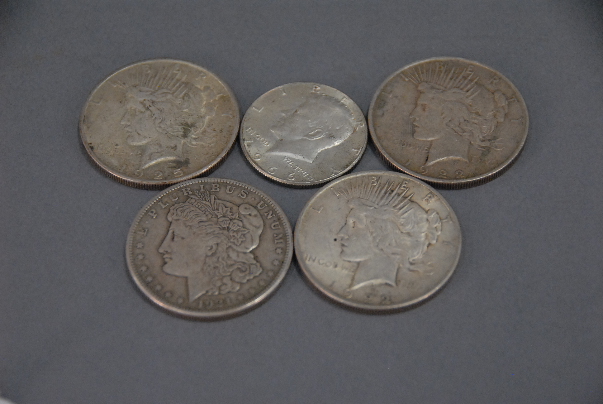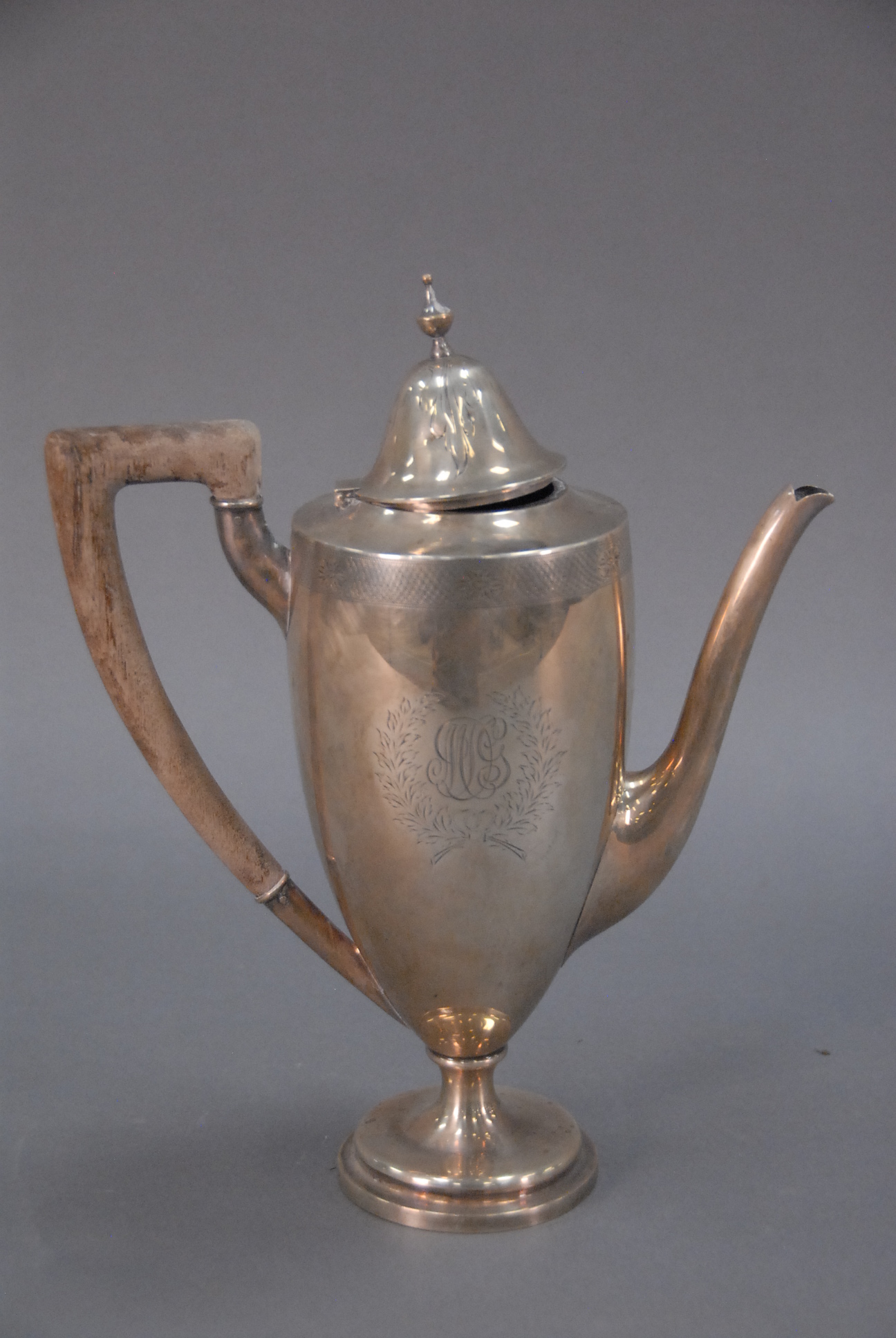 Group of five pieces of sterling to include creamer and sugar, small oval tray, bowl, and a green glass vase with silver overlay, 15 t oz. of weighable silver.
