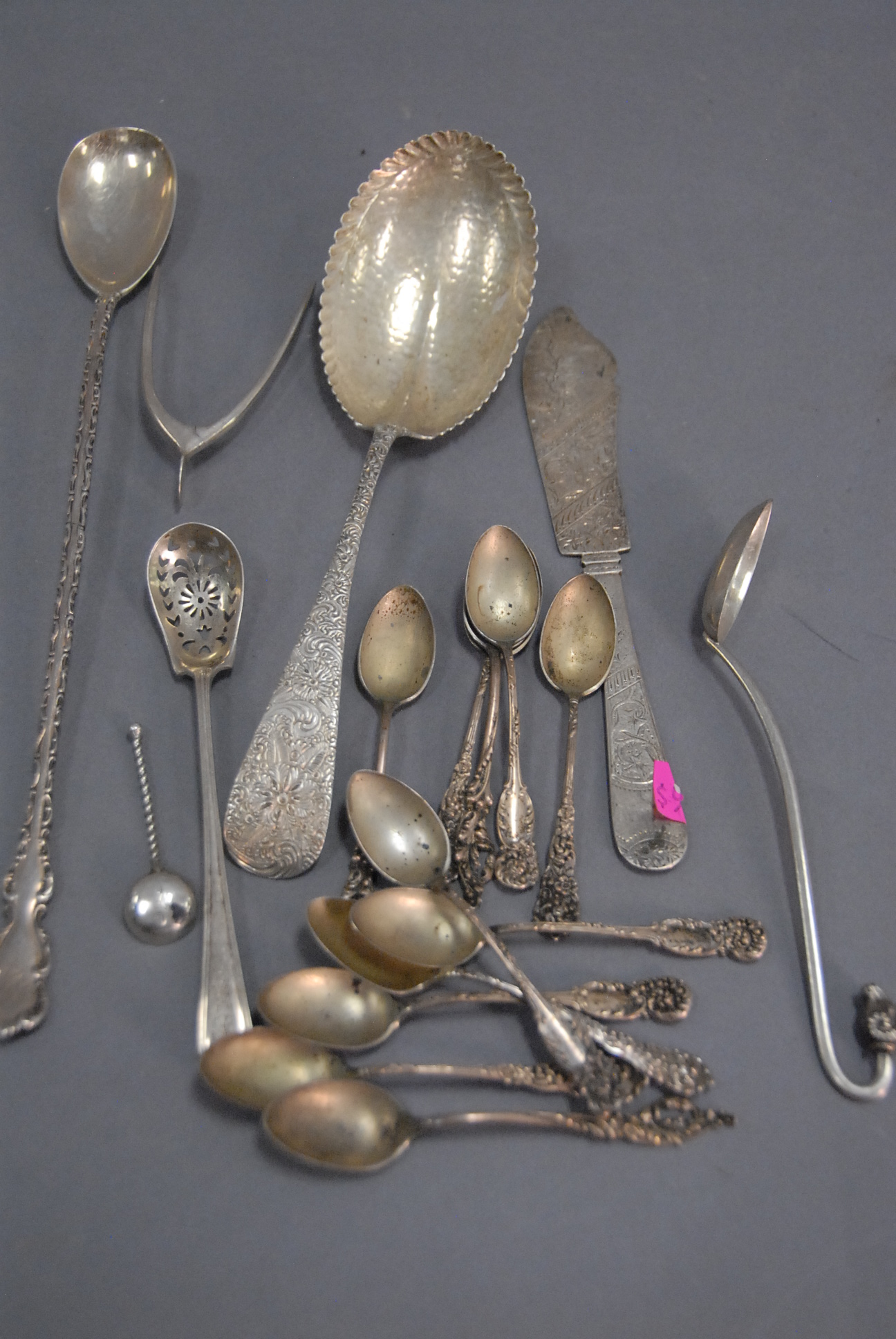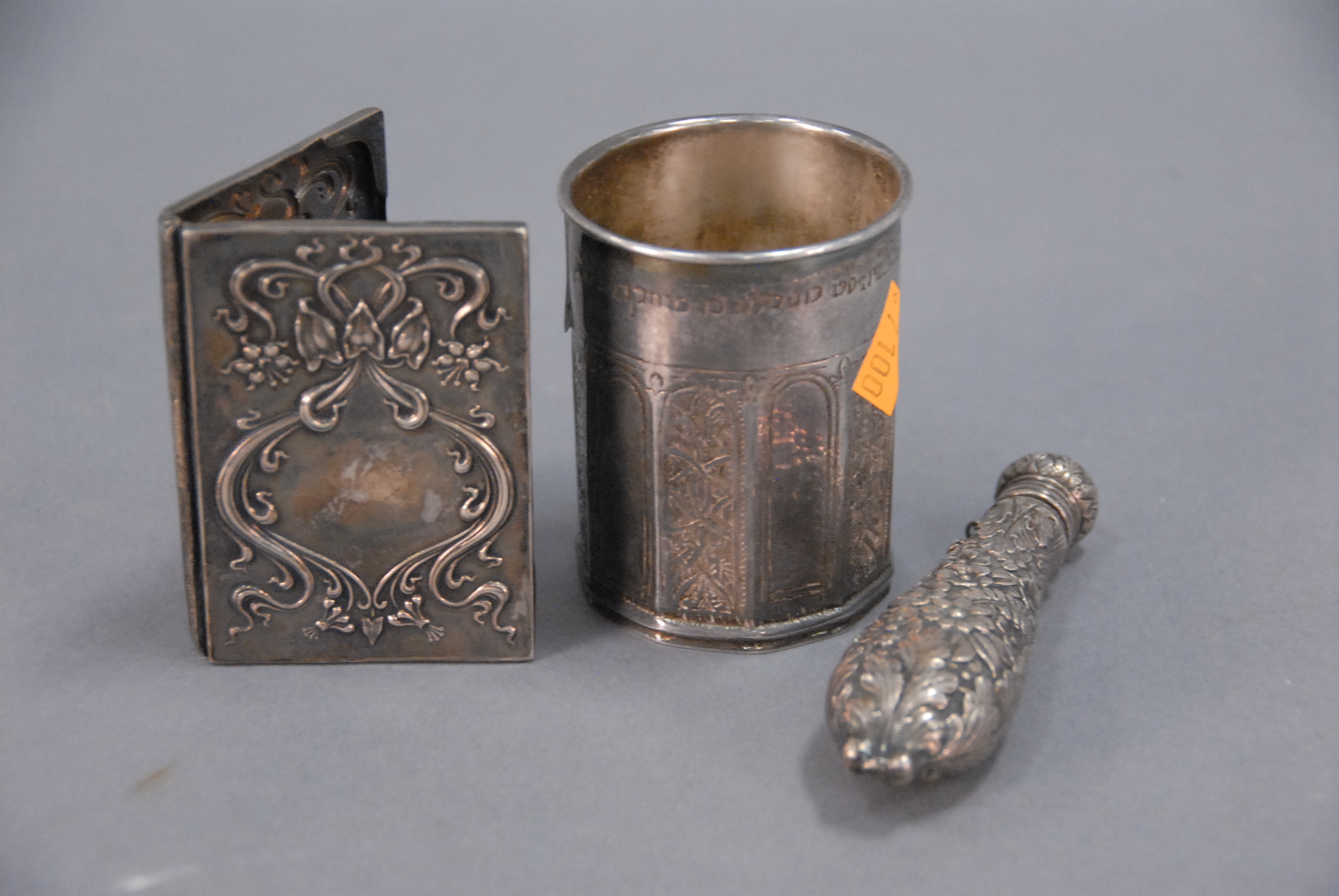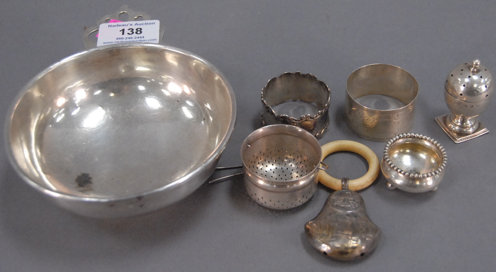 Group of silver items to include a Victorian baby rattle with ivory ring, sterling revere style bowl, two napkin rings, two tea holders, and small salt, 6.6 t oz.