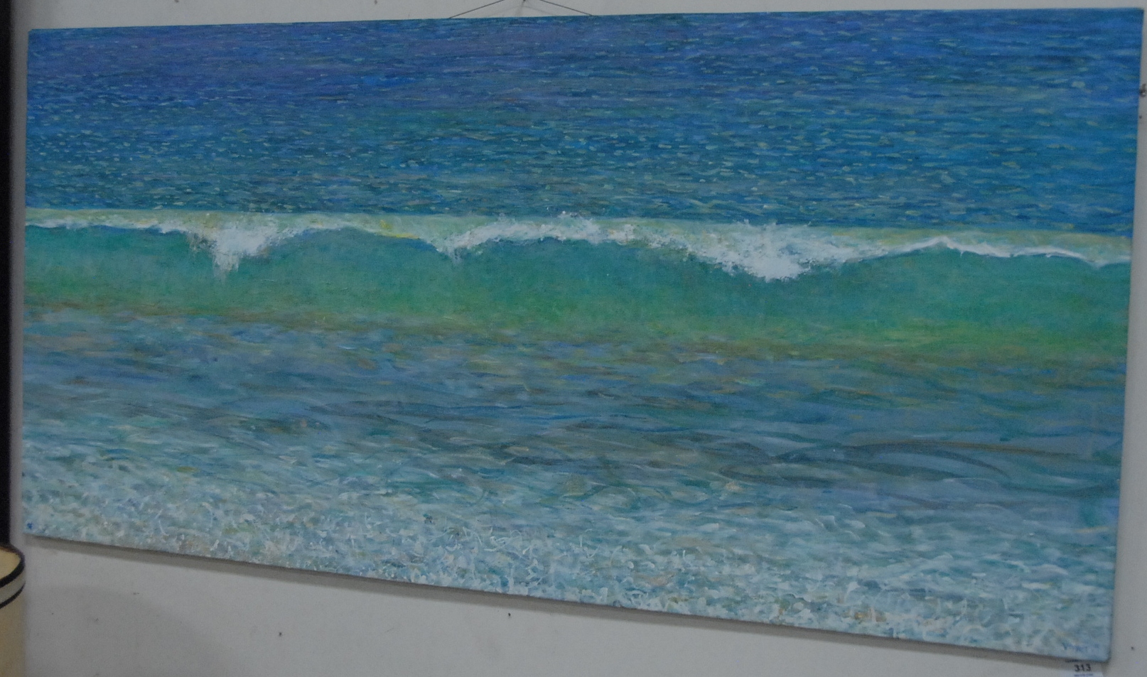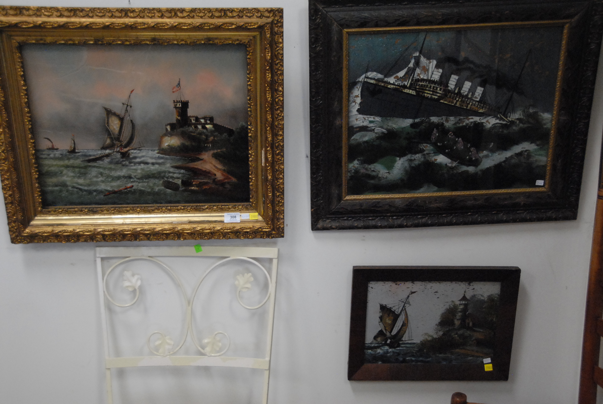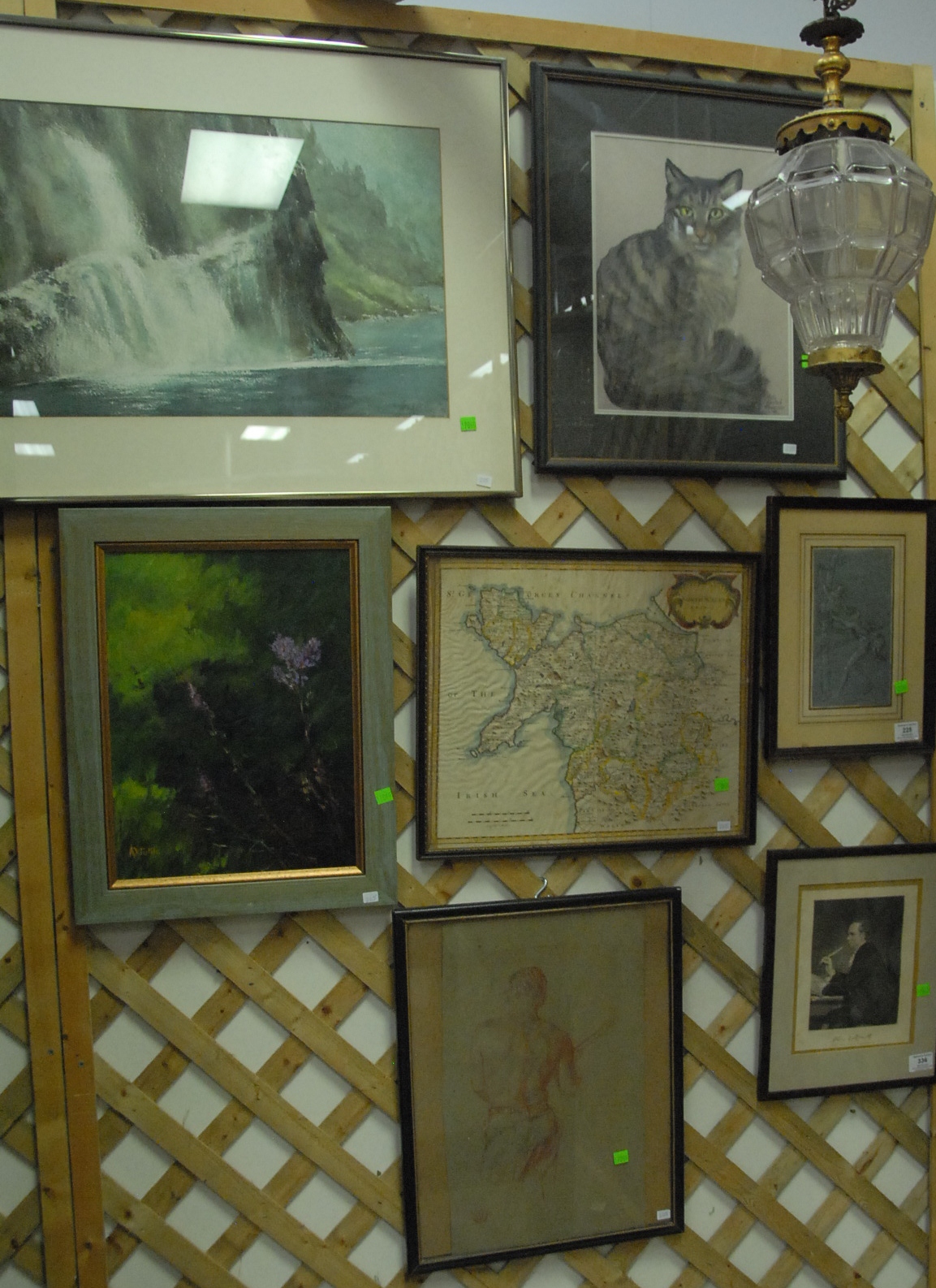 Group of seven paintings and maps to include Robert Morden North Wales, St. Georges Channel or the Irish Sea, watercolor of crashing waves, French drawing The Devil’s Tail, and black and white chalk on blue paper, etc.