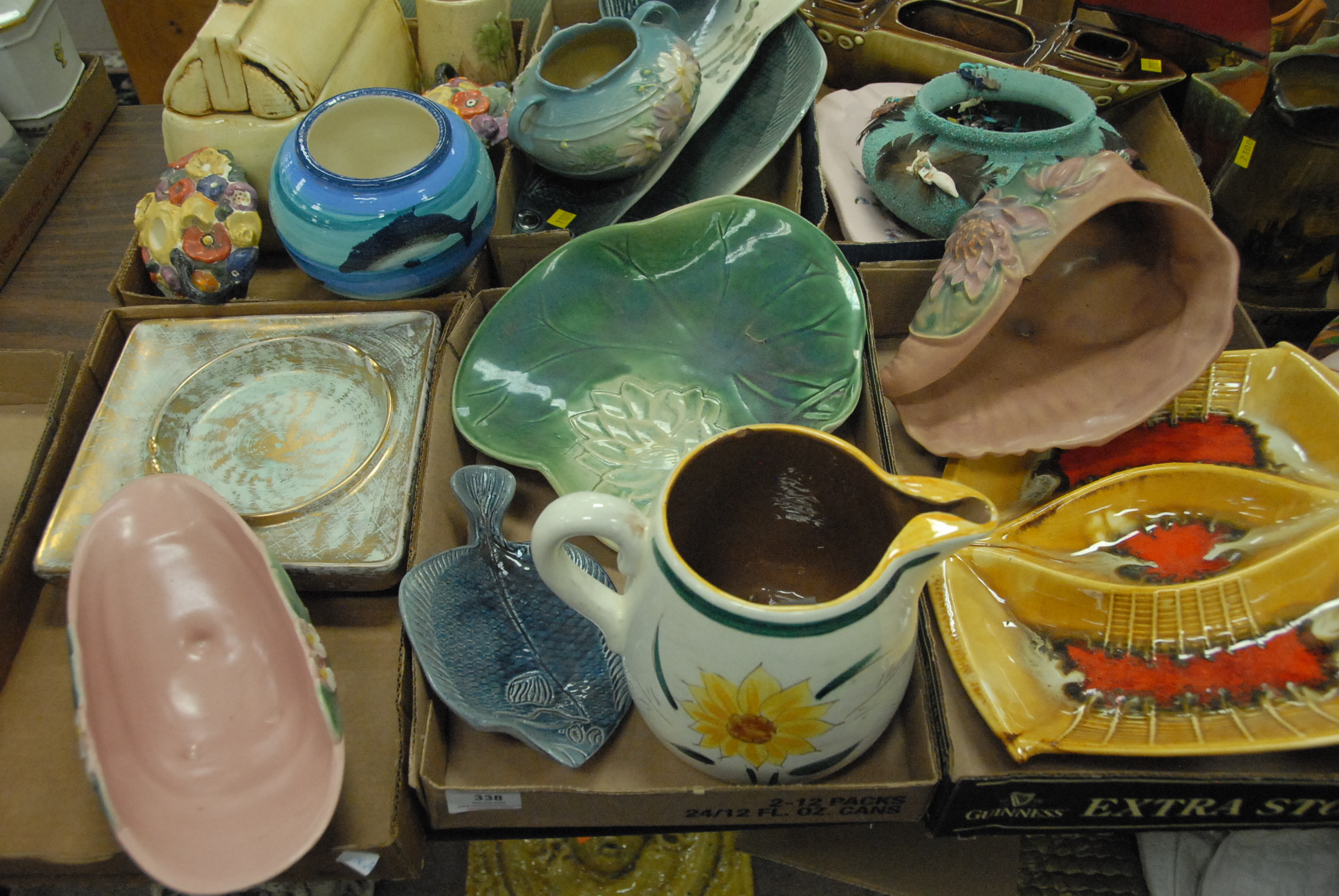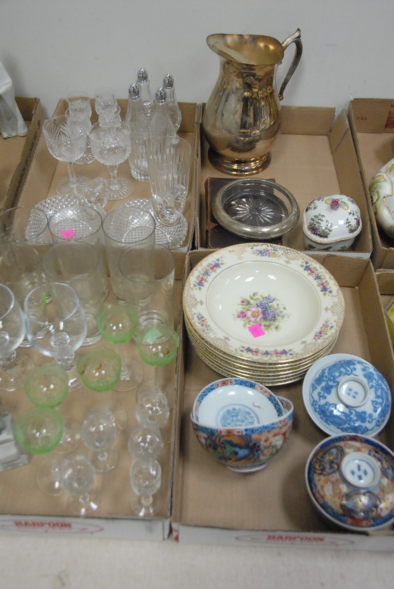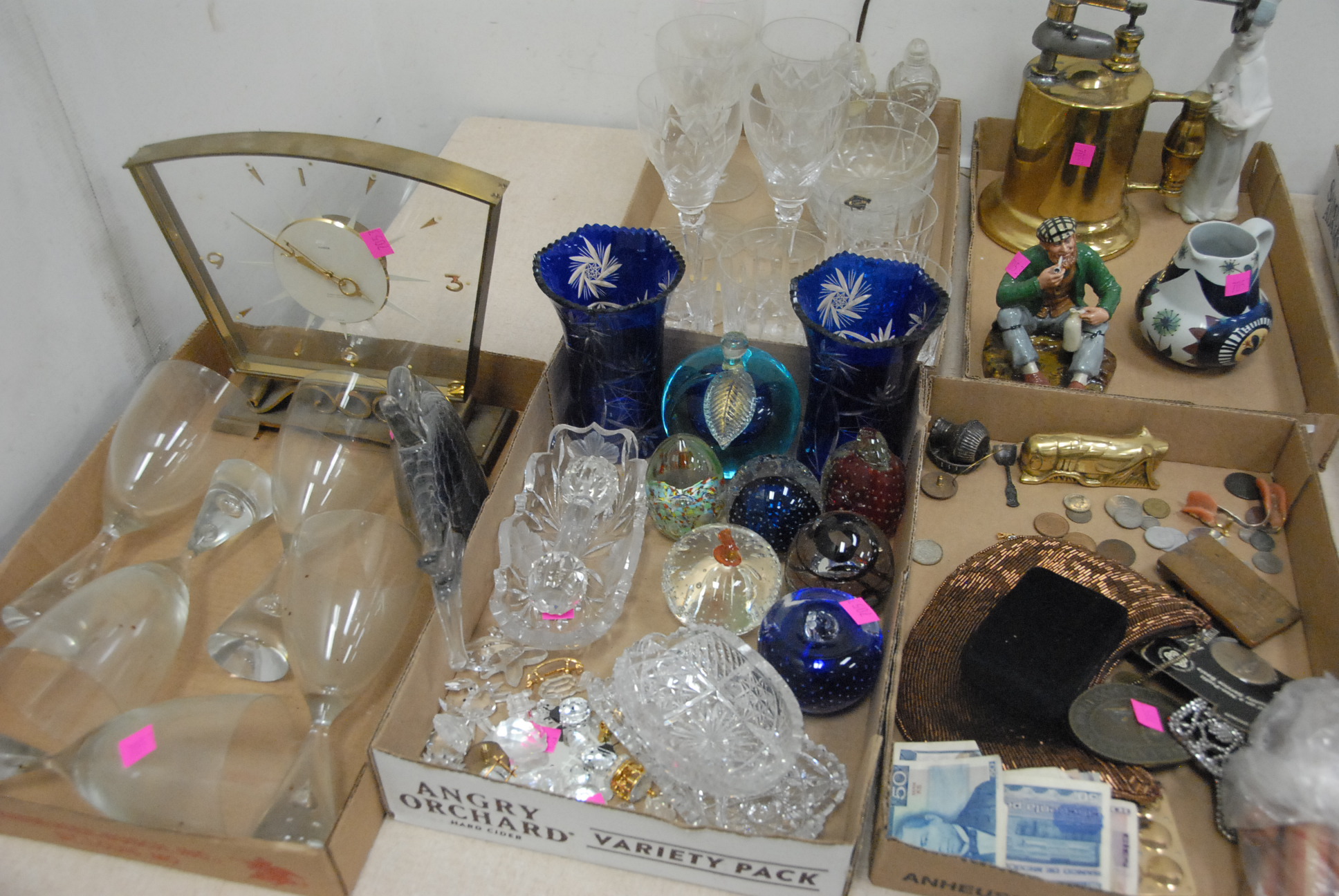 Group of five boxes to include group of approximately 25 small Swarovski crystals, stems, seven paperweights, Royal Doulton figure, Foreign money, etc.