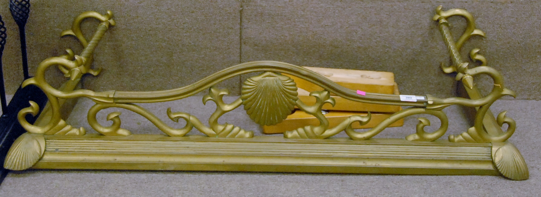 Victorian brass fire fender with shell corners.