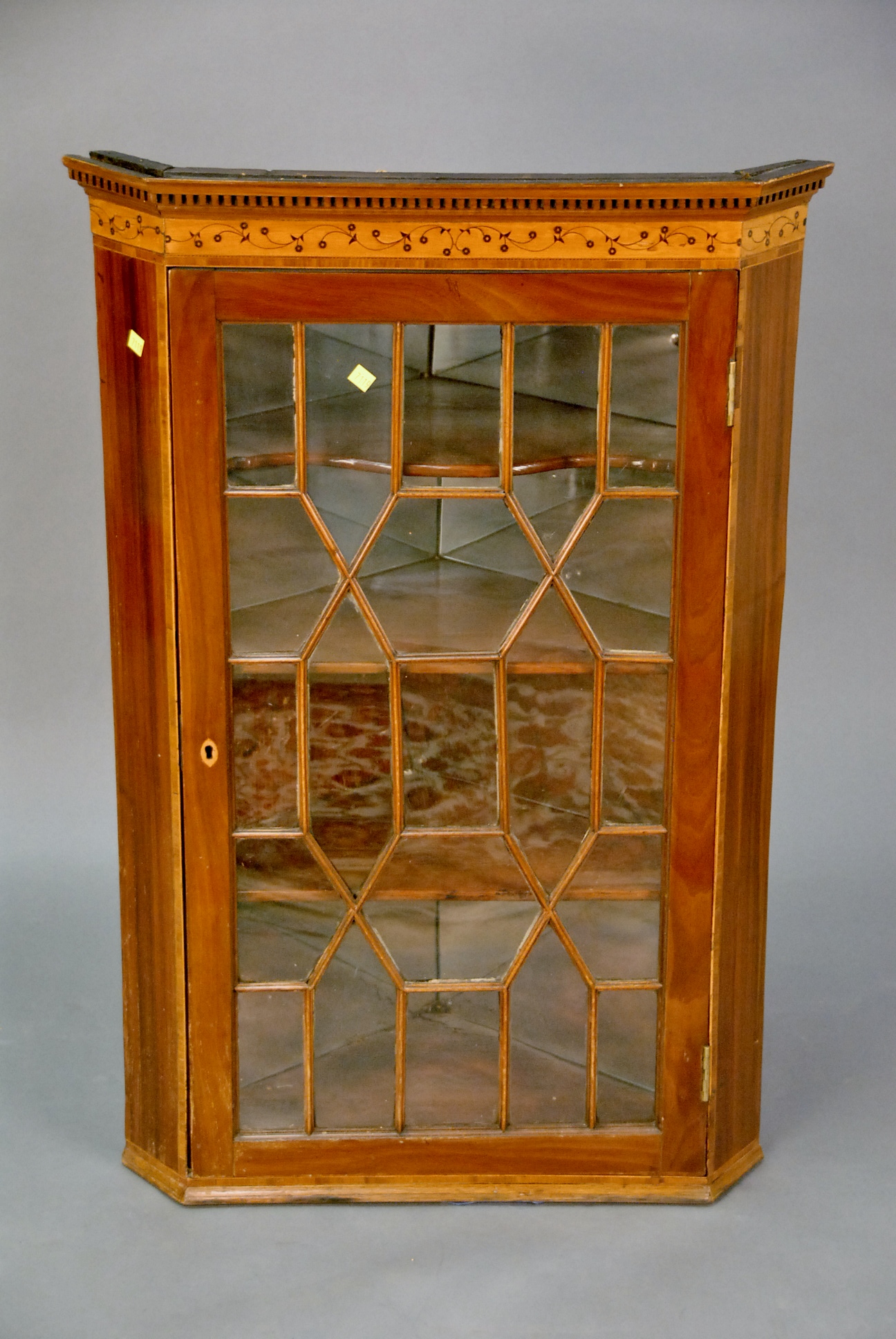 Mahogany inlaid corner hanging shelf.