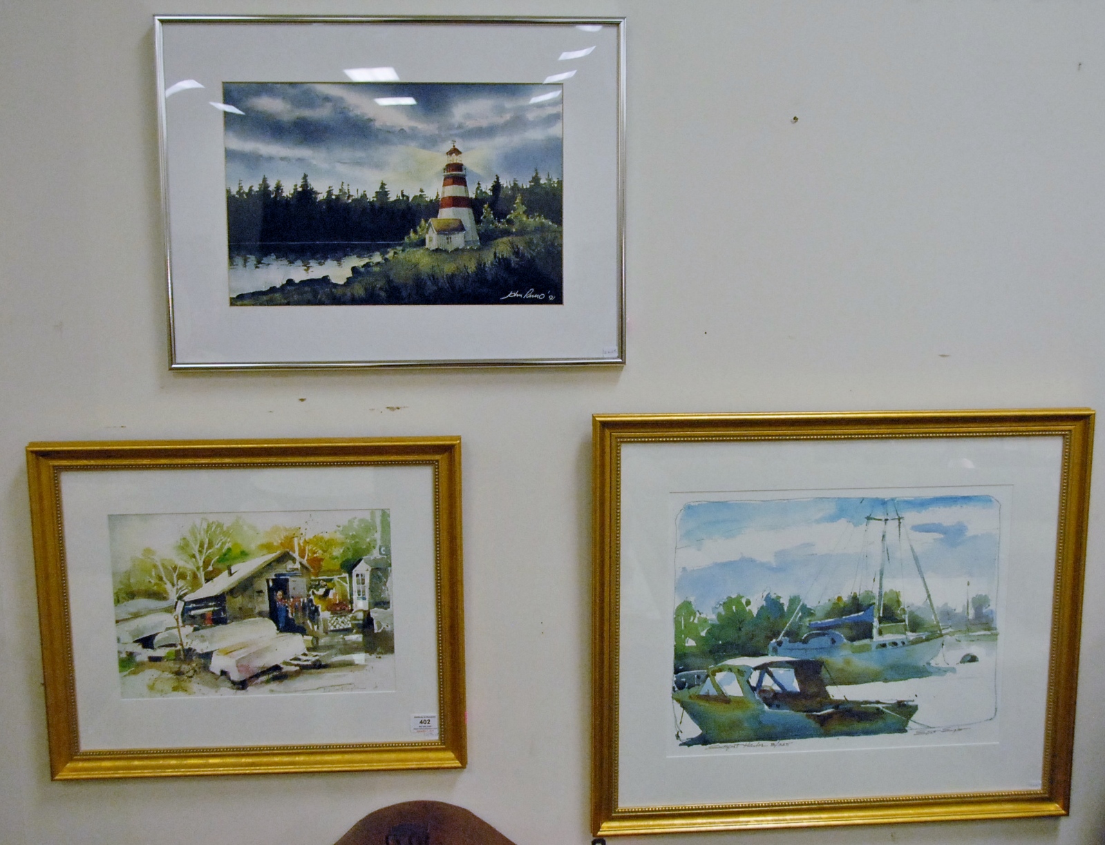 Three piece lot to include two framed prints by Elliot Engler and one watercolor signed indistinctly.