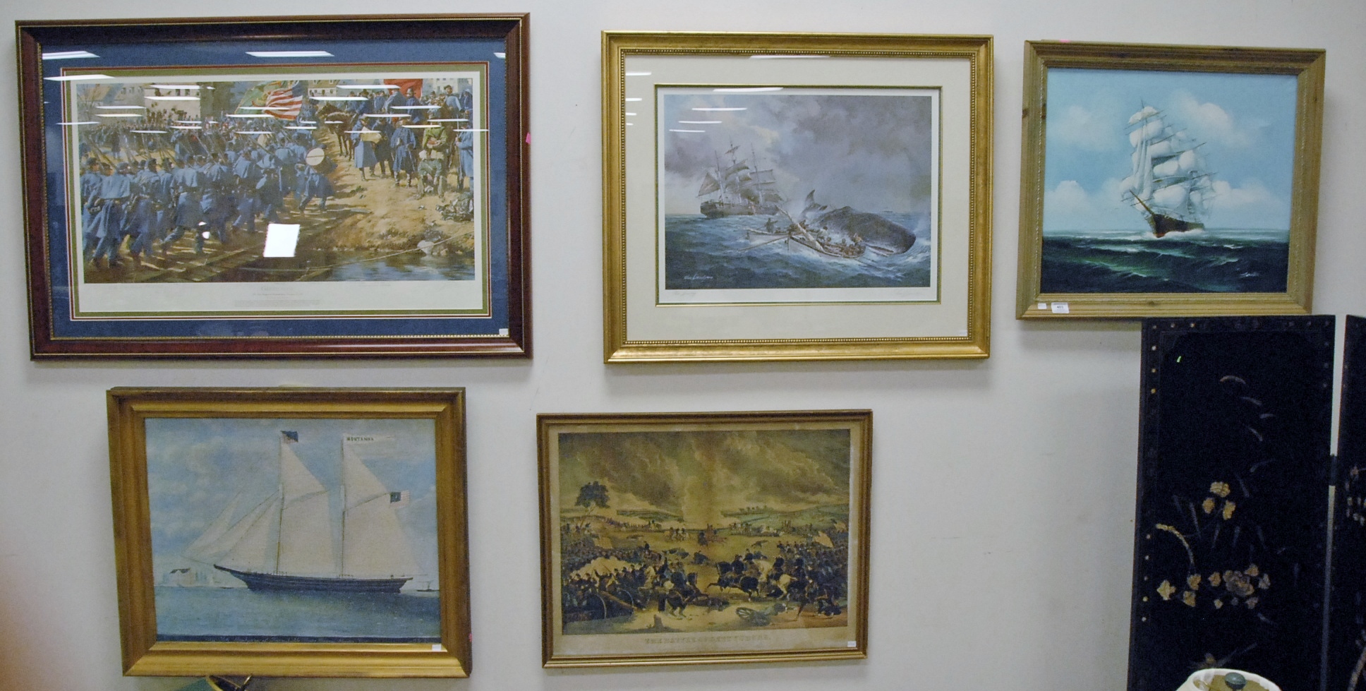 Five piece lot to include print of Battle of Gettysburg, oil on canvas of ship signed Jackson and three prints.