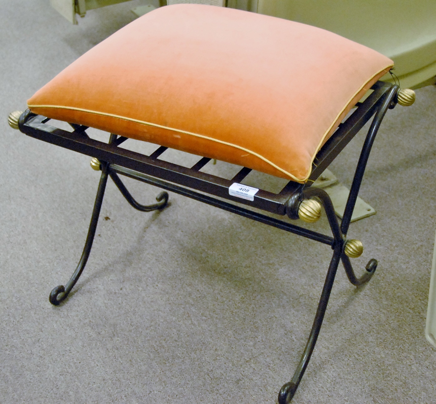 Small upholstered, iron, and brass stool.