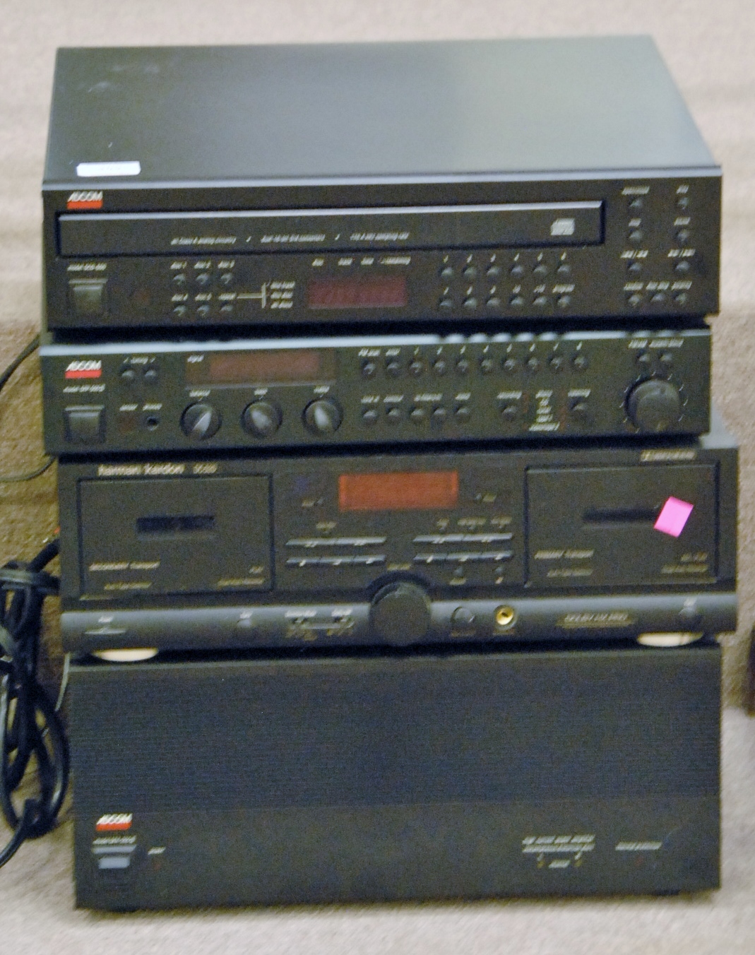 Adcom stereo set to include model GFA-555 No. 2 amp, model GTP-500 II tuner, and model GCD-600 CD player, and Harmon Kardon DC520 tape player.