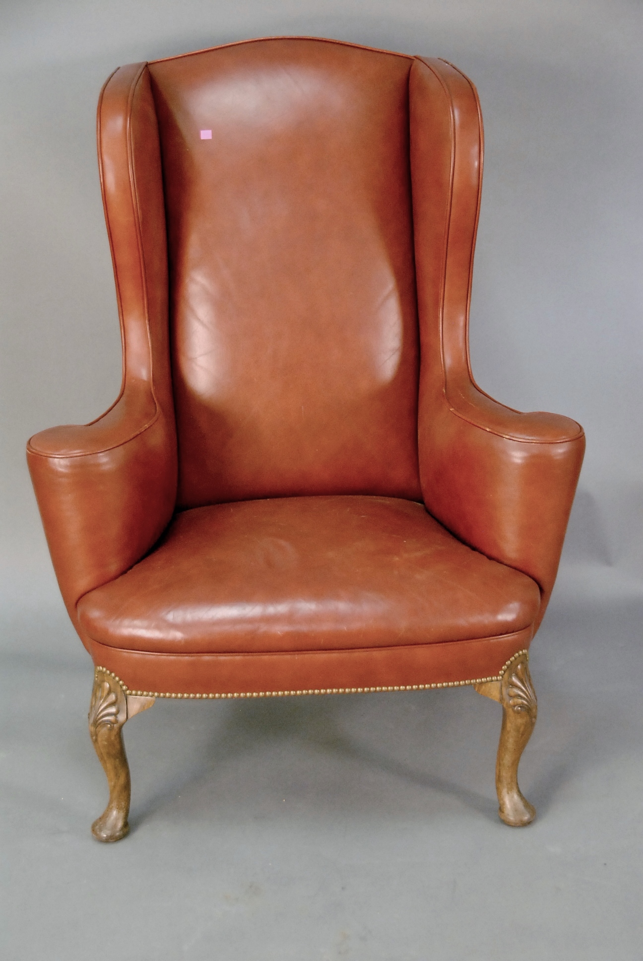 Red leather upholstered wing chair.