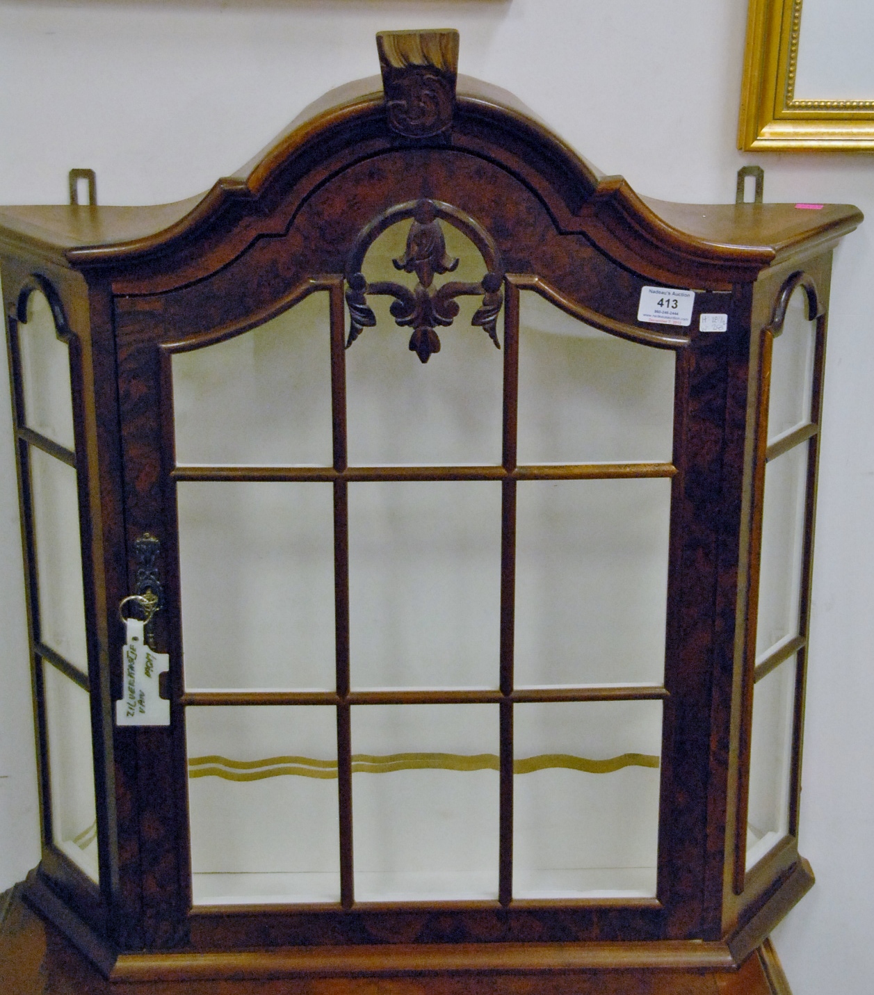 Small burlwood hanging curio cabinet. ht. 28in. wd. 28in.