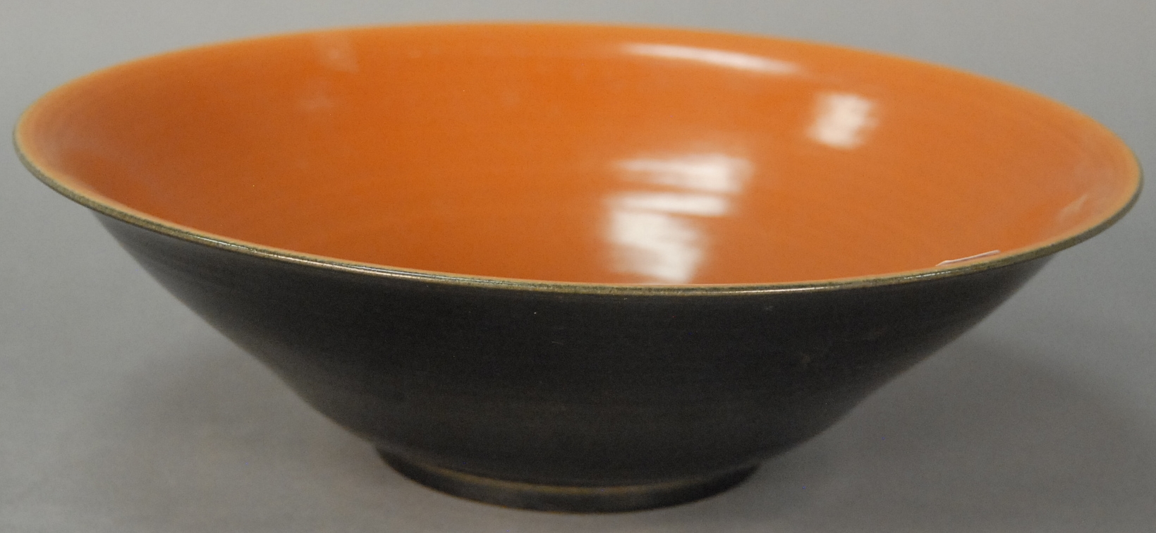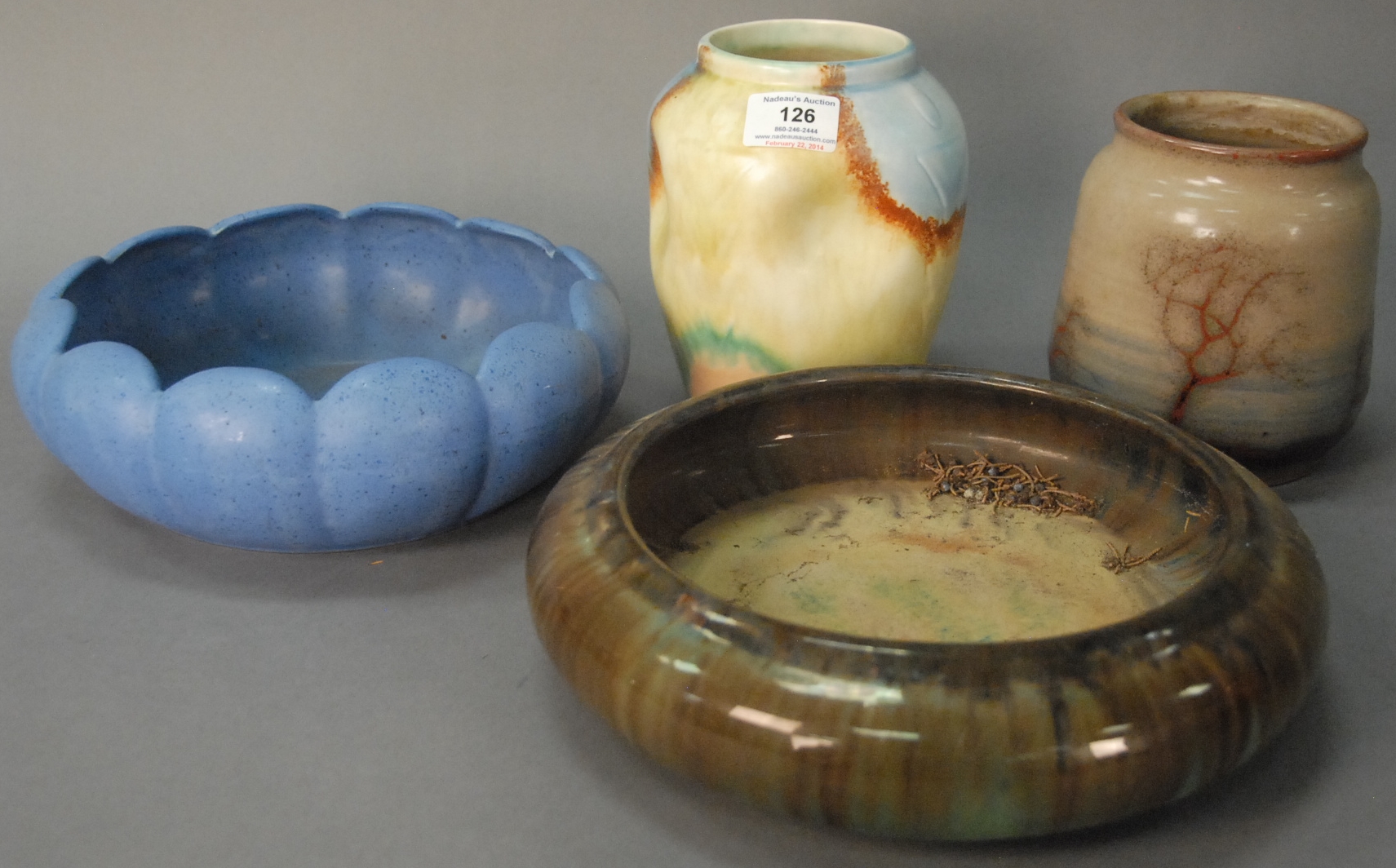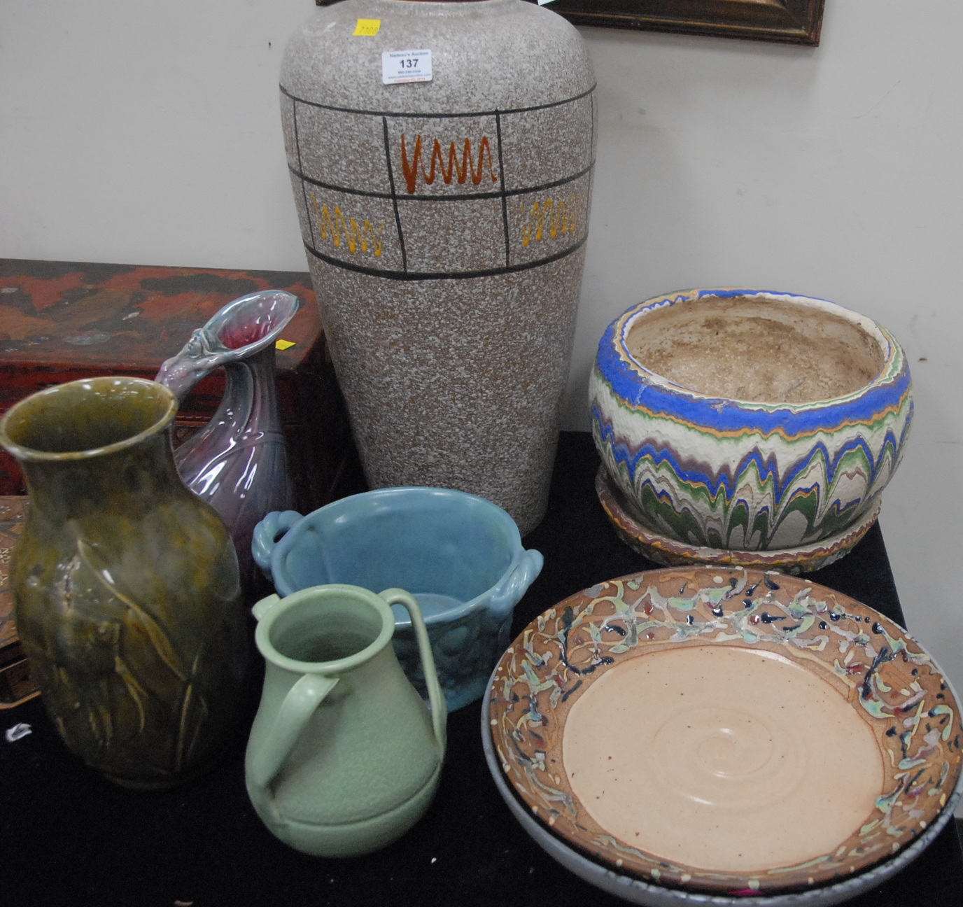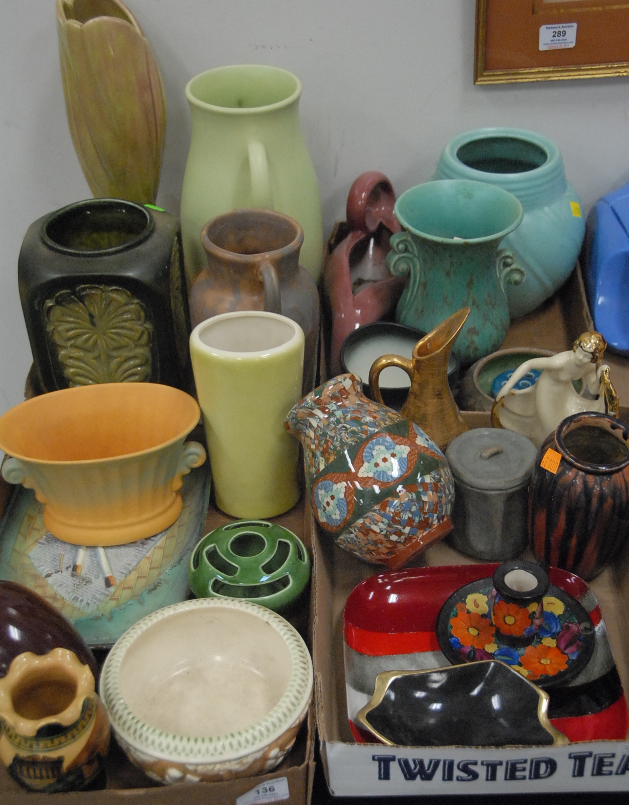 Five box lots to include Stangl, Mrazek, bronze plate, enameled dish, vase marked R. G. Traill, pottery covered jar, Vallauris vase, Westinghouse Hall China, red vase, and two bowls.