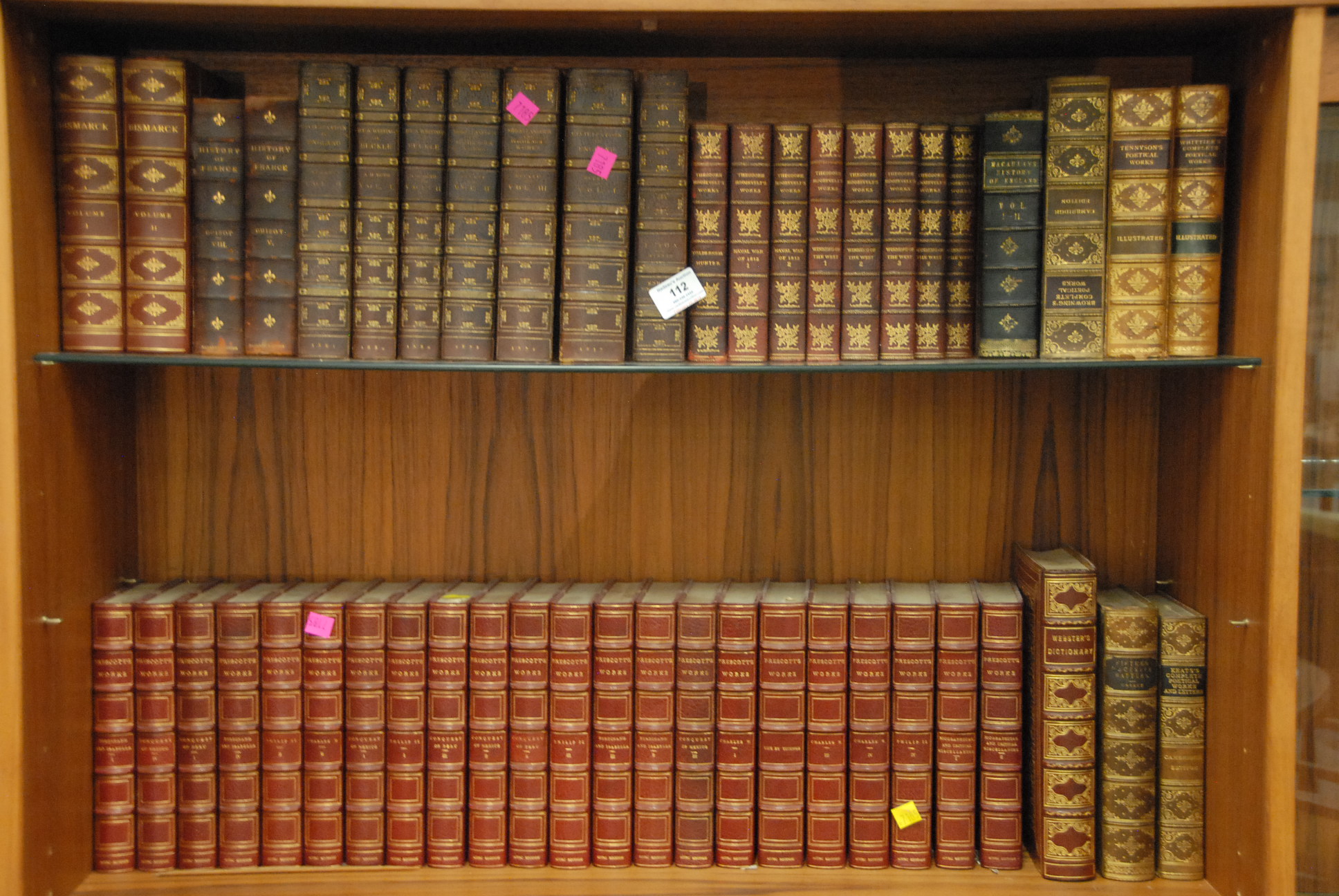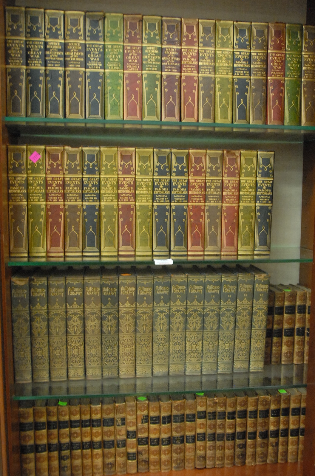 Large group of books, mostly leather bound including The Great Events Great War, Autobiography Set, Bulwer Set, John L. Stoddards set, etc., approximately 153 books.