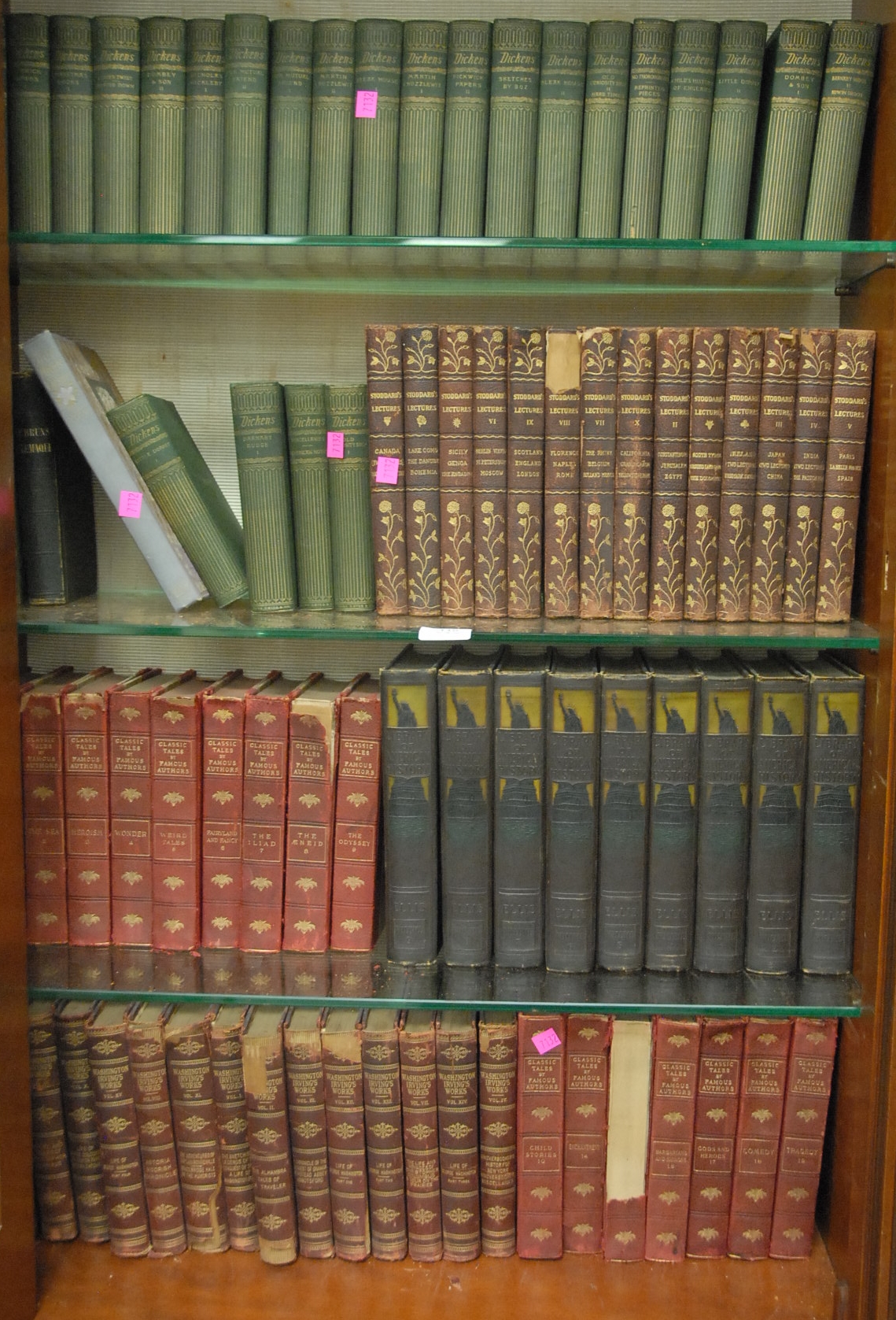 Large group of books, some leather bound, Stoddards Lectures set, Dickens set, Classic Tales set, Library of American History set, Washington Irving’s Works, etc., approximately 119 books.