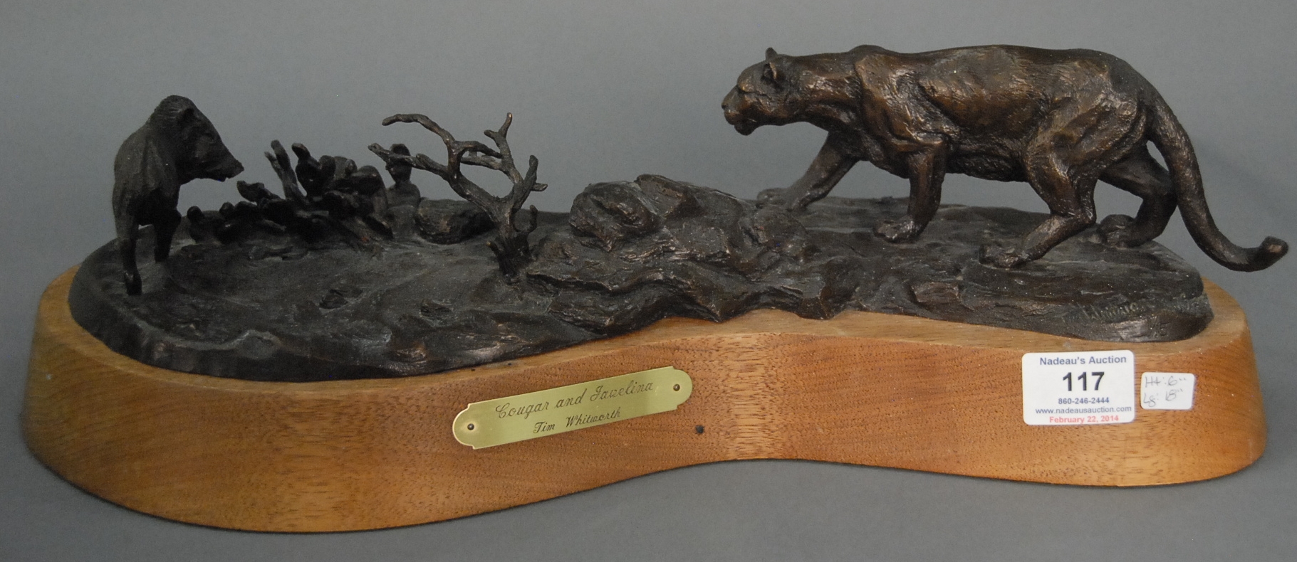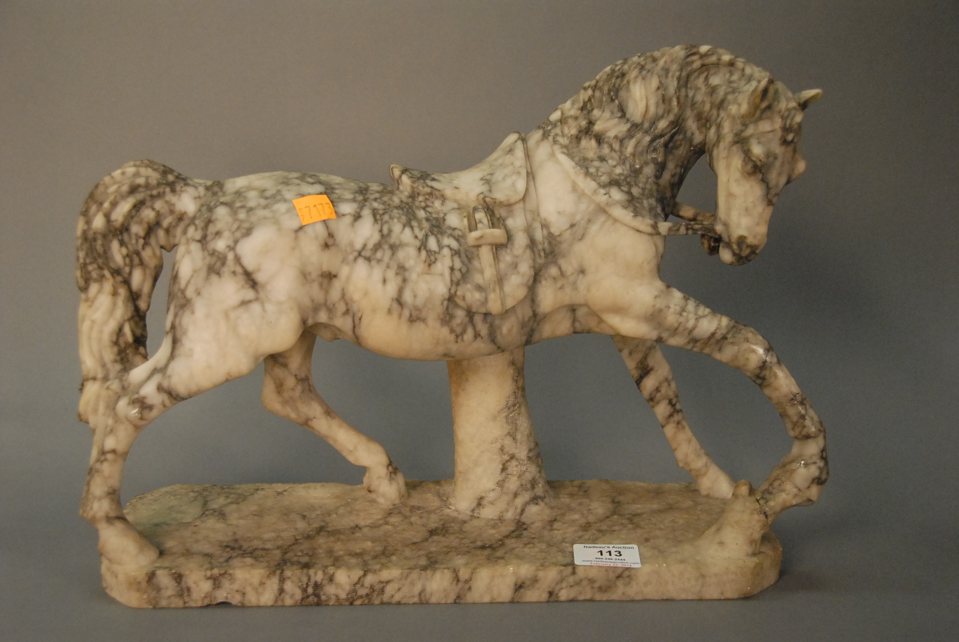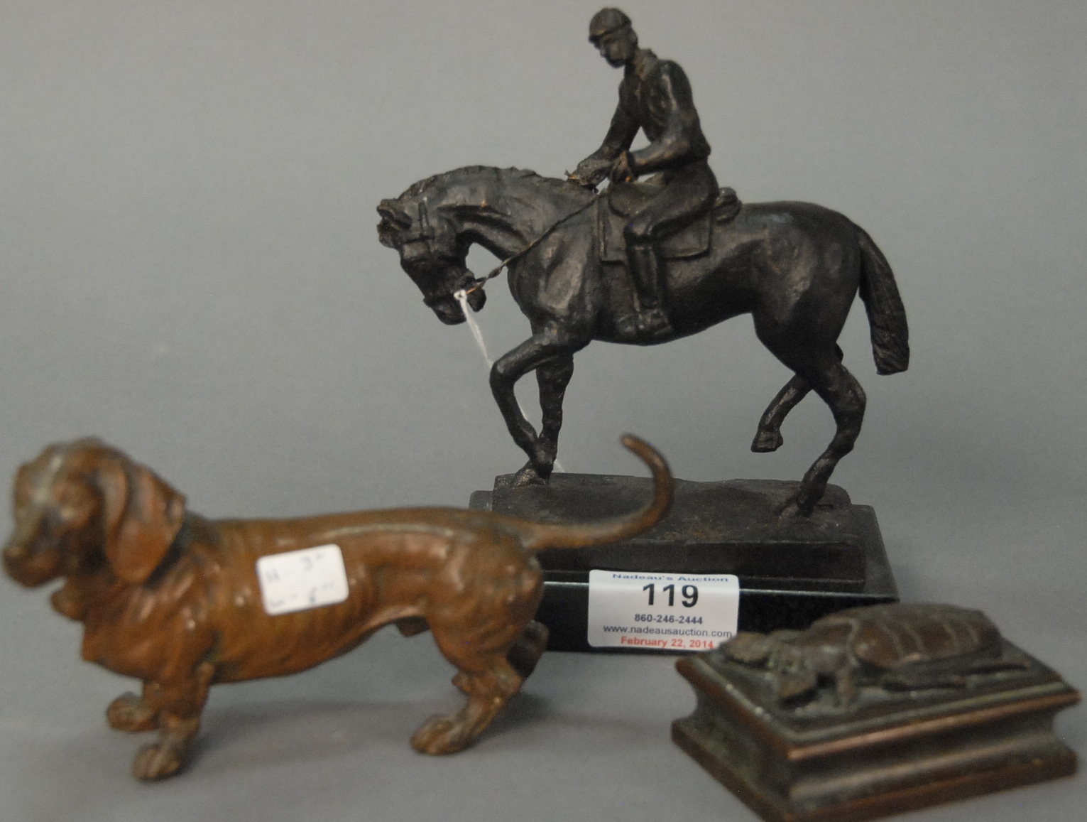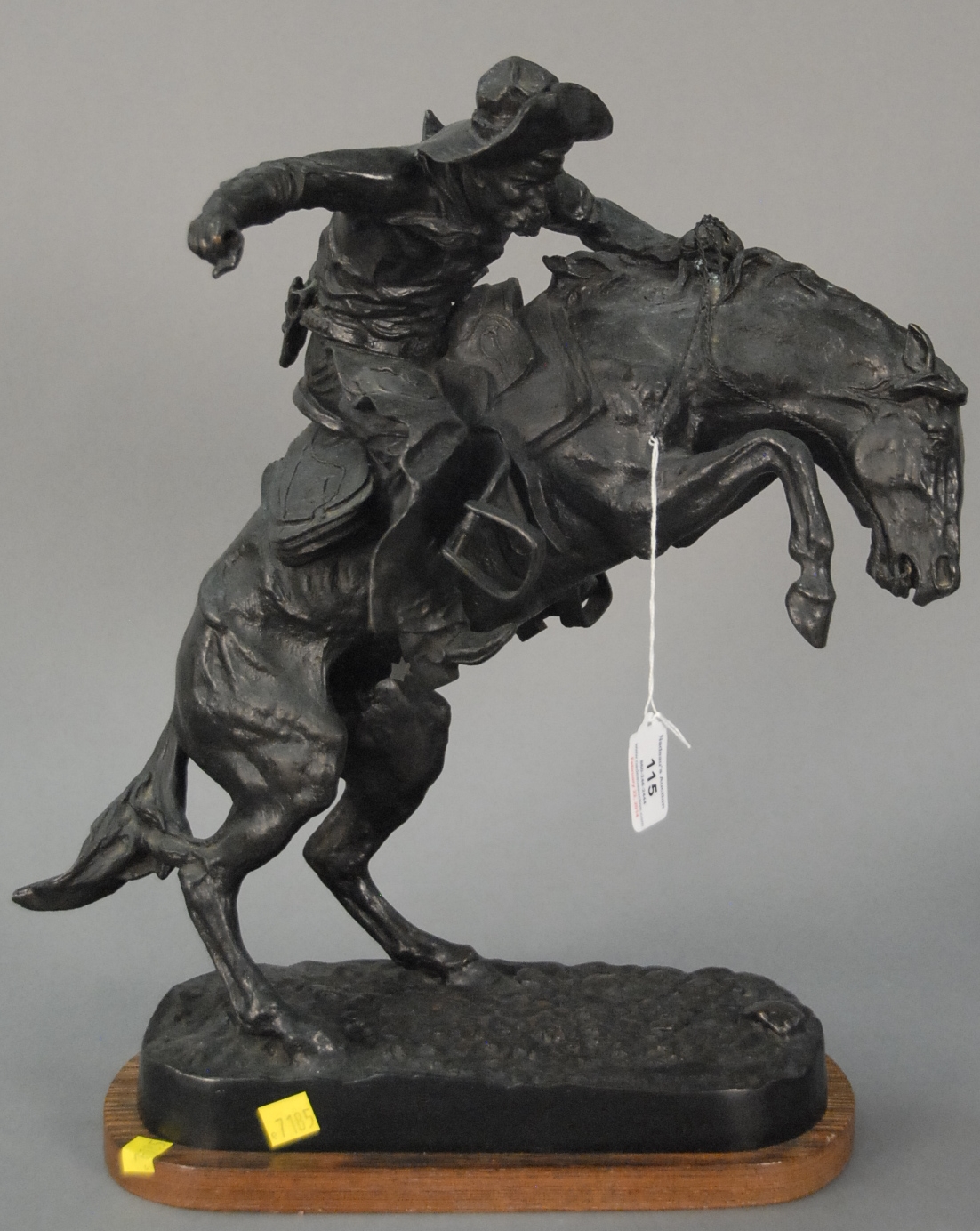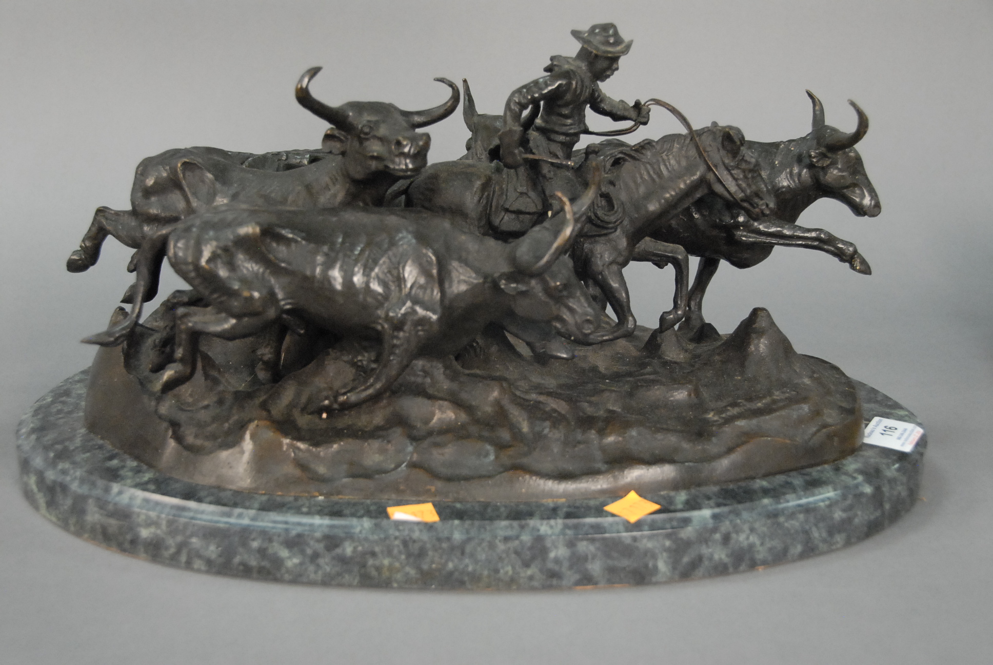 After Frederick Remington bronze The Stampede having cowboy on horse moving long horn on marble base, marked Frederick Remington, total ht. 9in. lg. 18in.