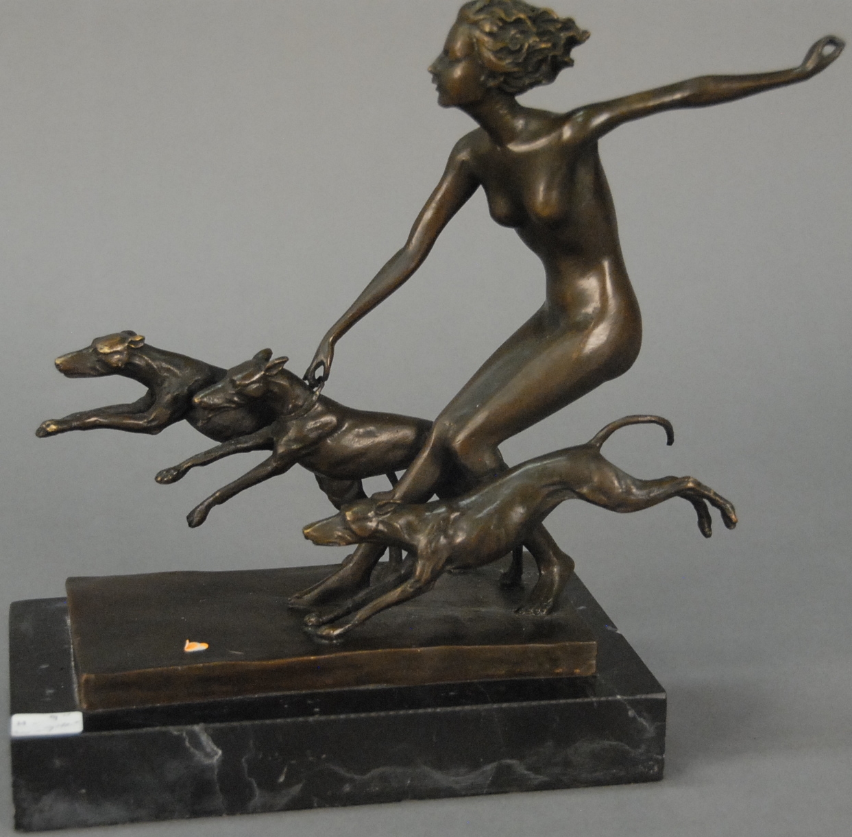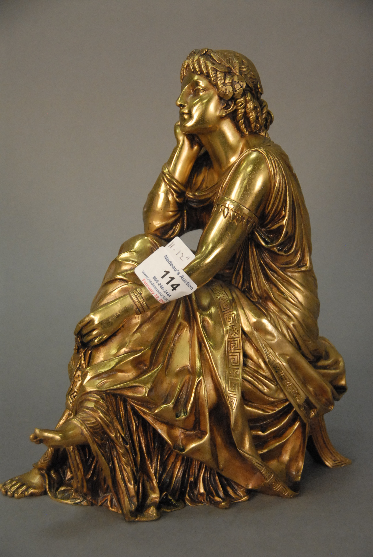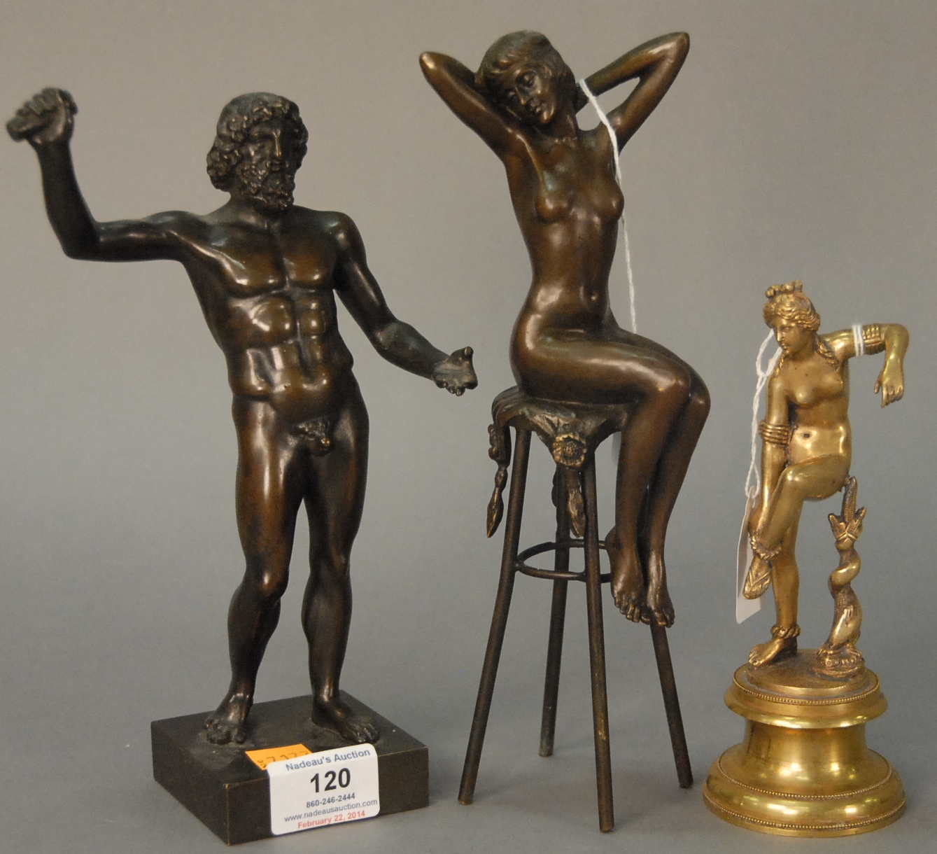 Three bronzes to include a nude on stool by Demetre Haralamb Chiparus 1886-1947 ht. 10in., an unsigned nude gilt bronze, and an unsigned nude standing male Greek mythology figure ht. 9in.