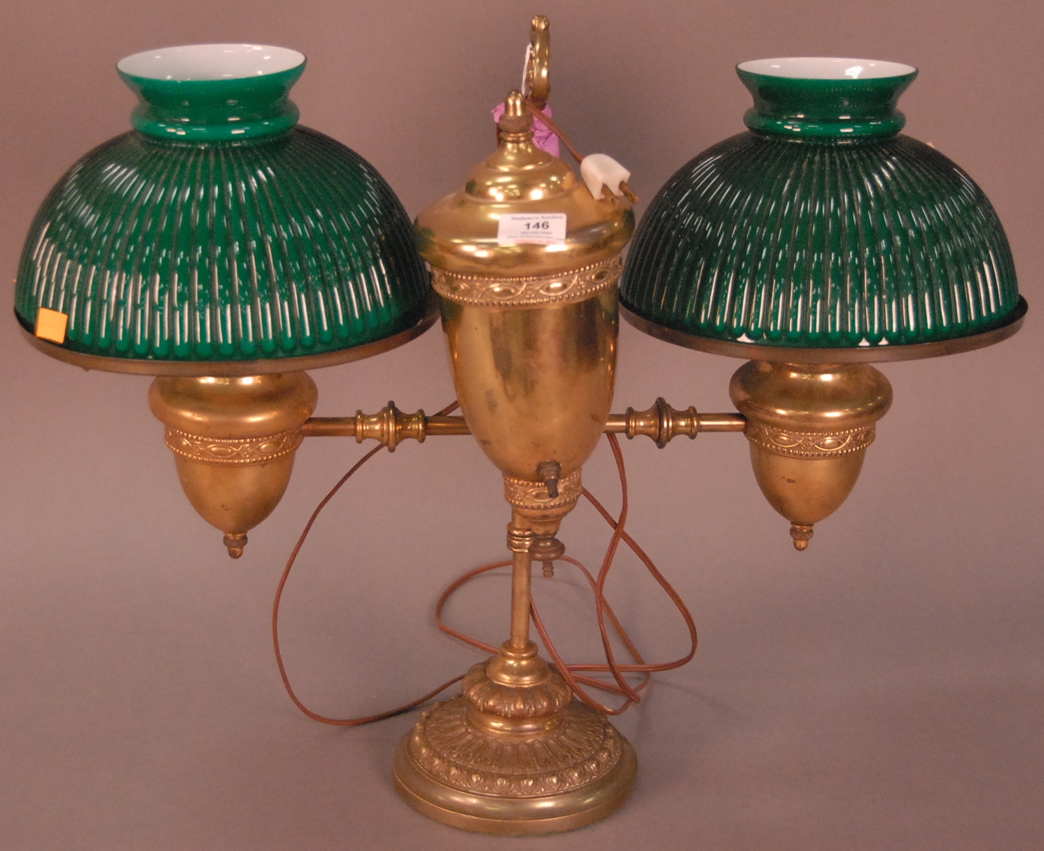 Double brass student lamp with green over white glass shades, ht. 21in.