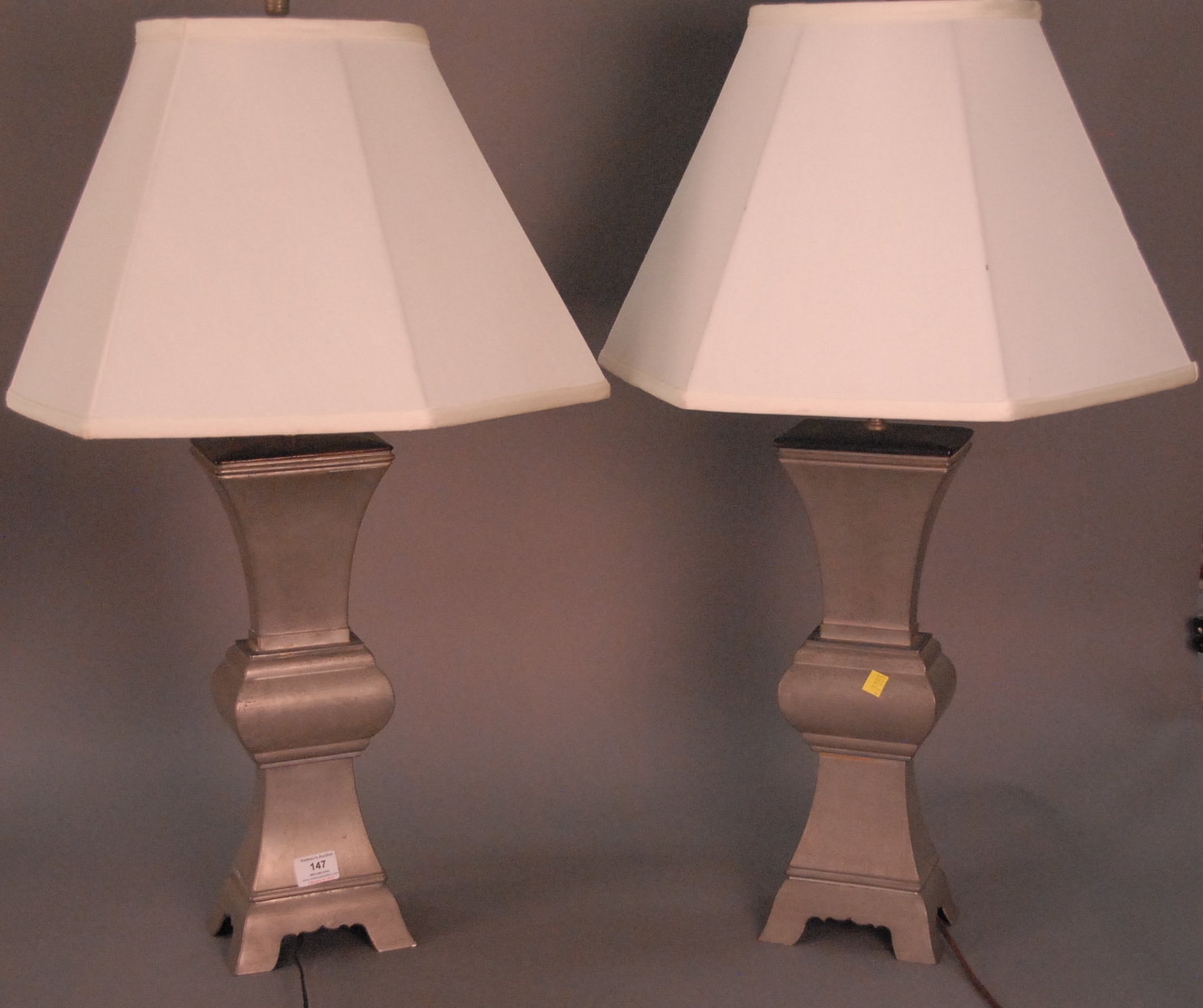 Pair of Oriental urn form pewter lamps, ht. 35.