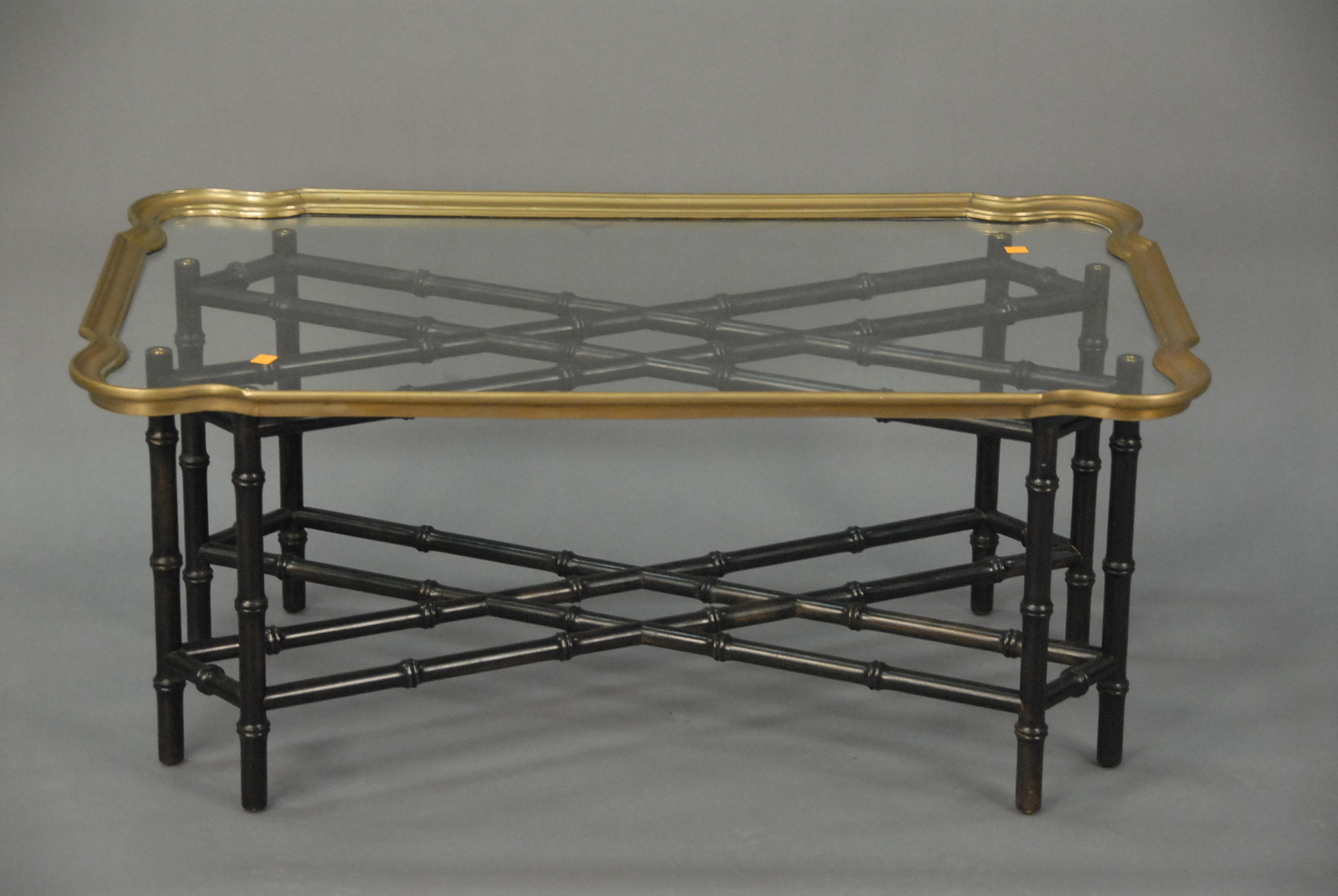 Glass top coffee table with brass trim and bamboo turned base, top: 23 1/2 x 39.