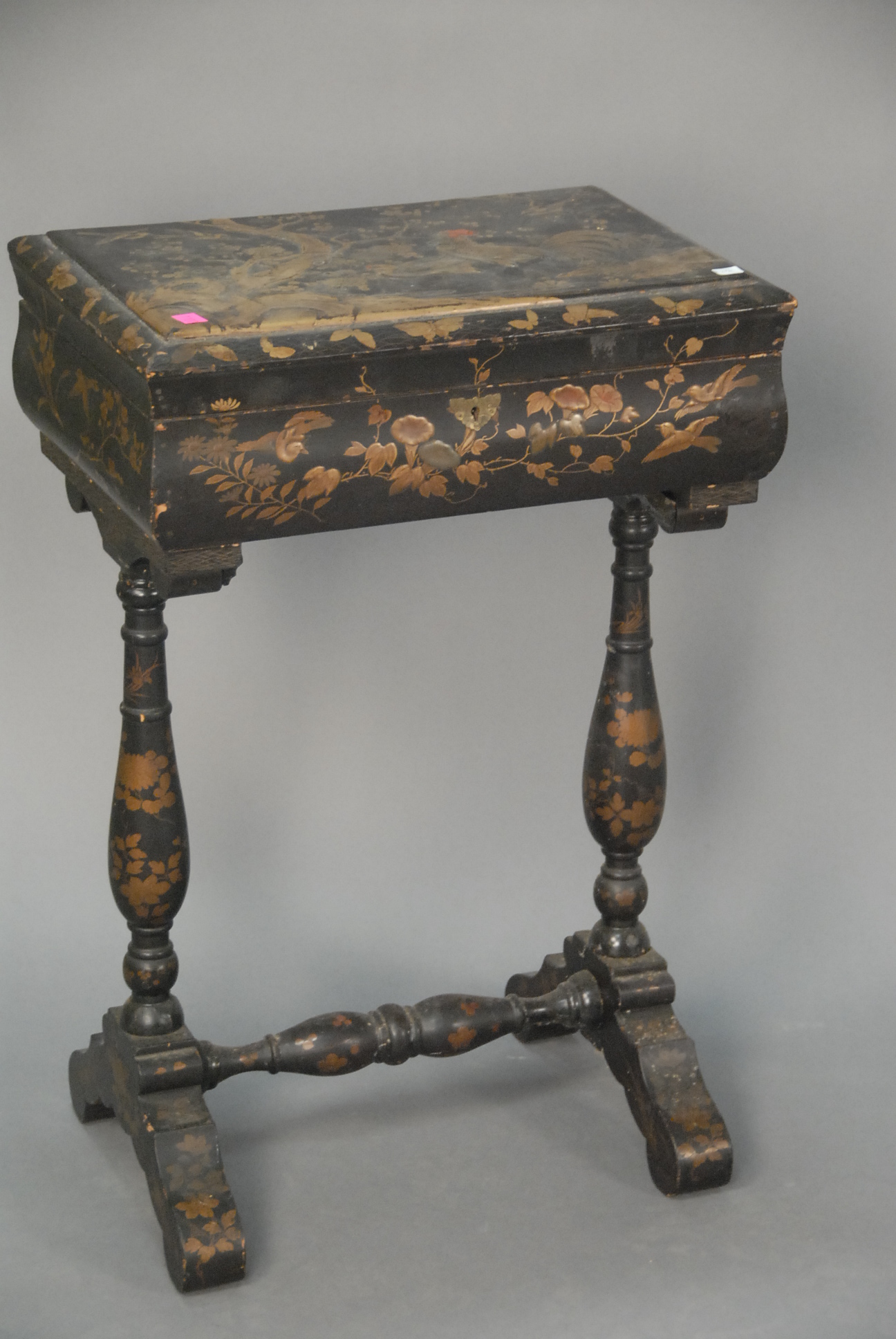 Oriental black lacquered and gold decorated sewing stand, ht. 27 1/2.