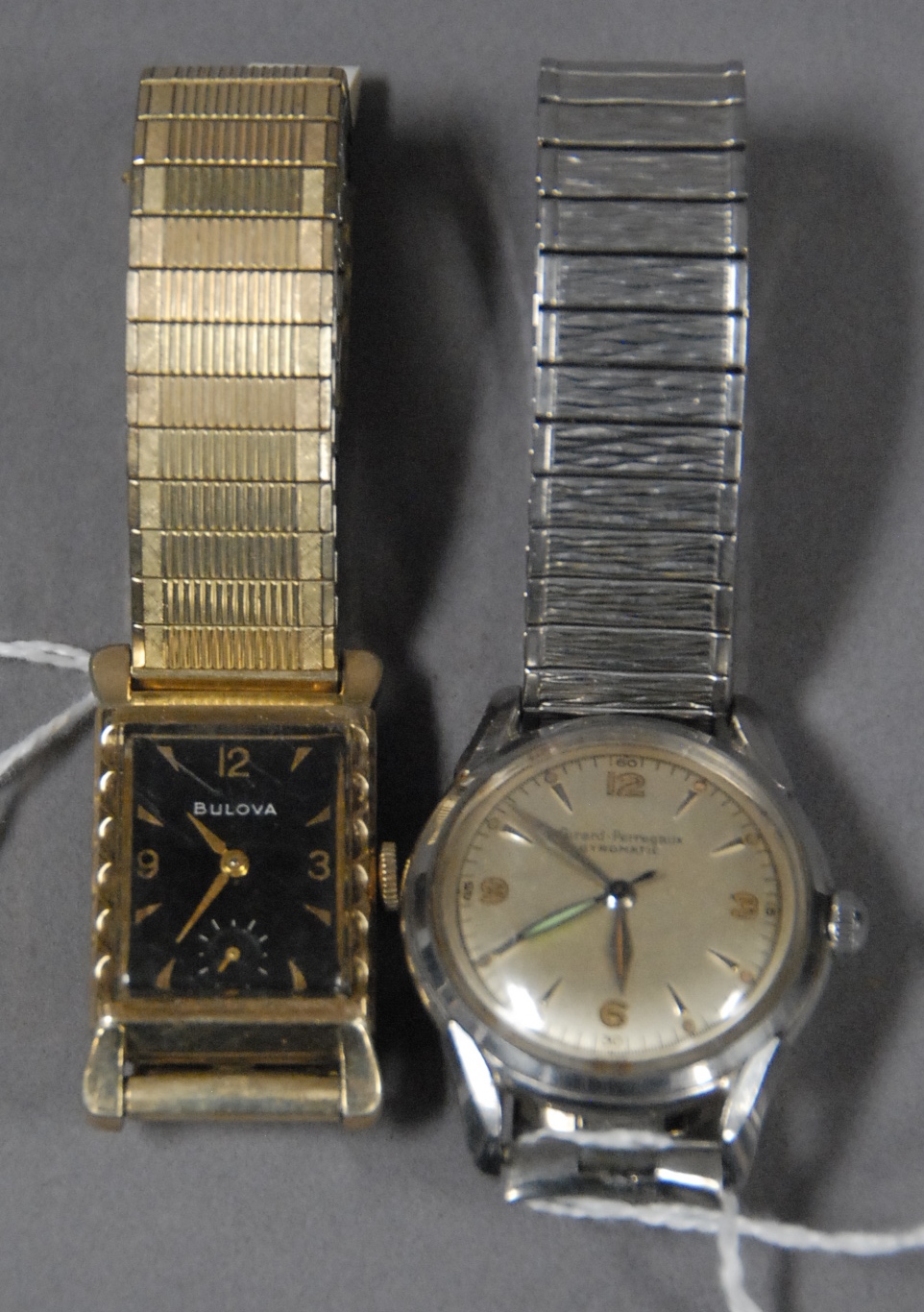 Two watches to include Bulova scalloped edge man’s wristwatch and Gerard Perregaux gyromatic man’s wristwatch.