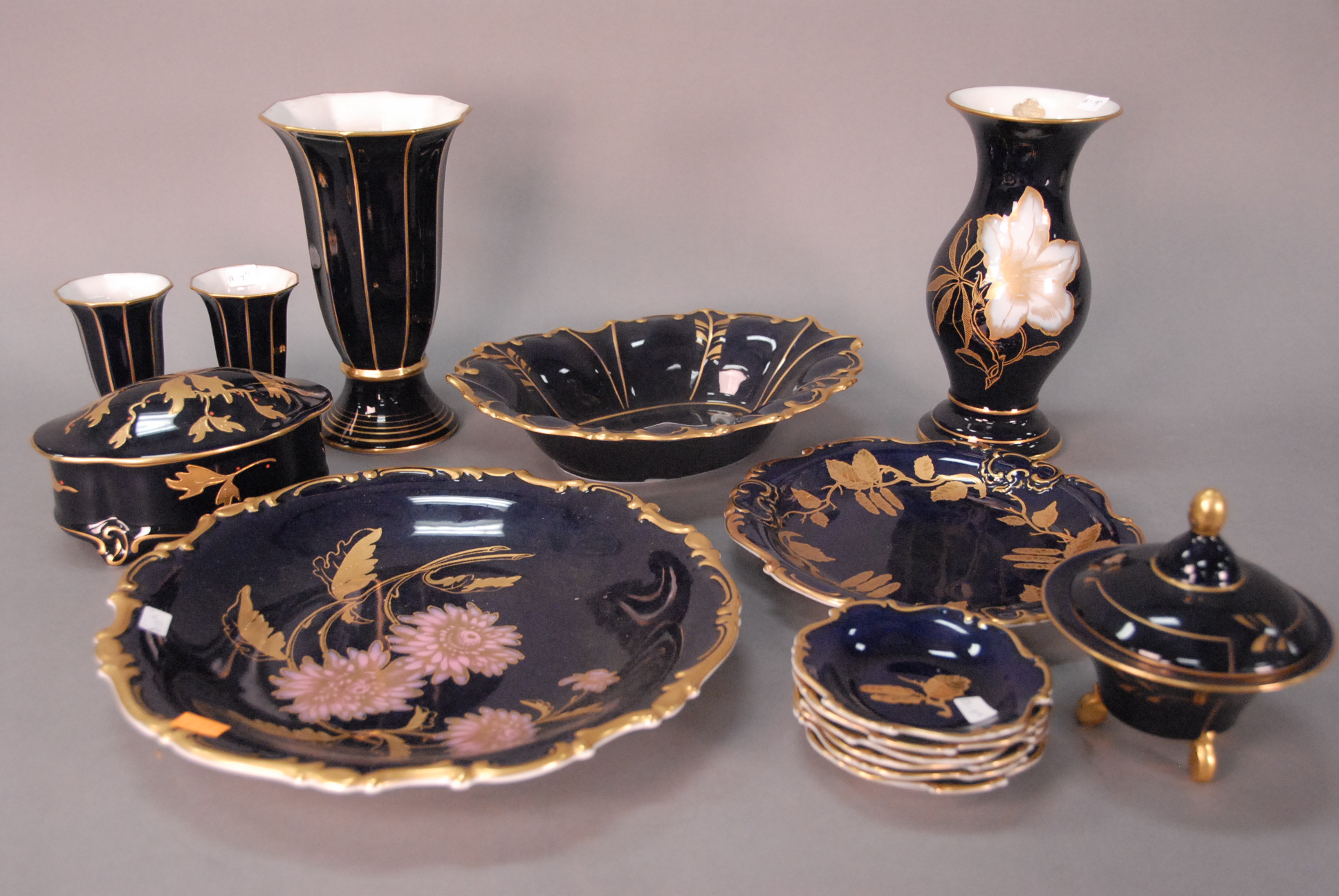 Group of fifteen pieces of Jlmenau von Henneberg Echt Kobalt, and Dresden Baensch Lettin vases, plates, bowls, boxes, etc.