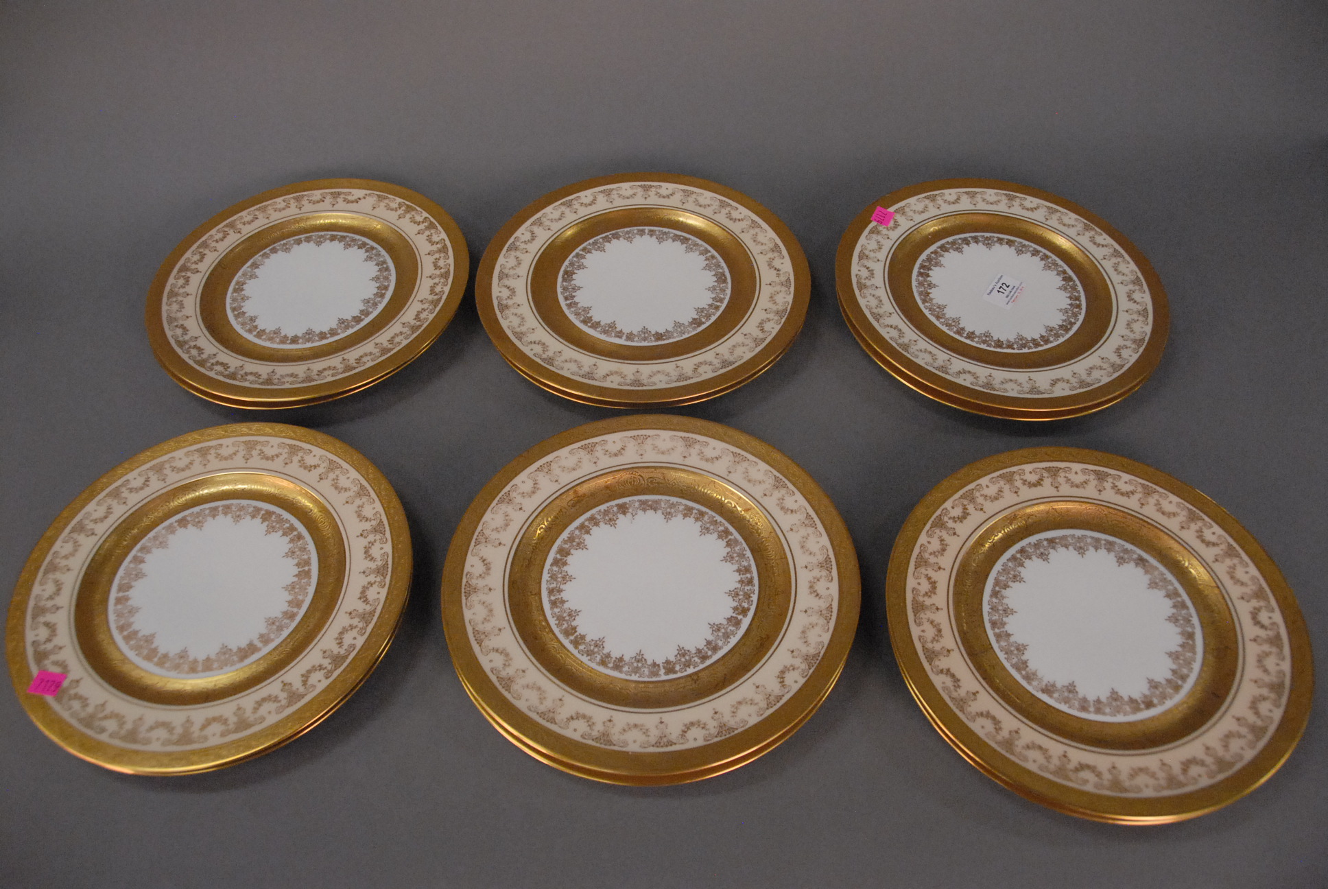 Set of Twelve Heinrich Bavaria plates with gilt gold and ivory borders around gilt gold and white centers, dia. 11in.