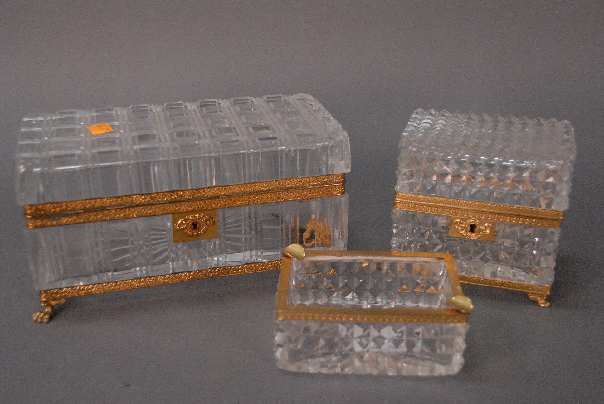 Three piece group to include two crystal covered boxes, one marked made in France, and a crystal ashtray.