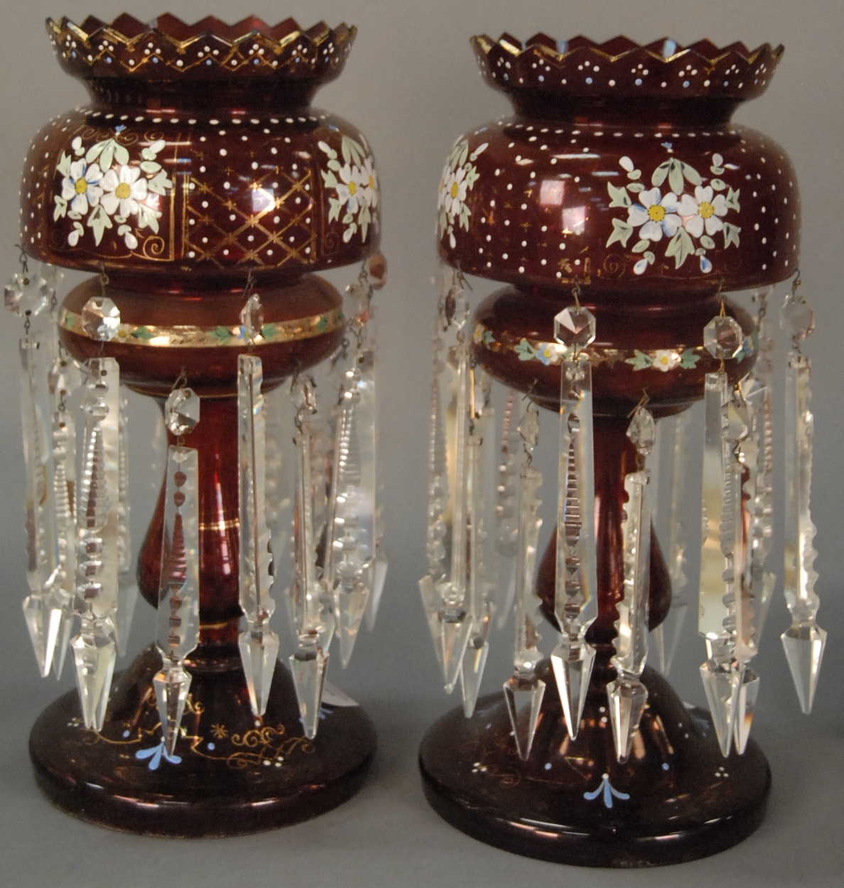 Pair of ruby glass girandoles with enameled flowers and double layer of prisms, ht. 13 1/2in.