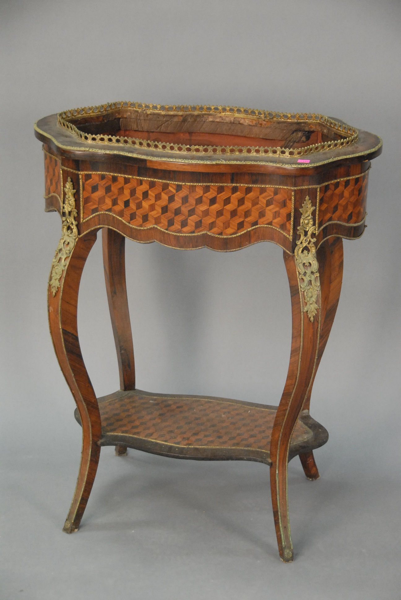 French style parquetry inlaid plant stand, ht. 31in. wd. 25 1/2in.