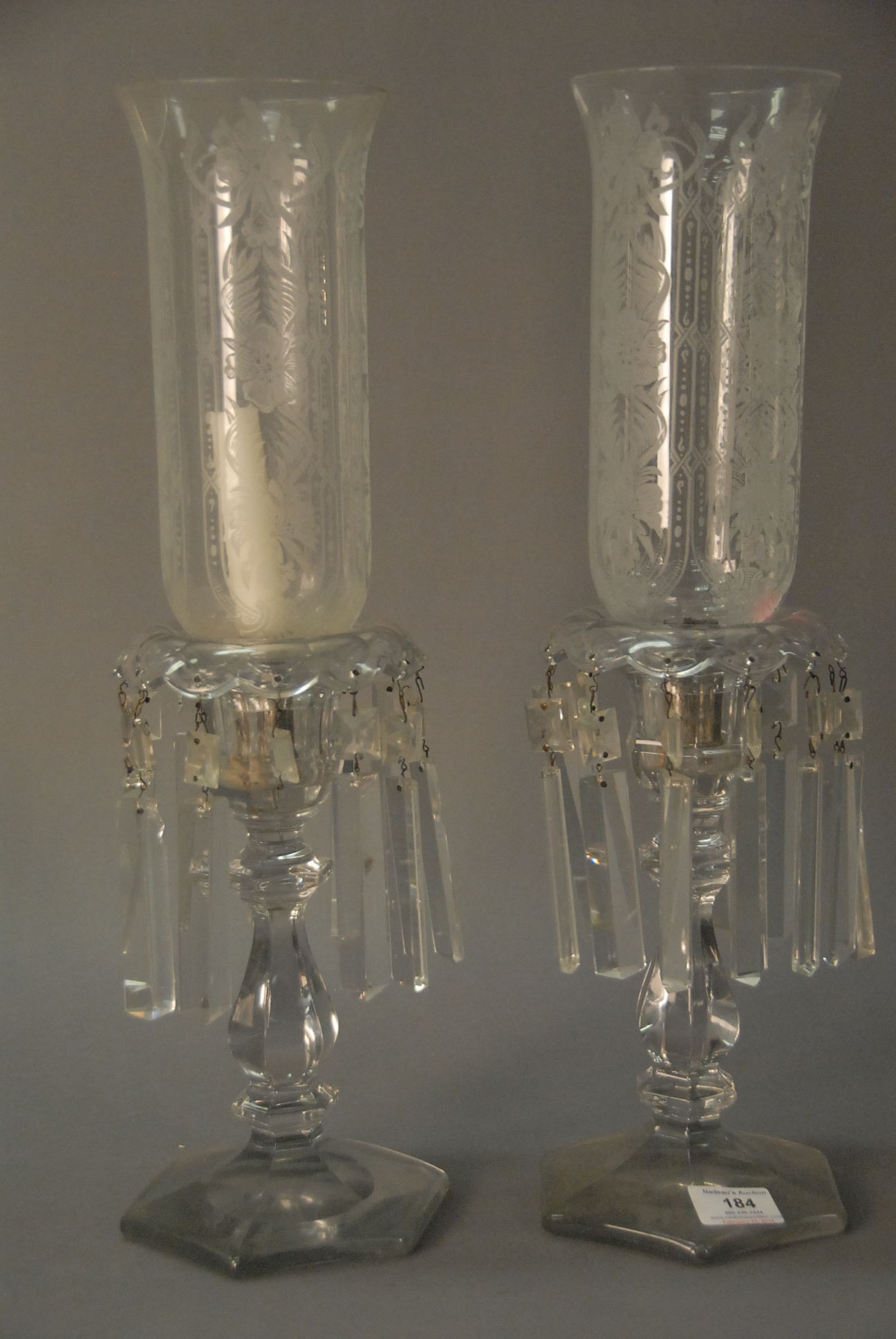 Pair of crystal glass candlesticks with hurricane shades and prisms, ht. 20in.