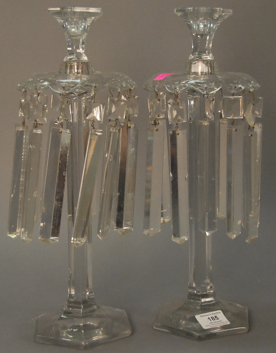 Tall pair of crystal glass candlesticks with prisms, ht. 16in.