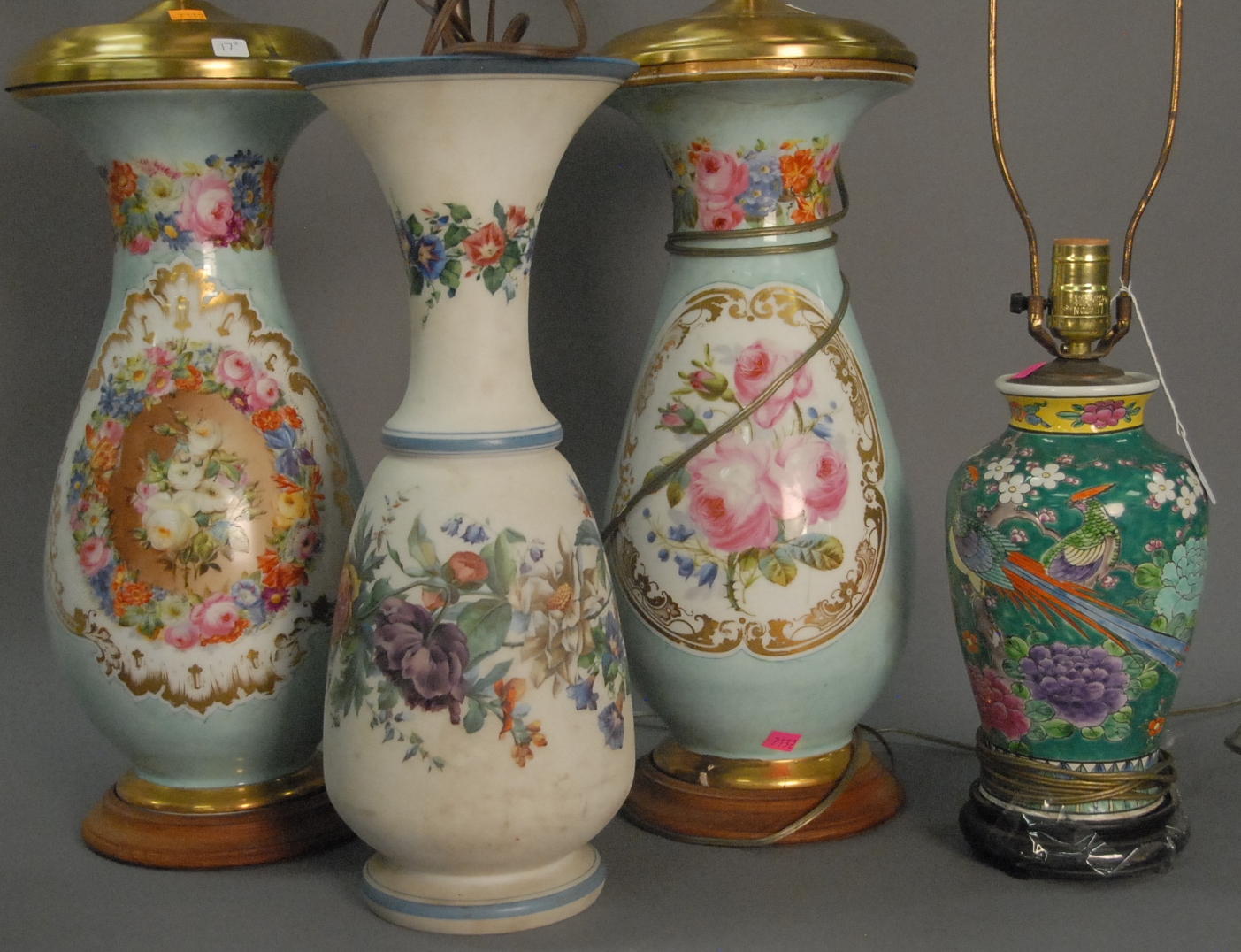 Group of three large vases made into table lamps along with Oriental style lamp.