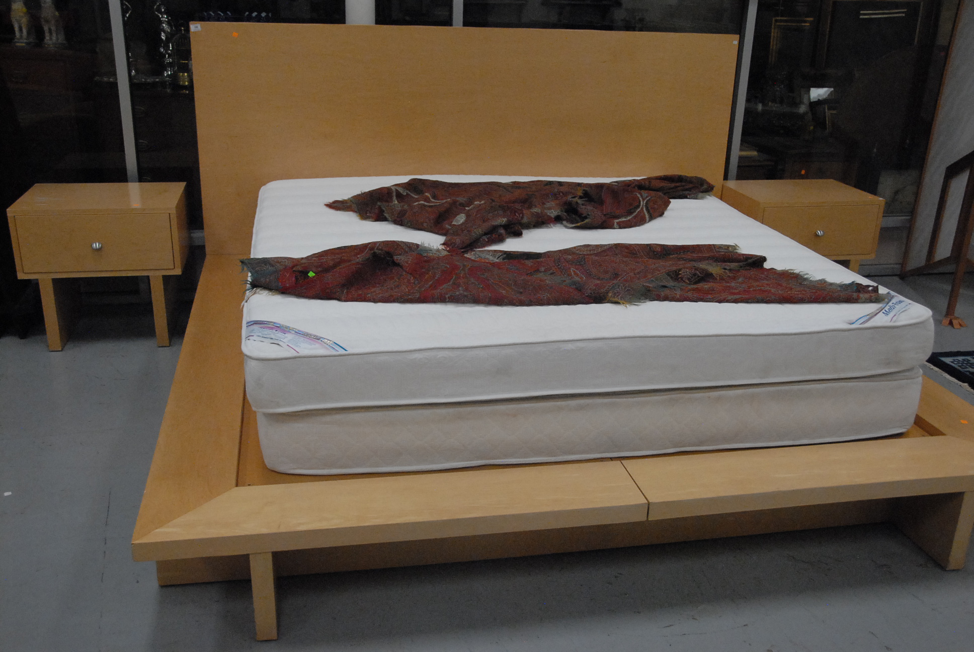 Contemporary bed and pair of end tables in maple veneer, bed: lg. 92in. wd. 96in. ht. 51in., tables: ht. 24in. top: 18 x 25.
