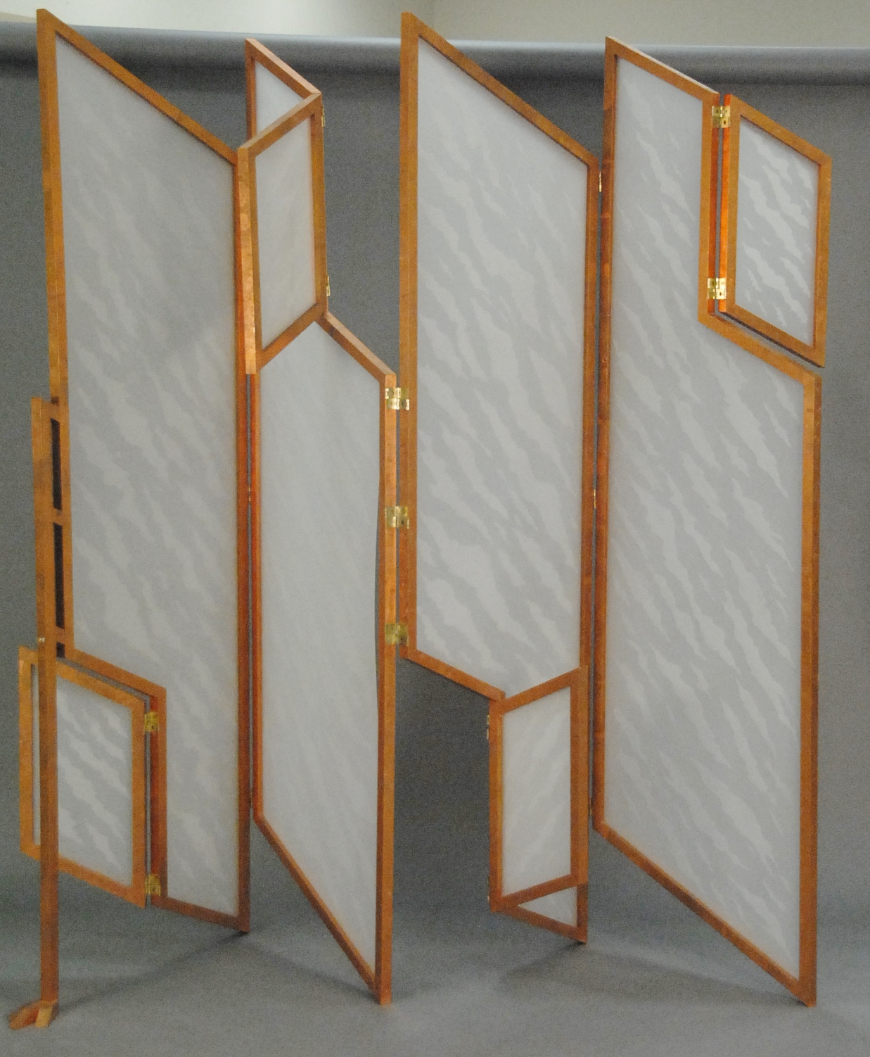 Angular geometric screen with gilded copper frame and jagged four section folding screen with patterned translucent Mylar panels, ht. 90in. wd. 104in. each panel wd. 26in.