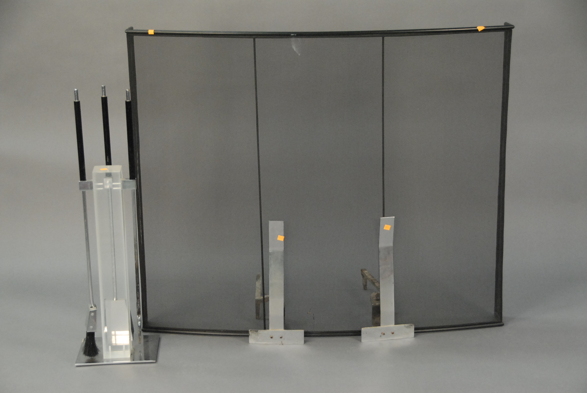 Neo Deco Lucite and chrome fireplace set to include three piece stand, log holder, andirons, and mesh screen, very good condition. Screen: ht. 41in. wd. 49in.