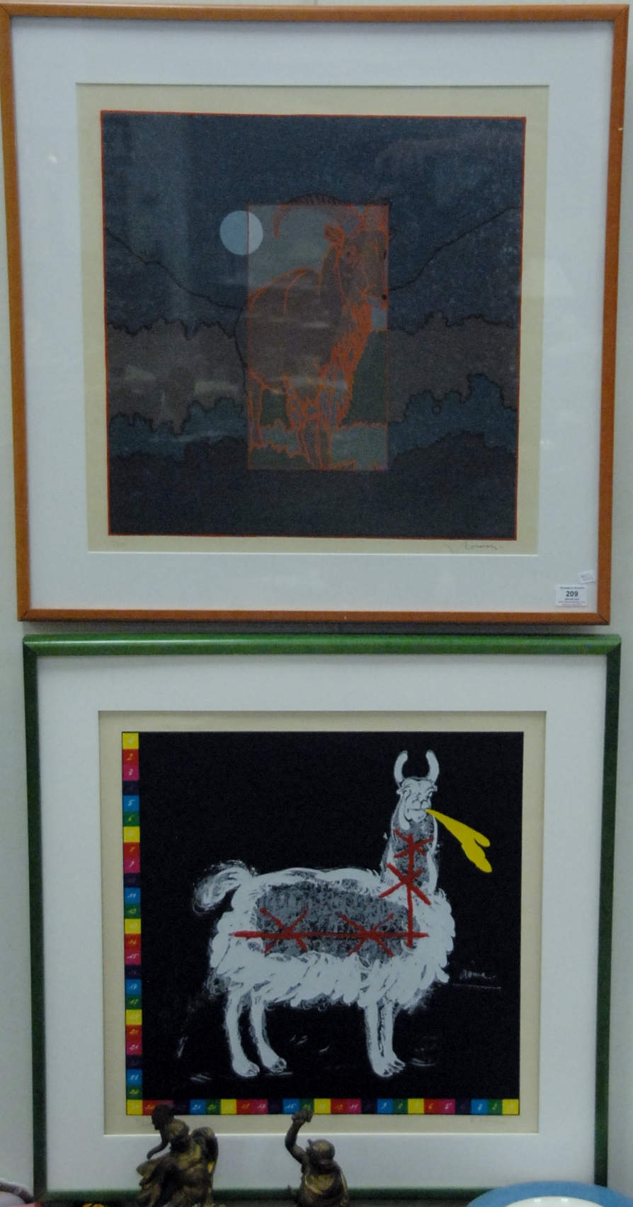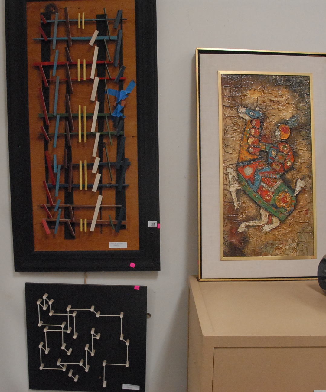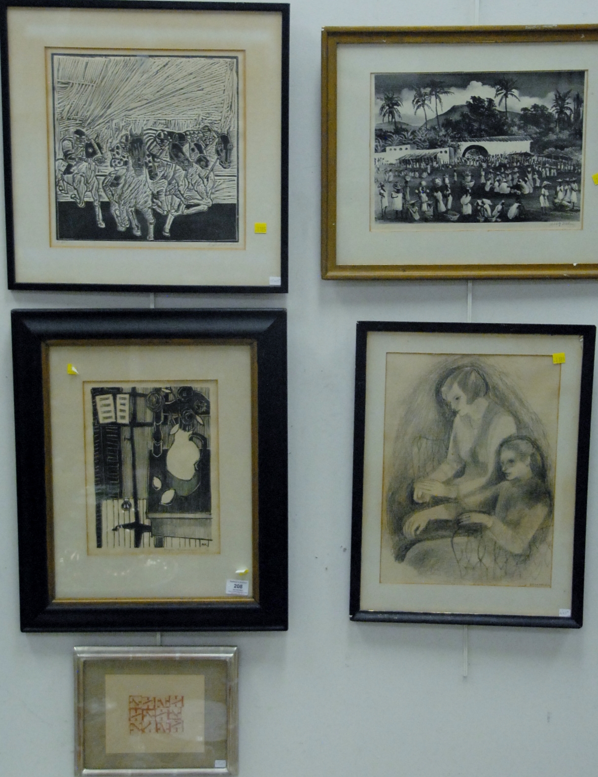 Five framed pieces to include Edward Joscelyn Brandford 1905 pencil signed drawing, African pencil signed print, Marjorie Knochenhauer 51′ print, wood block of horses signed indistinctly, and framed collage Mayan by Barry Cohen.