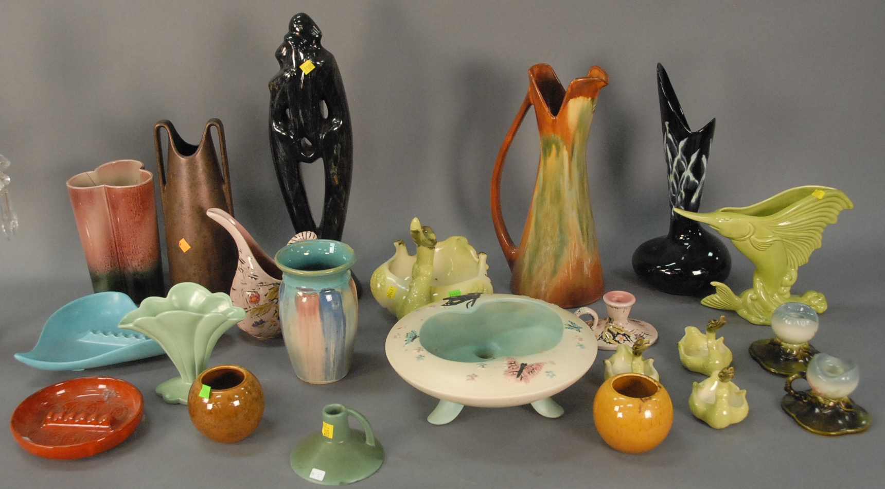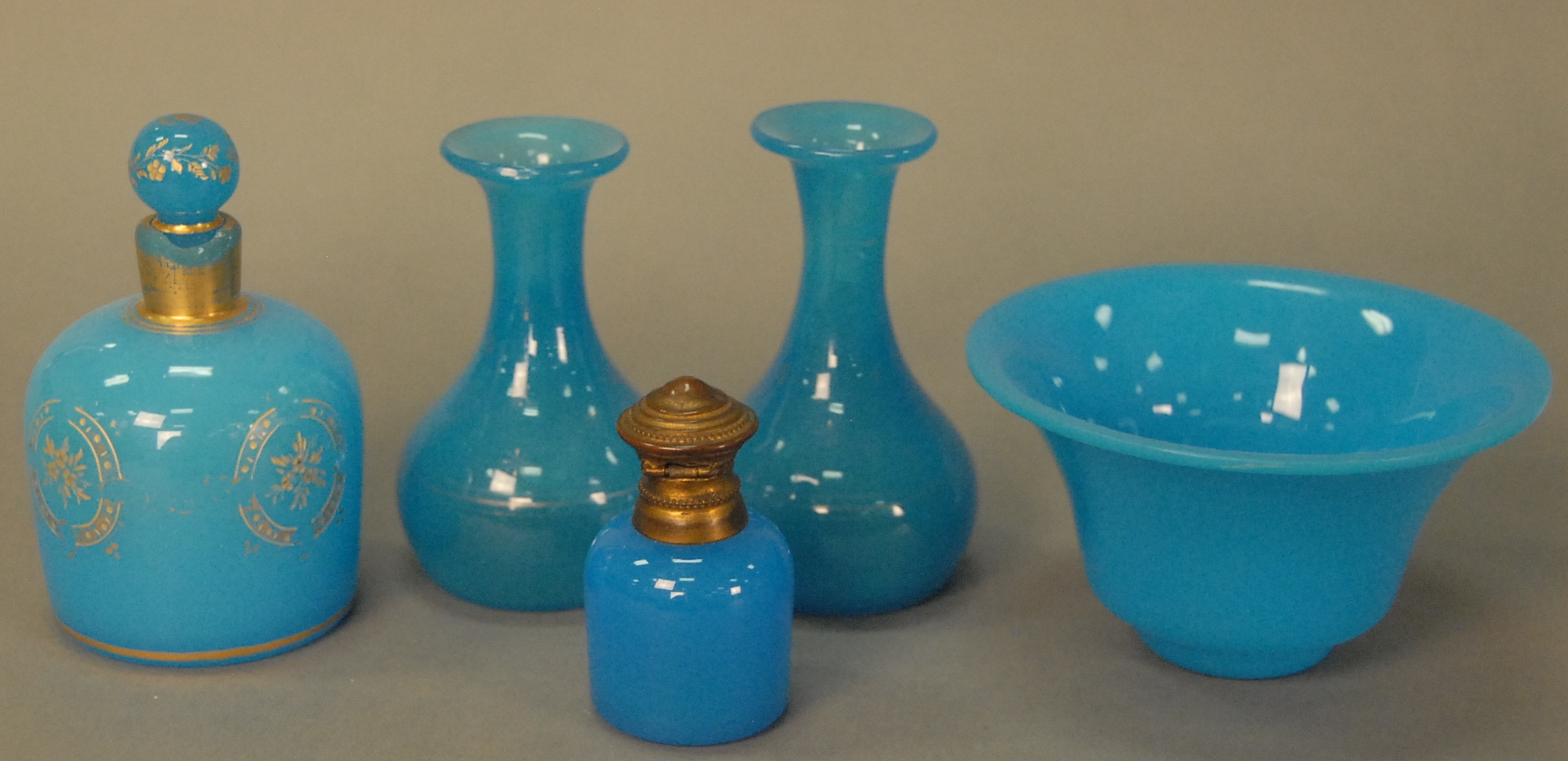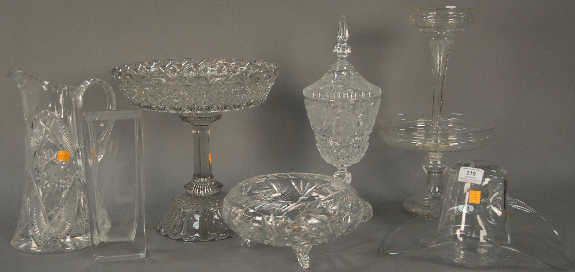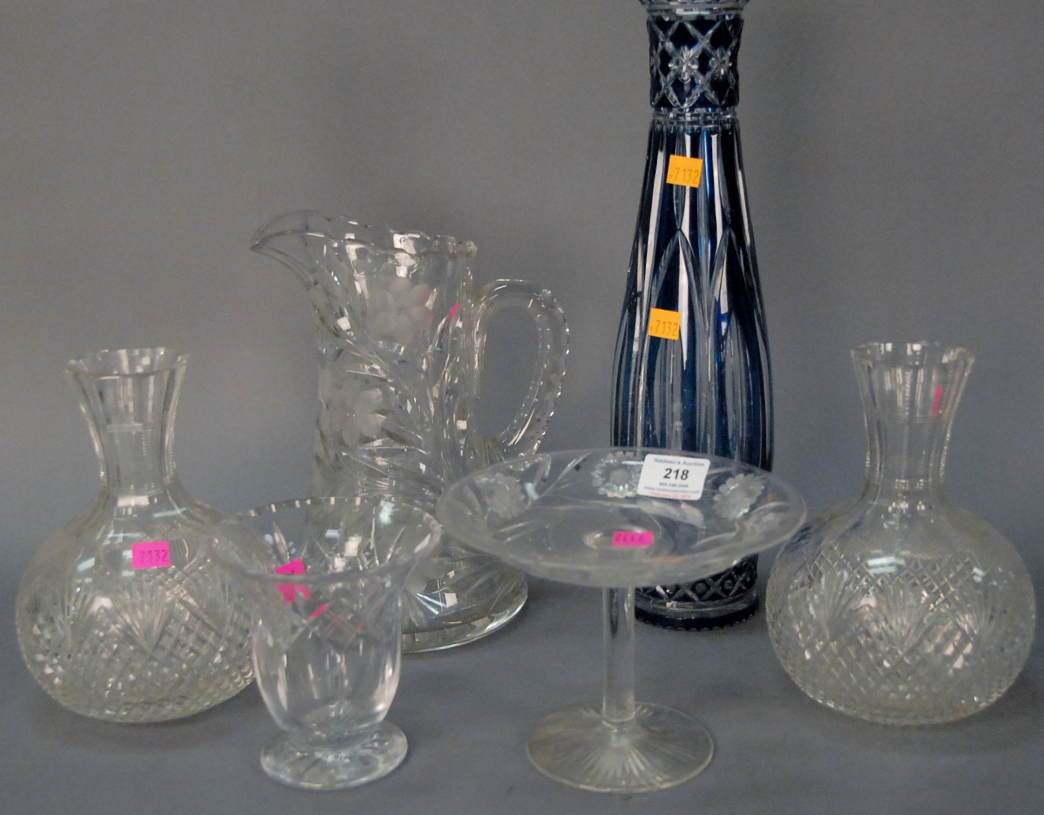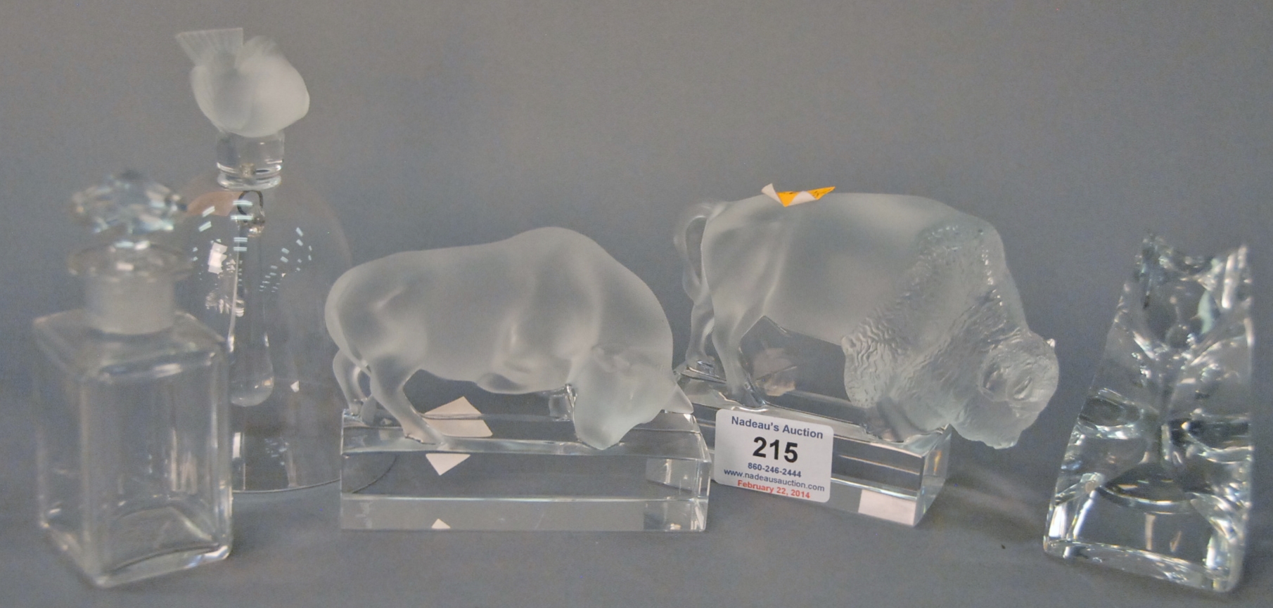 Group of five pieces of crystal to include three Lalique pieces, a bull, buffalo, and bird bell, a St. Louis owl, and a Baccarat bottle. 3 1/2in. to 5in.