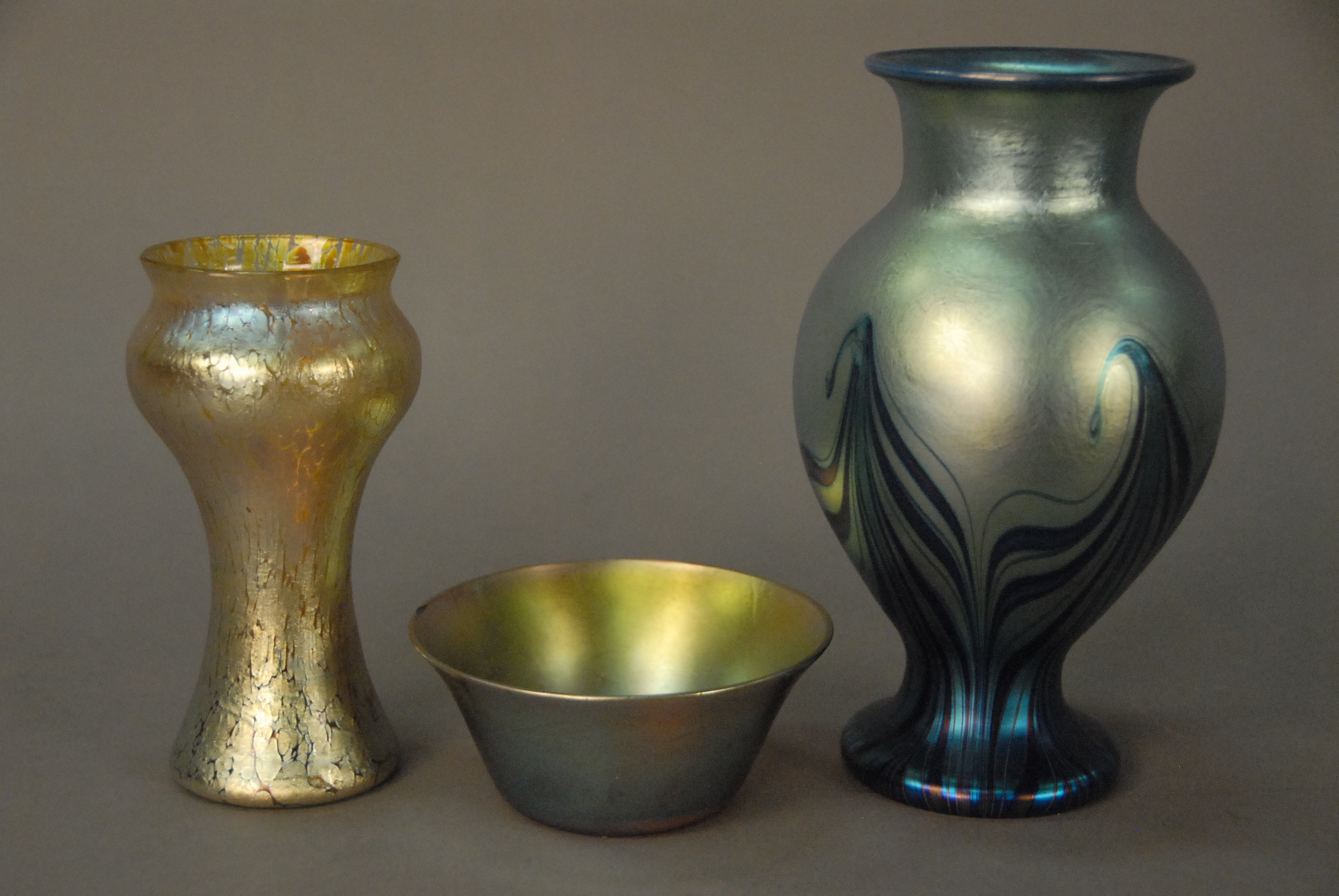 Three art glass pieces to include Orient & Flume vase ht. 7 1/2in., Tiffany small bowl signed LCT small chip ht. 2in., and a small irredescent vase ht. 5 1/2in.