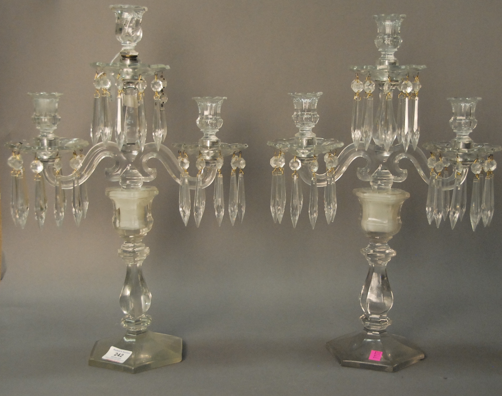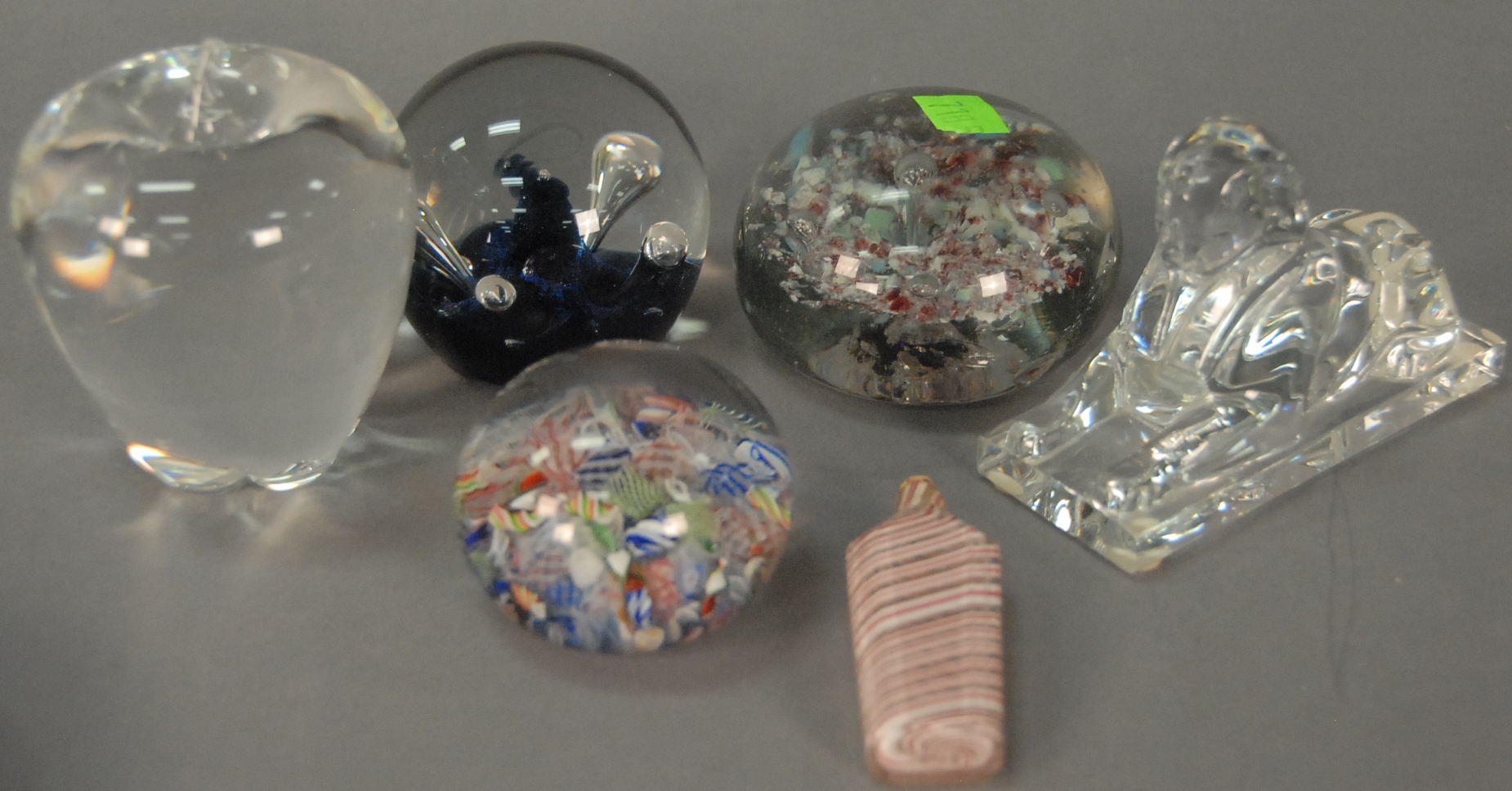 Six glass pieces to include Millefiori paperweight, Baccarat figure, Moonflower paperweight, Steuben apple, twist art glass perfume, and early paperweight.