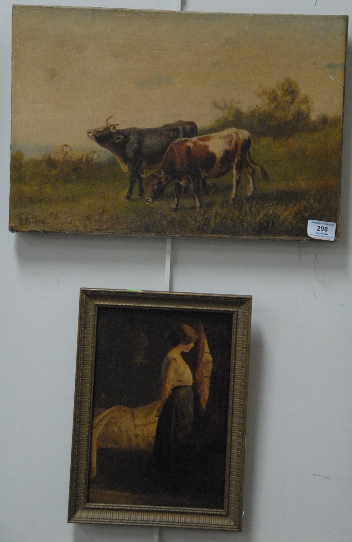 Two piece lot to include Giuseppe Milone 19th Century oil on canvas grazing animals signed lower left G. Milone 12 x 18, restretched and relined and an unsigned oil on board of a girl 10 1/2 x 7 1/2.