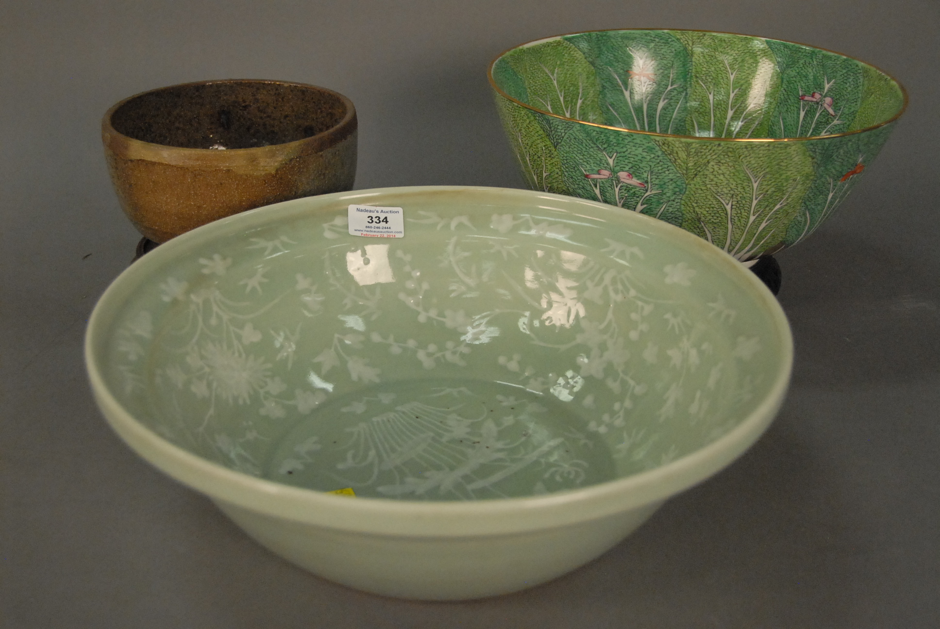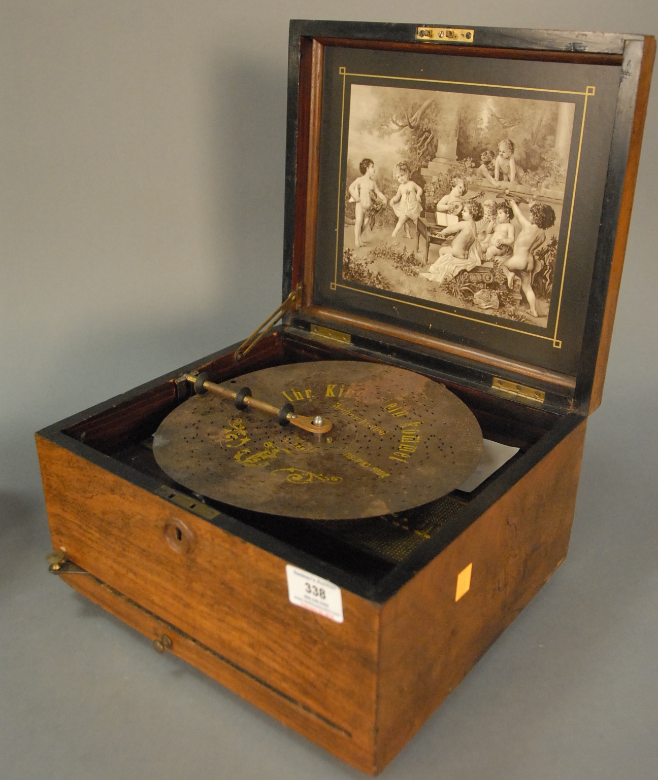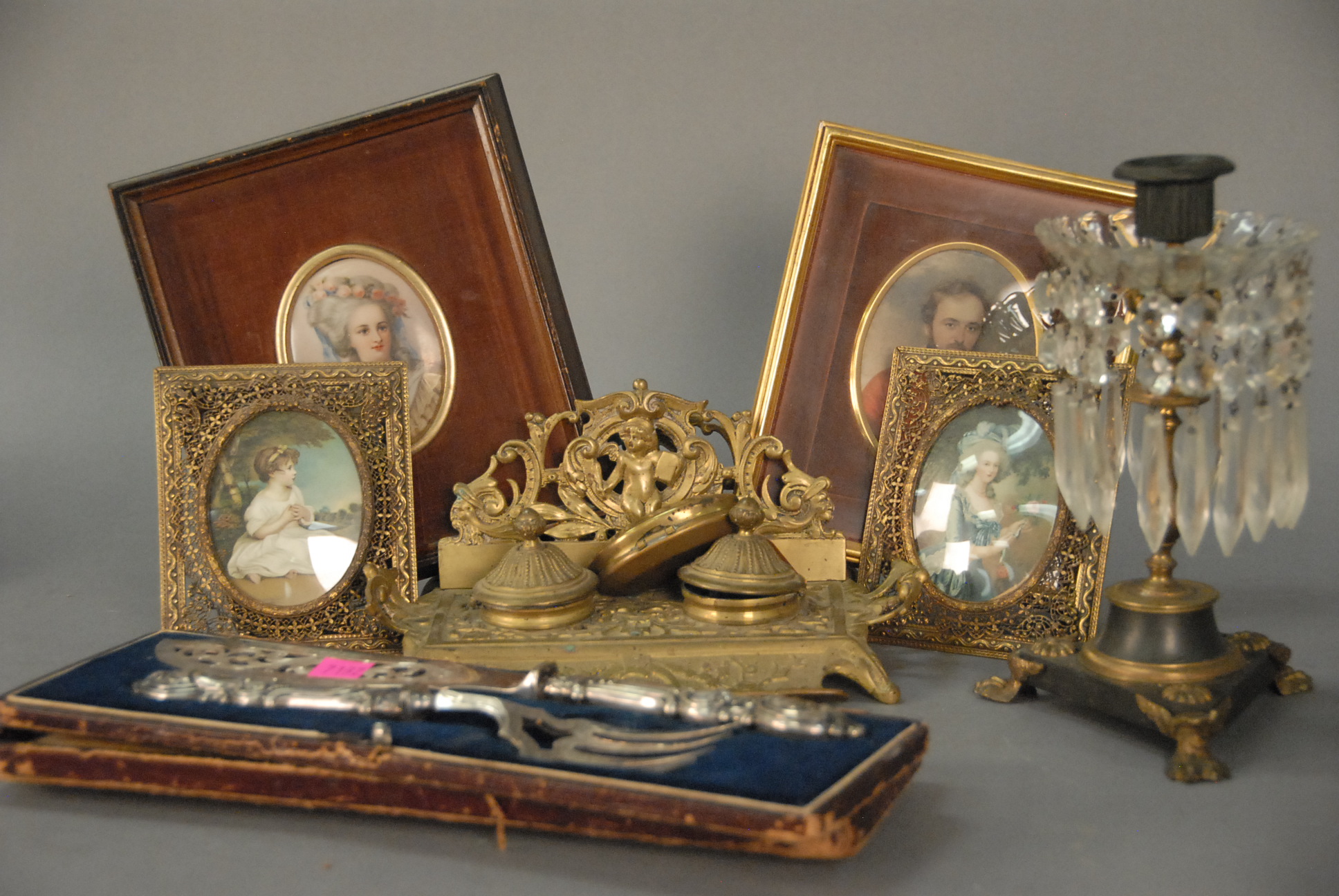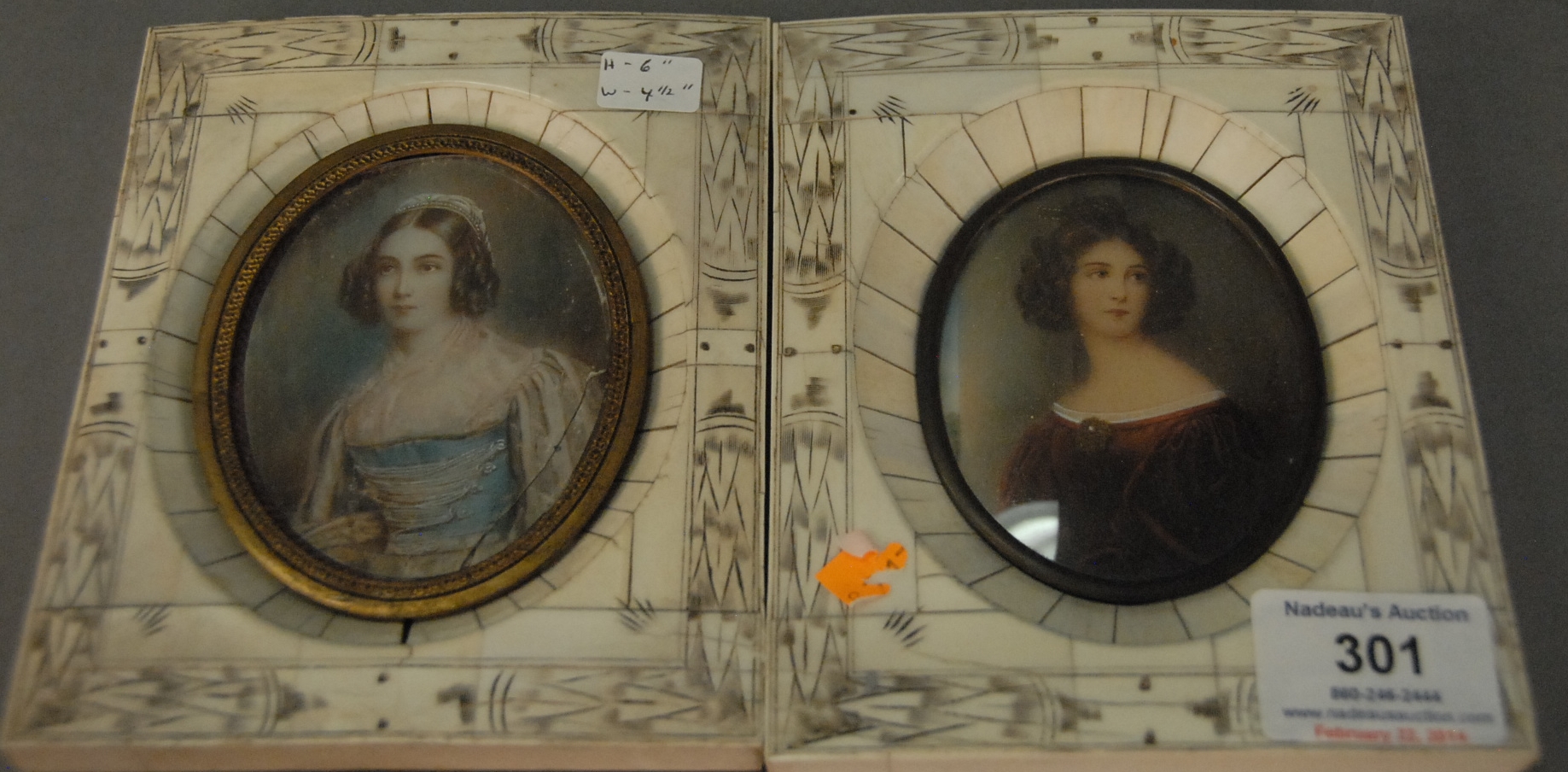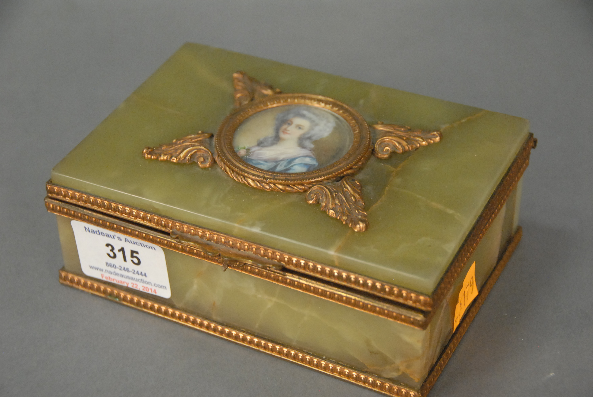 French green alabaster portrait box, brass bound alabaster with circle painting on ivory bust of woman marked made in France on bottom, ht. 2in. lg. 5 1/2in. wd. 4in.