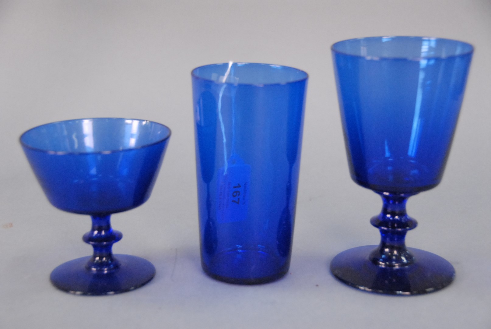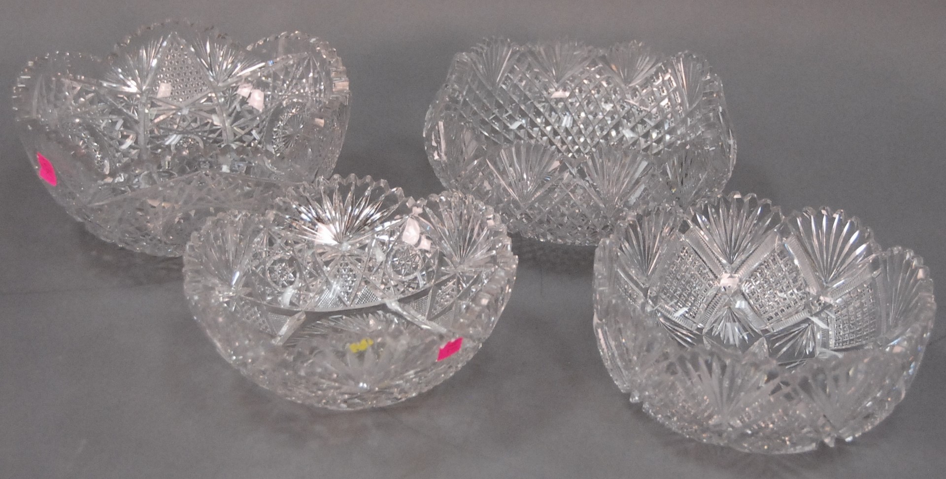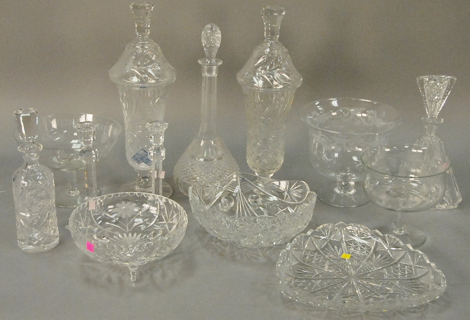 Thirteen crystal serving pieces including three glass compotes, pair of candlesticks, three large bowls, three decanters, and large covered jars.