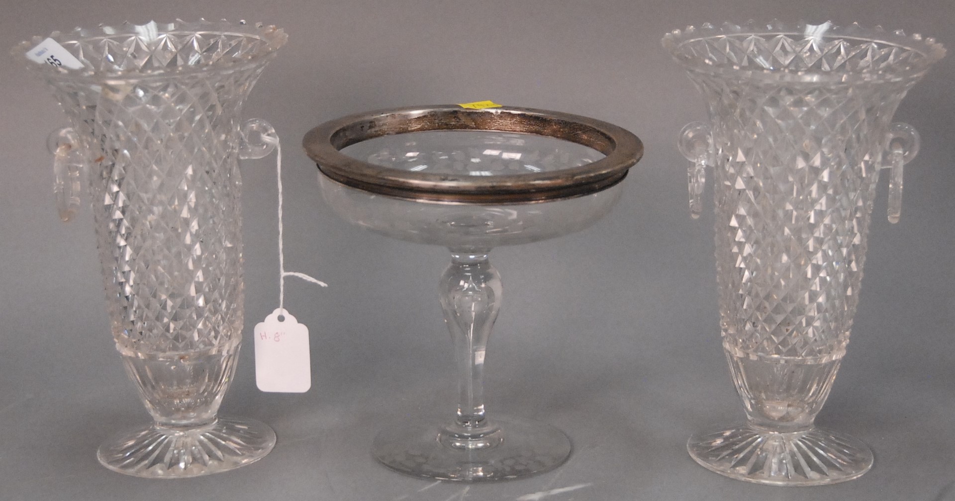 Three piece lot to include a Hawks compote and a pair of cut glass vases with ring handles one ring missing. ht. 8 in.