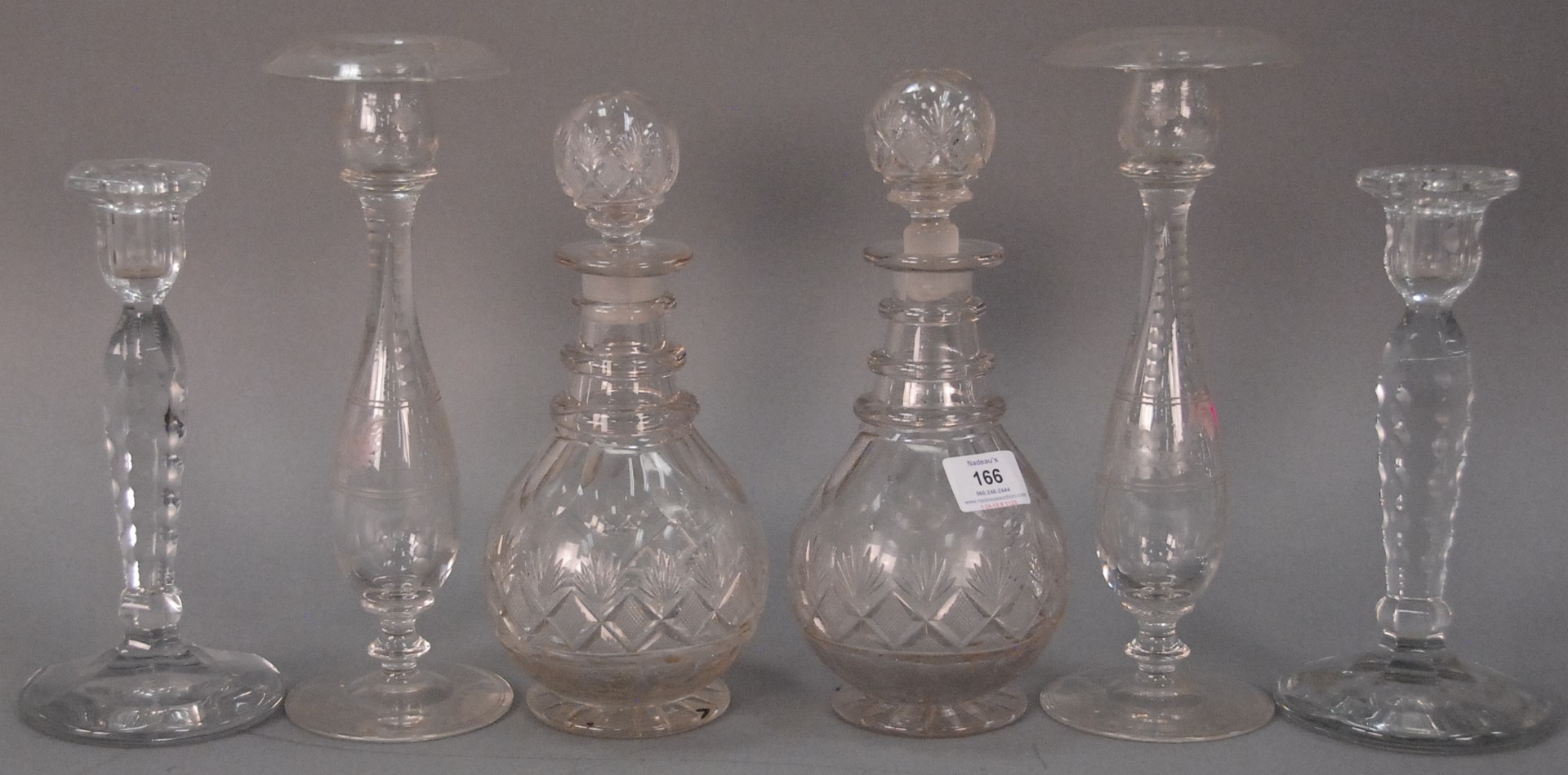 Six crystal pieces to include two pairs of crystal candlesticks and a pair of cut glass decanters.