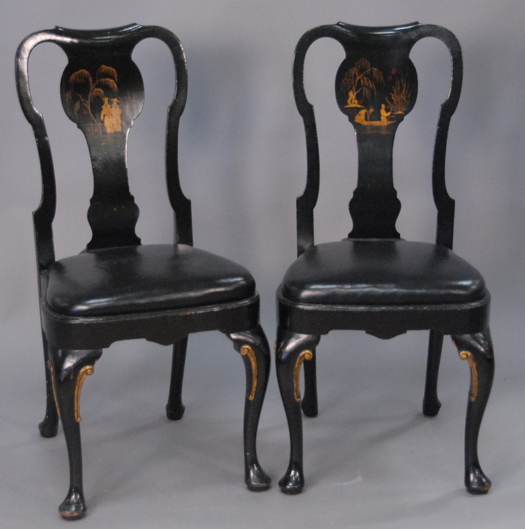 Set of eight oak Queen Anne style dining chairs, chinoiserie decorated with leather upholstered slip seats some paint loss.
